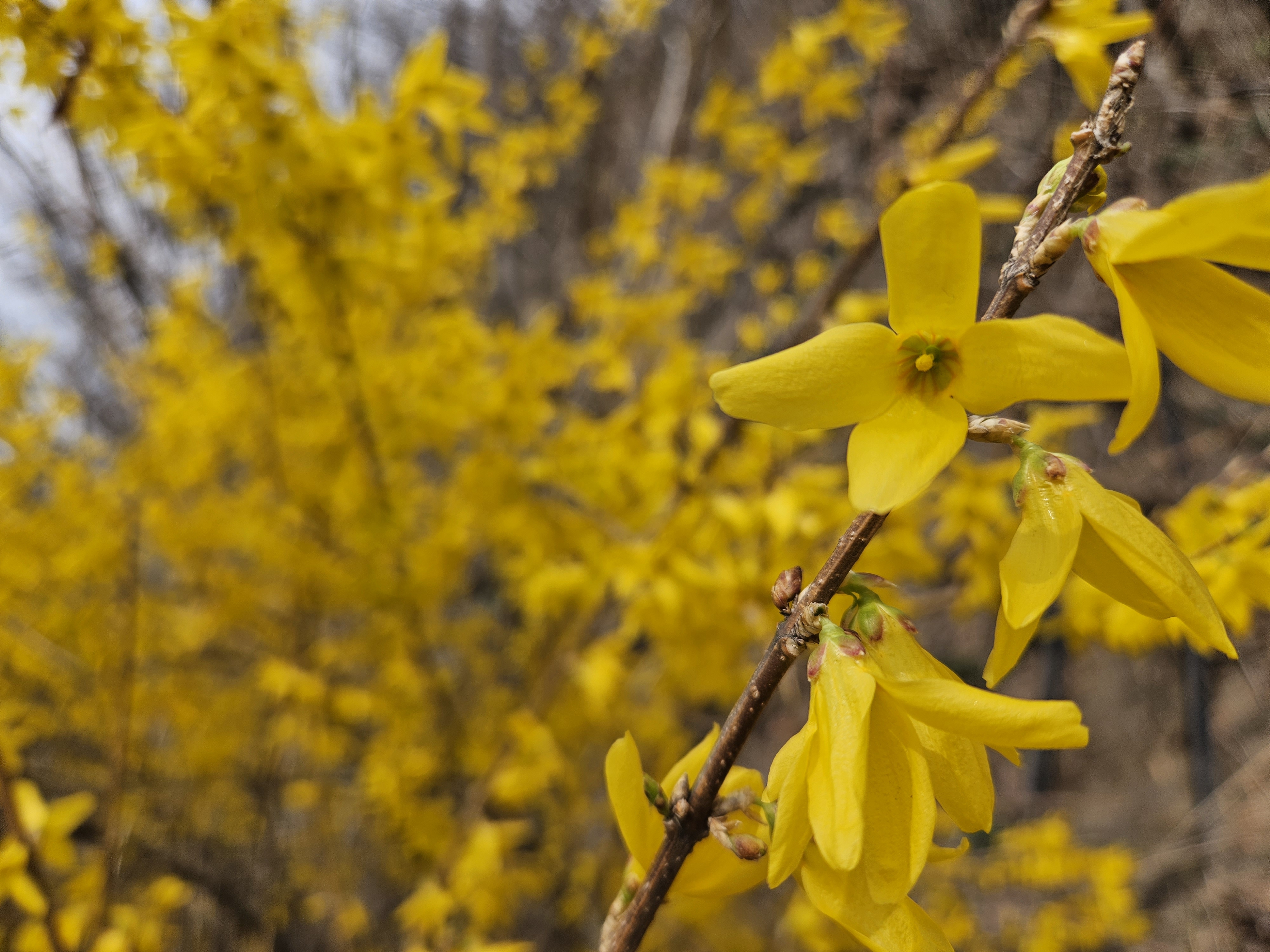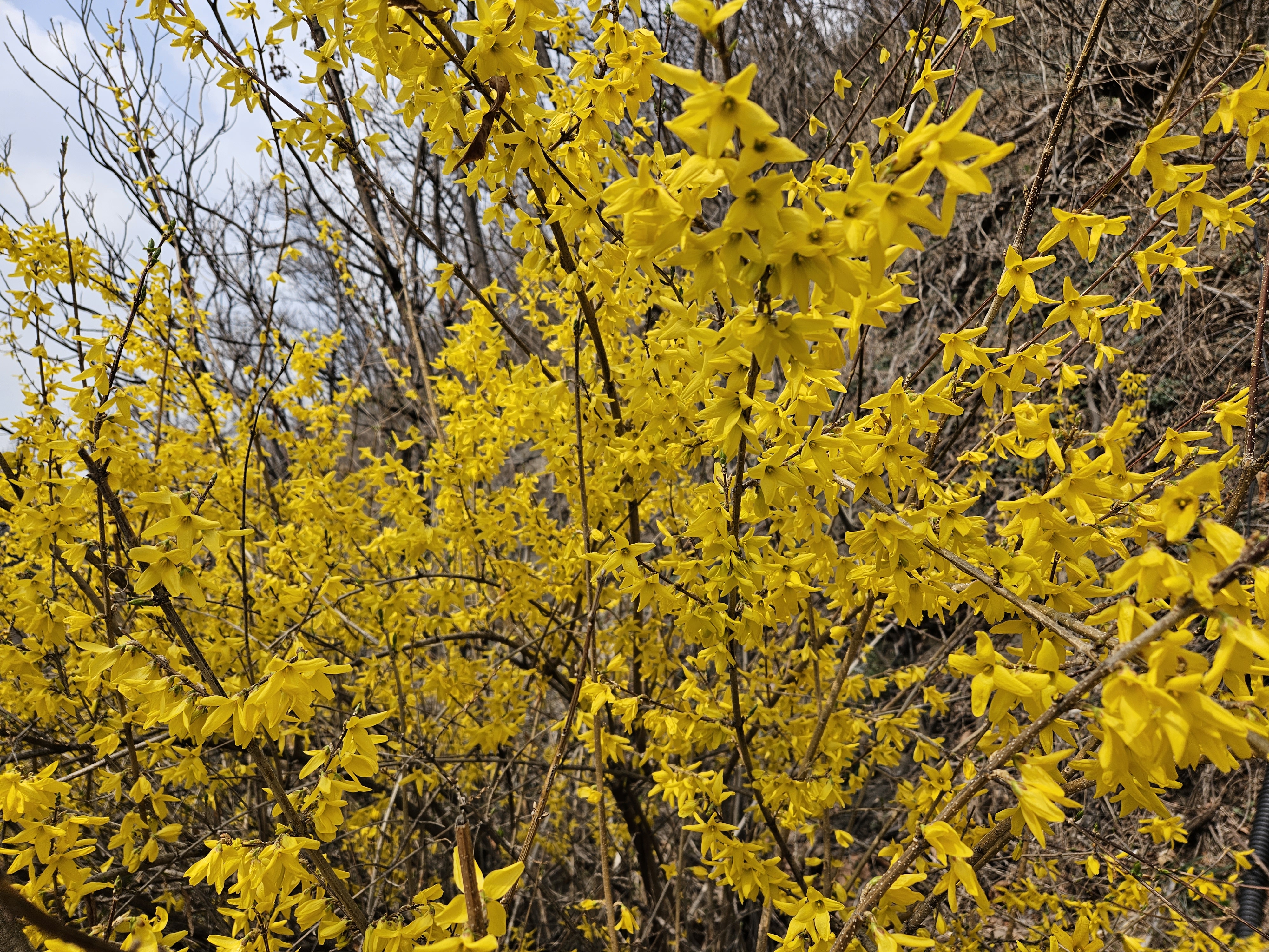 개나리와 진달래 그래고 벛꽃이 어우려지게 피어 노란색과 분홍빛,흰색꽃과 짙은 분홍등의 꽃이 어우러져