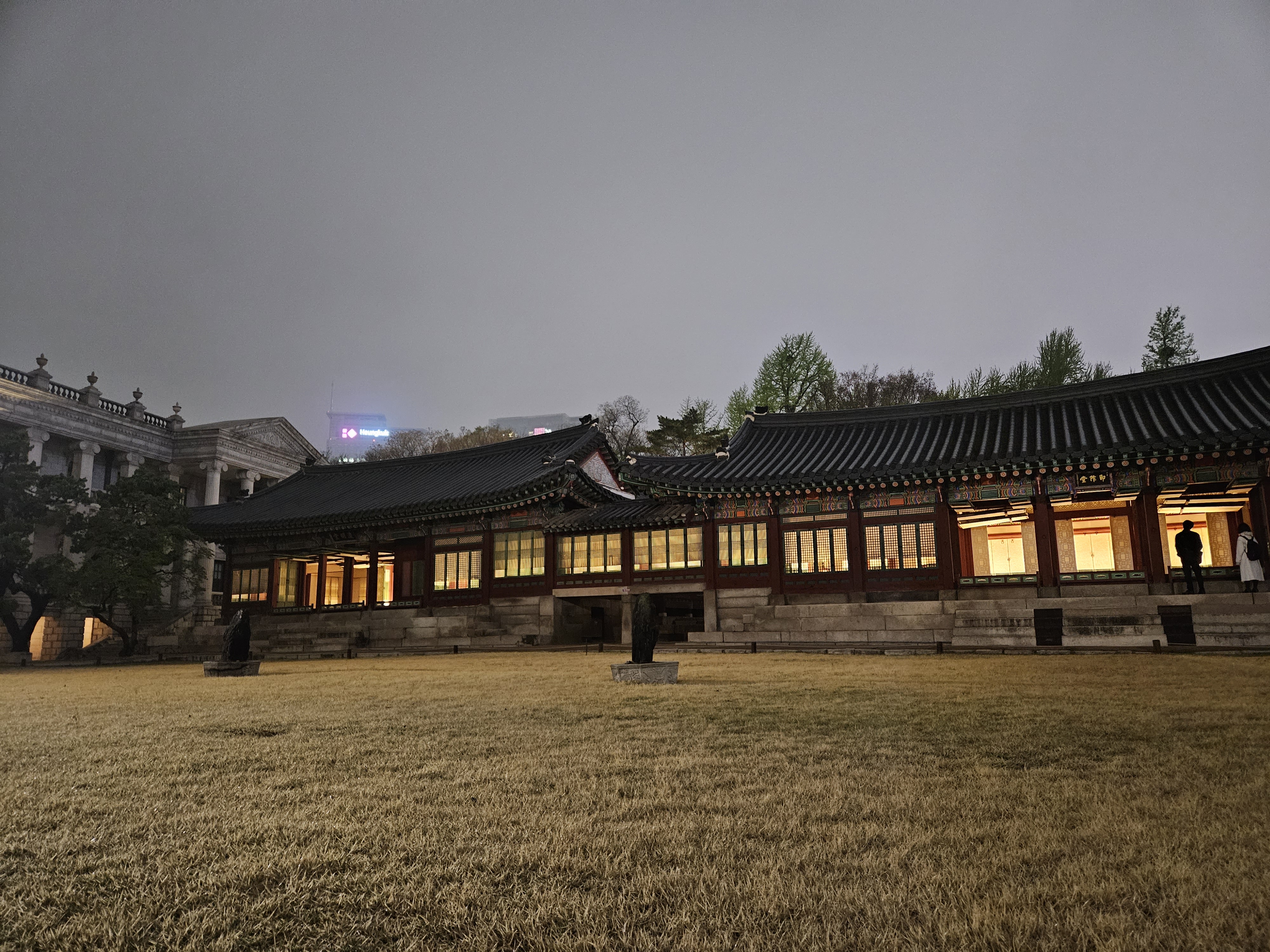 야간의 비내리는 고궁을 거닐고는 한쪽의 벤치에 앉아 차한잔을 마시는 여유를 즐기고는 귀가길에 오른다.