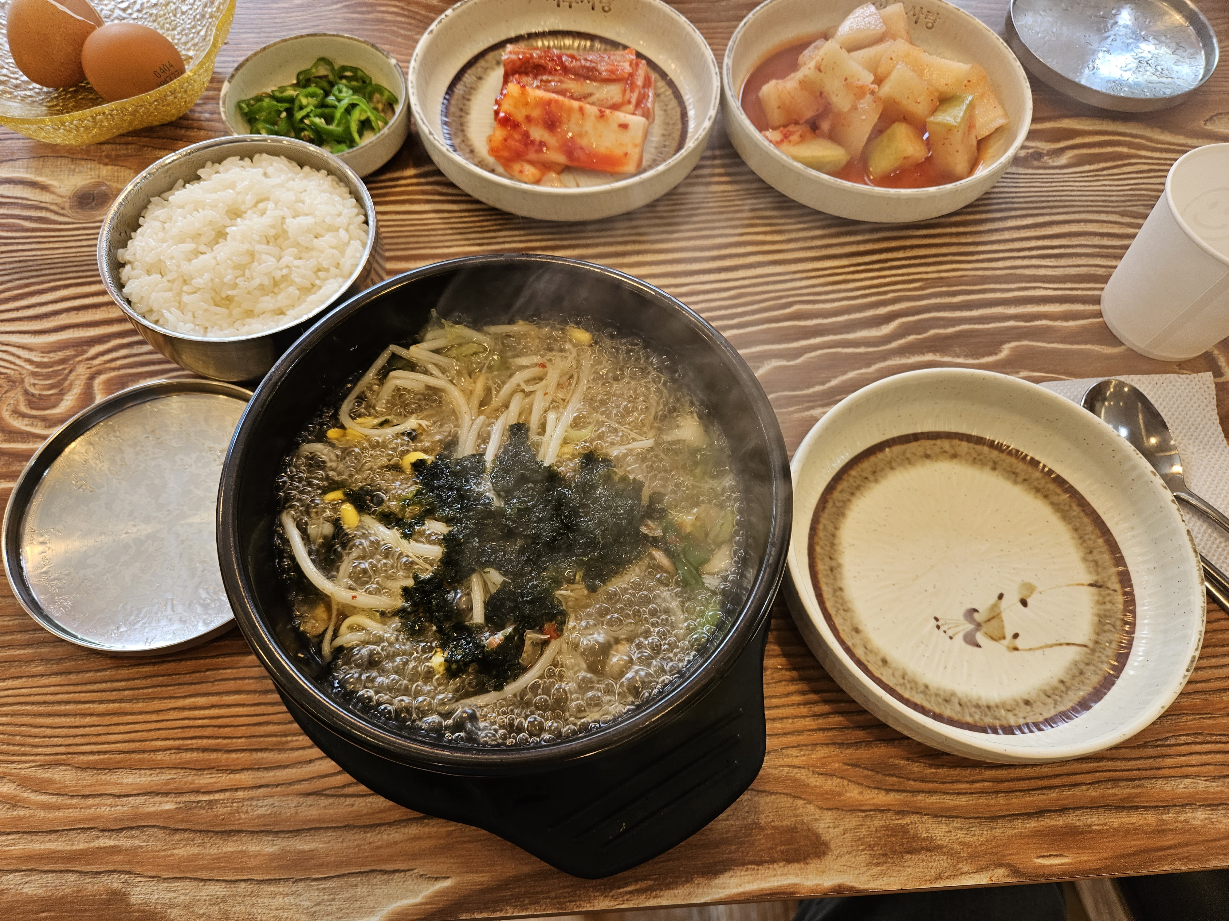 그런다음, 뚝배기에 펄펄 끓는 콩나물해장국이 나오면 계란을 넣고 썰은 고추는 입맛에 따라 추가하여넣고