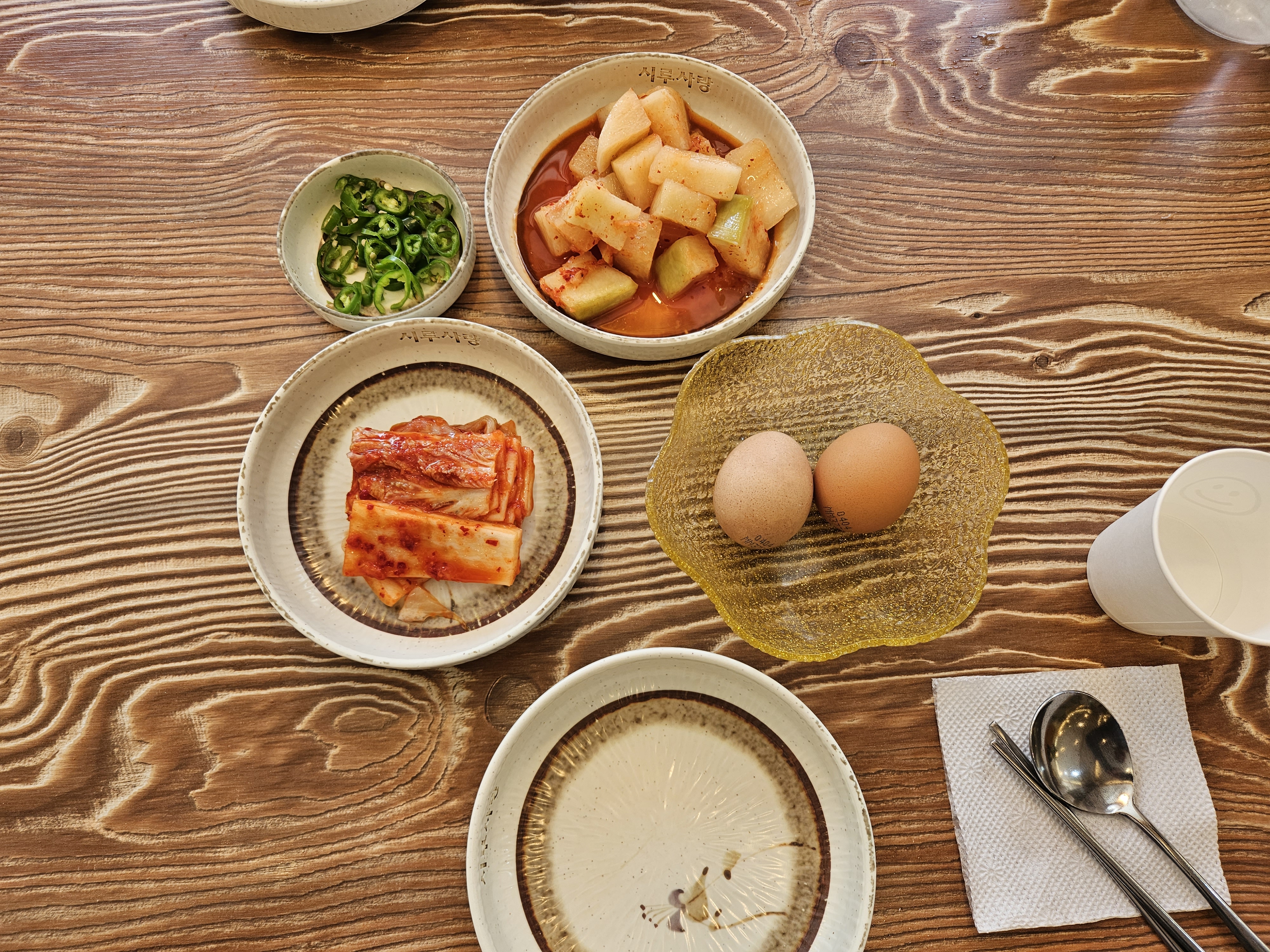 이곳 음식은 정갈하게 반찬 두가지가 계란과 함께 나온다.