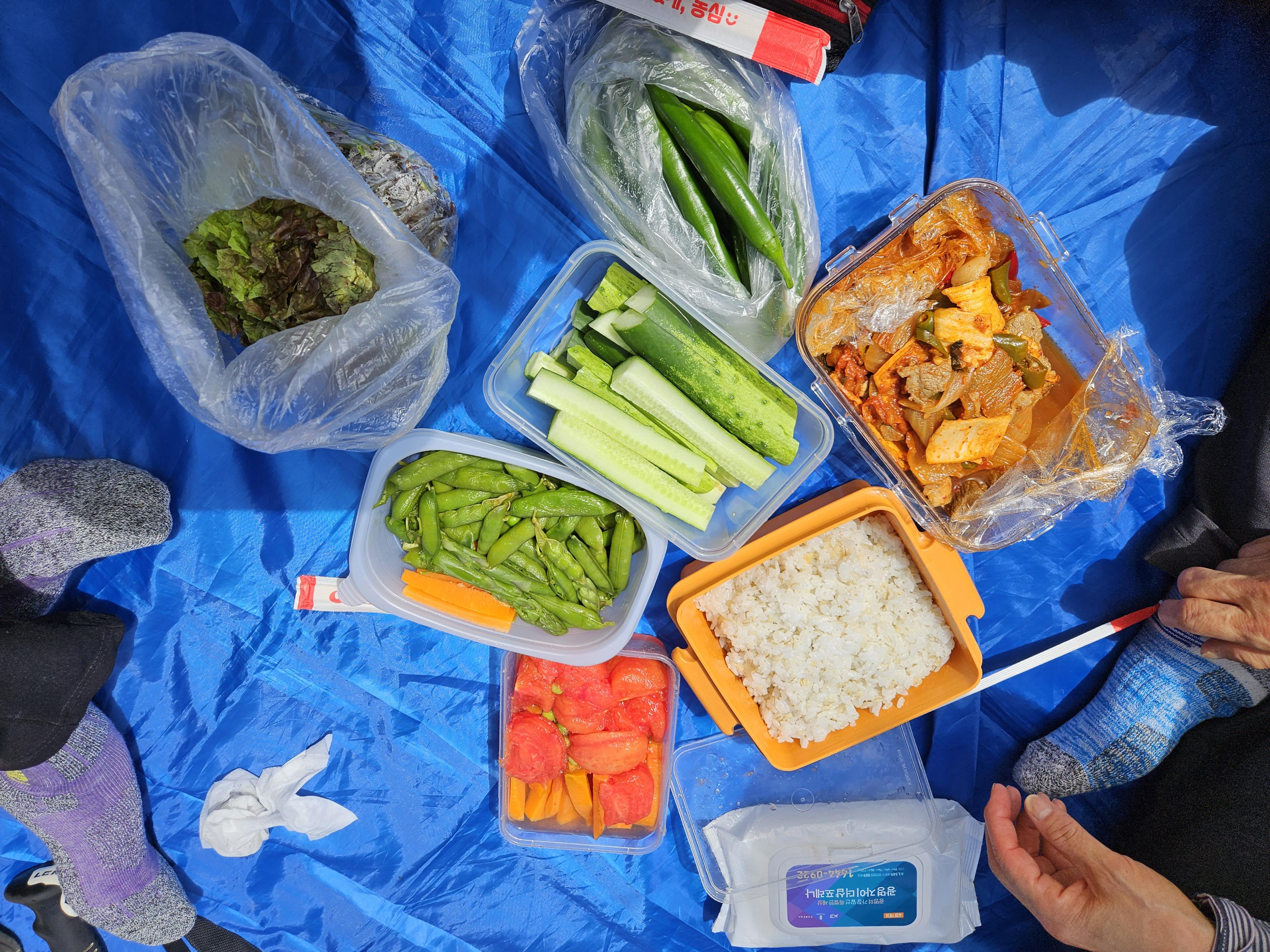 바위 한켠에 자릴잡고 도반이 준비한 점심을 먹는다. 산에서 먹는 푸짐한 한상차림이다.