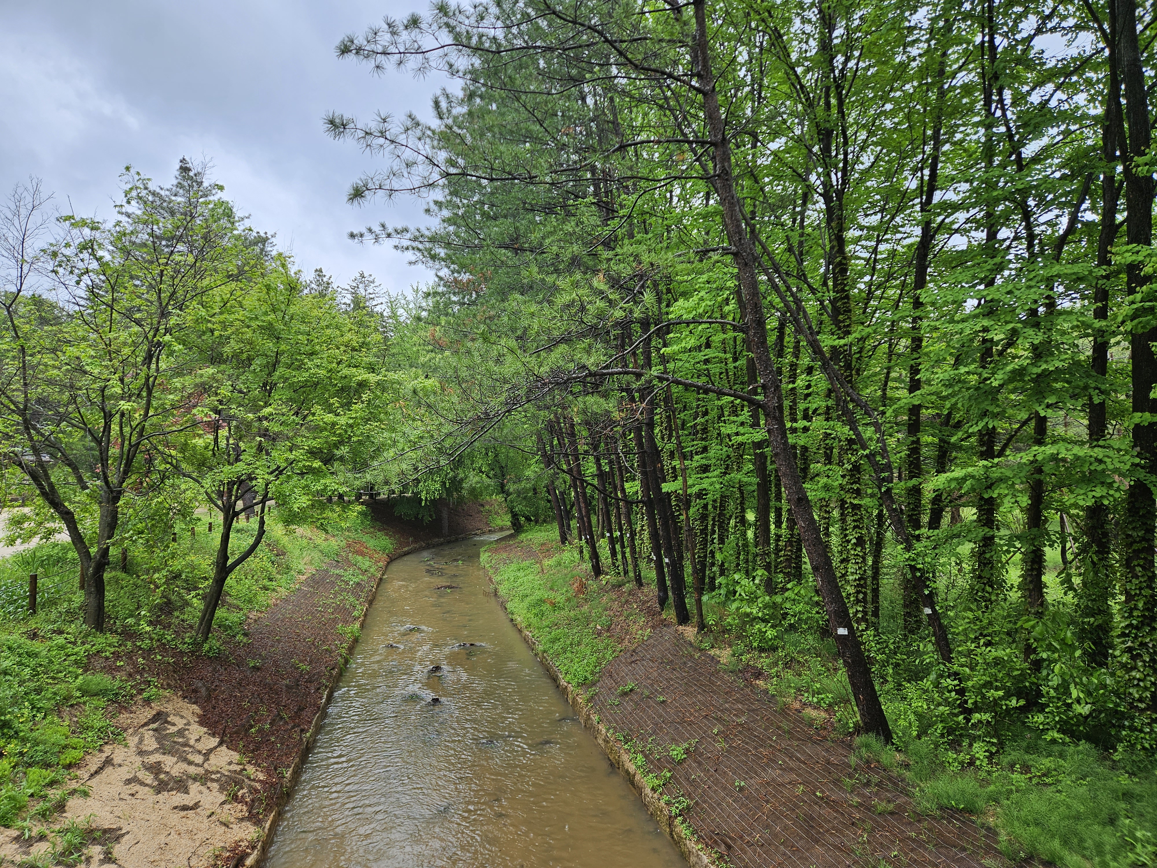 많은 비가 내려 개울에는 물줄기가 흙탕물을 흘러내린다.