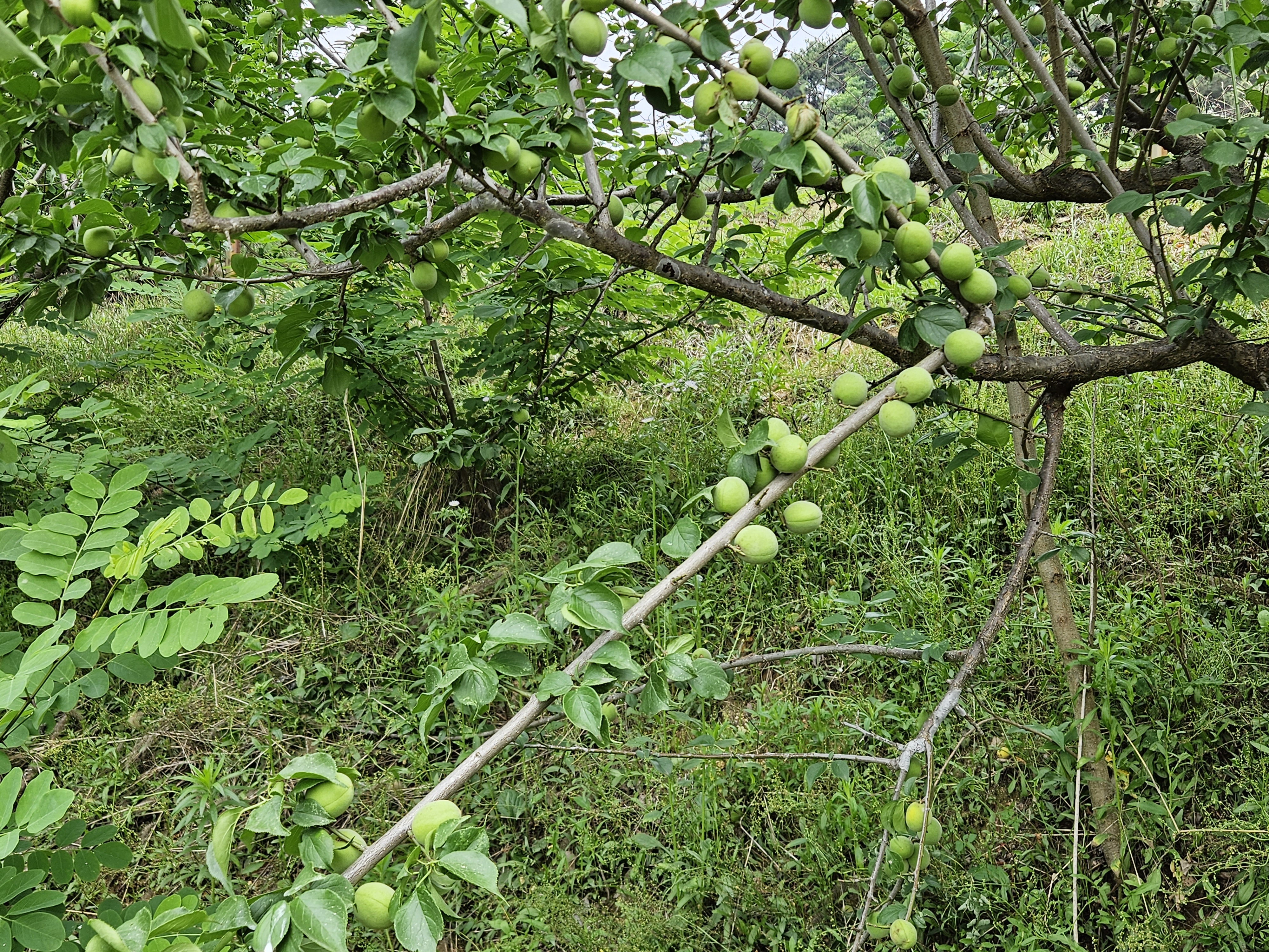 밭 둔턱경사지에 심은 매실을 따기가 쉽지가 않다.