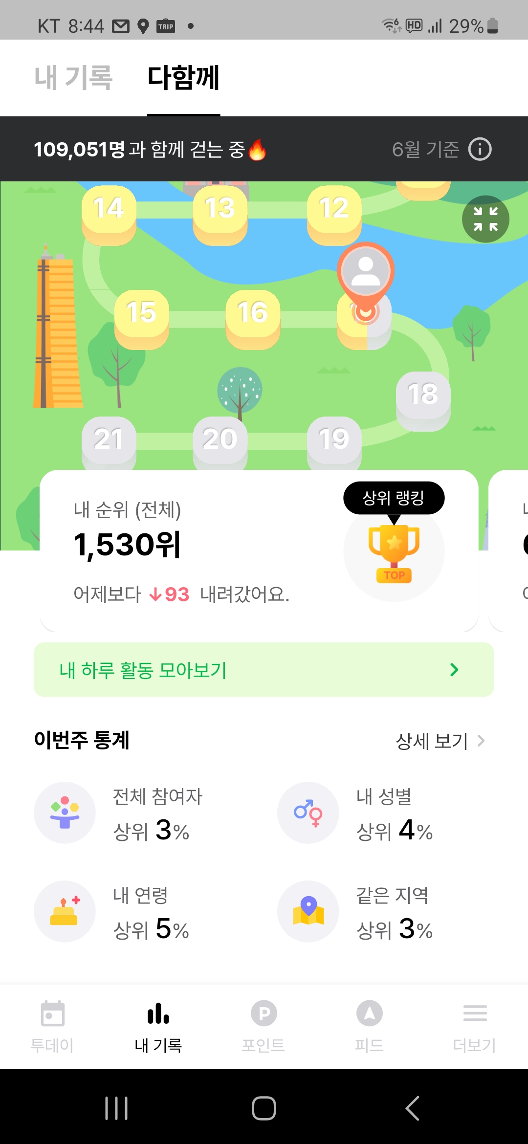 걷기에 관한 데이터가 전체 참여자 약11만명정도에서 상위 5%내에 랭크가 되니 그것 또한 기분 좋은 일이다.