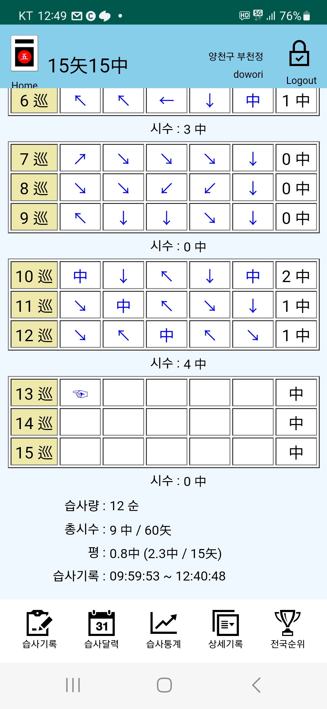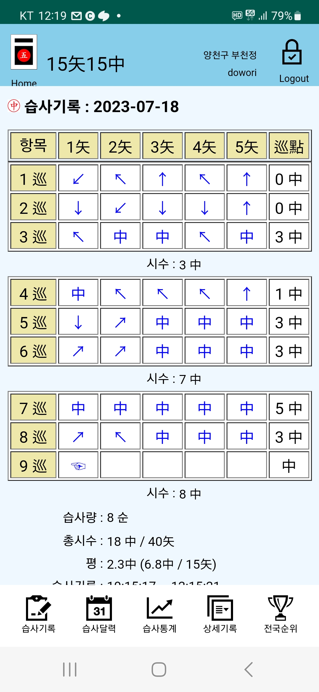 다시 세순에 7발이 관중이 되더니만 7순째 다섯발이 관중되는 몰기가 된다.