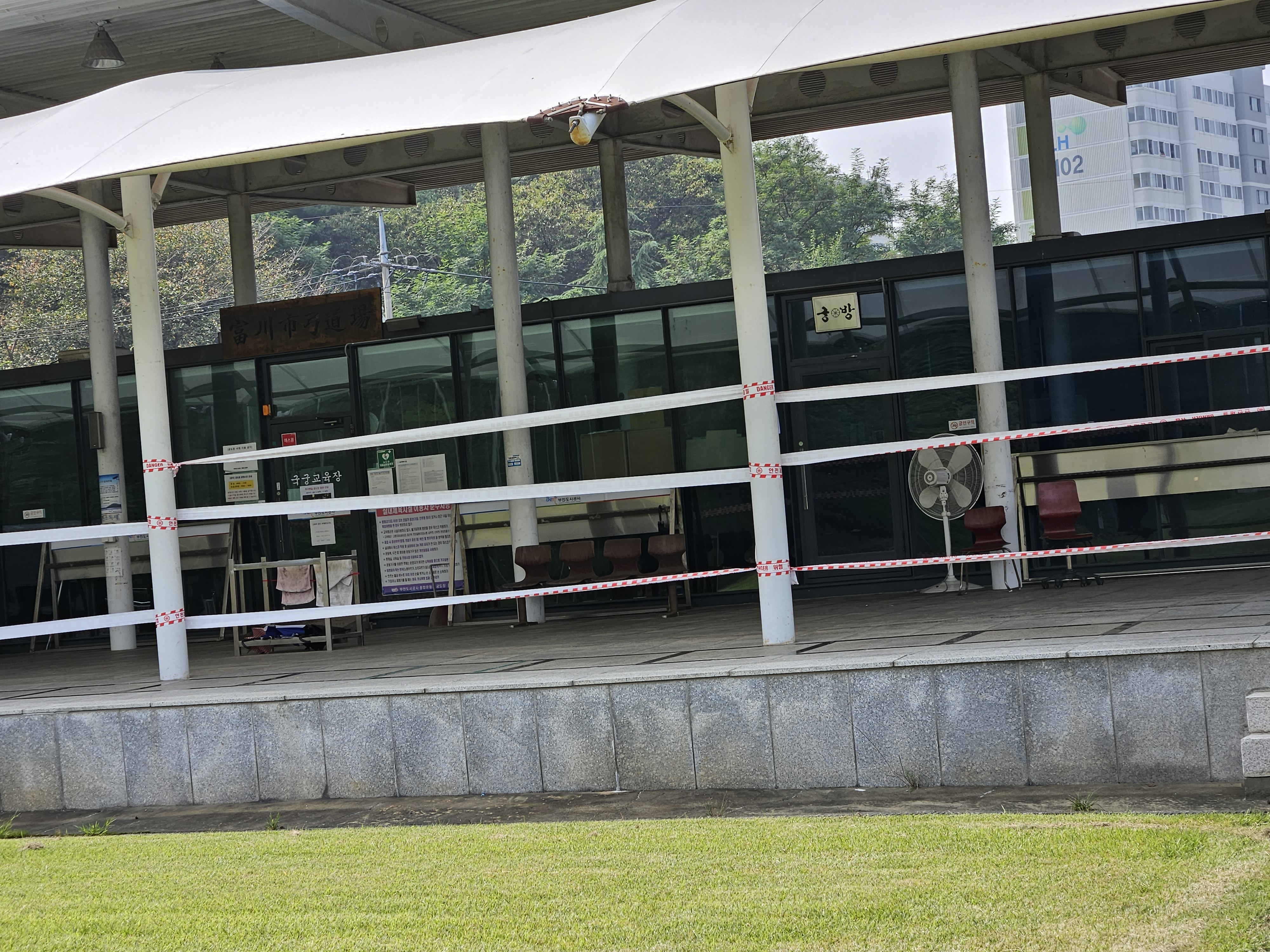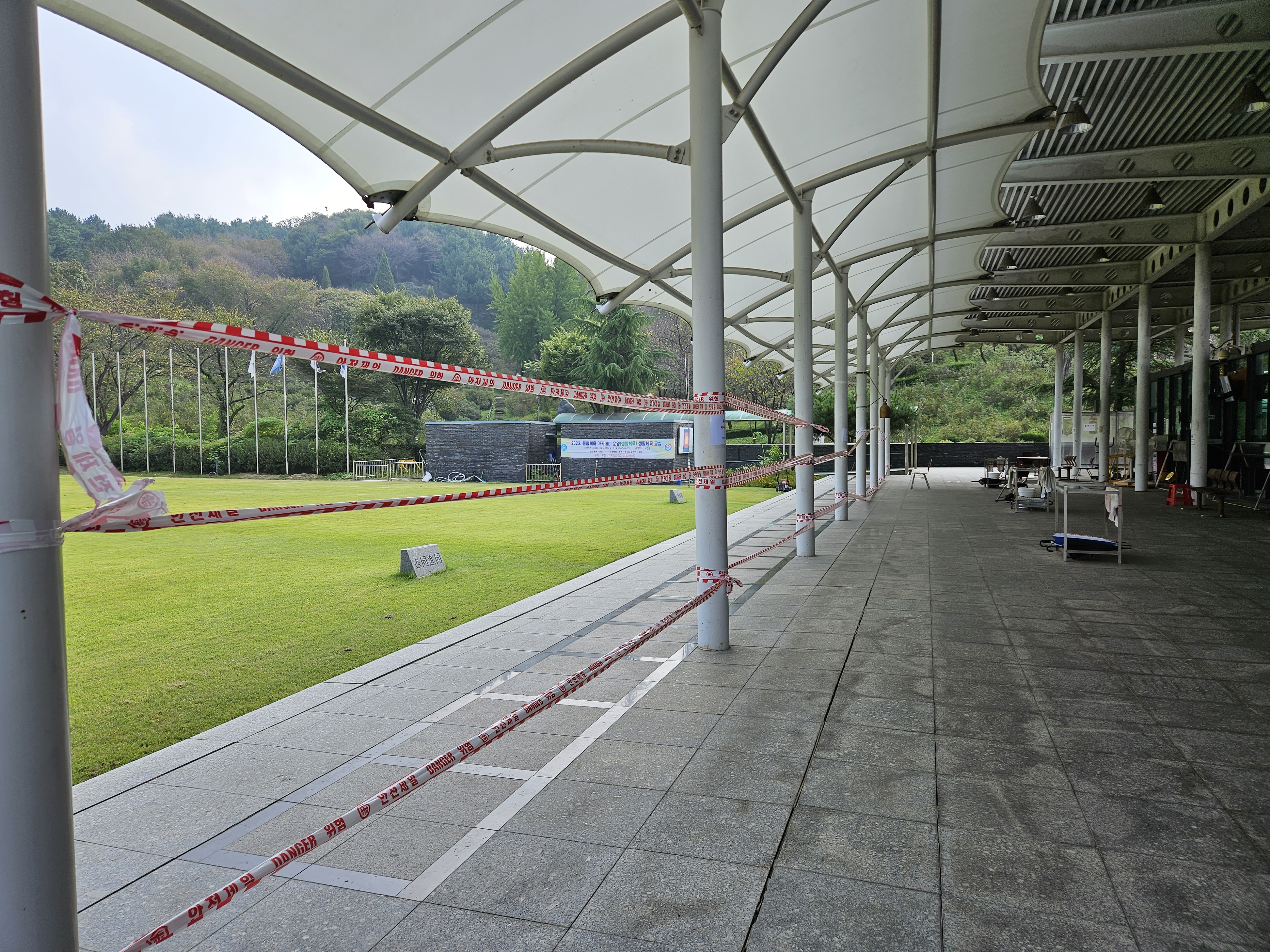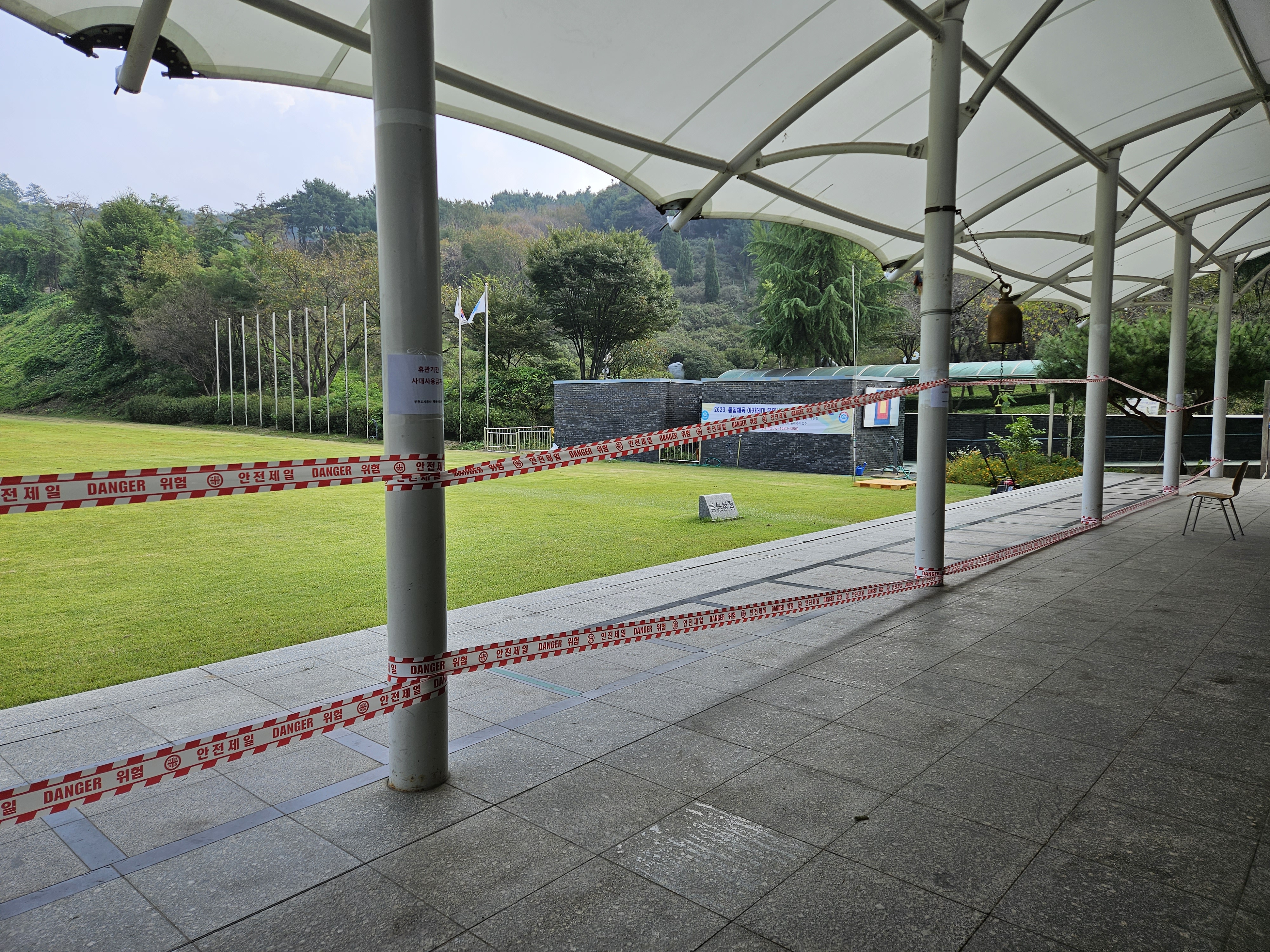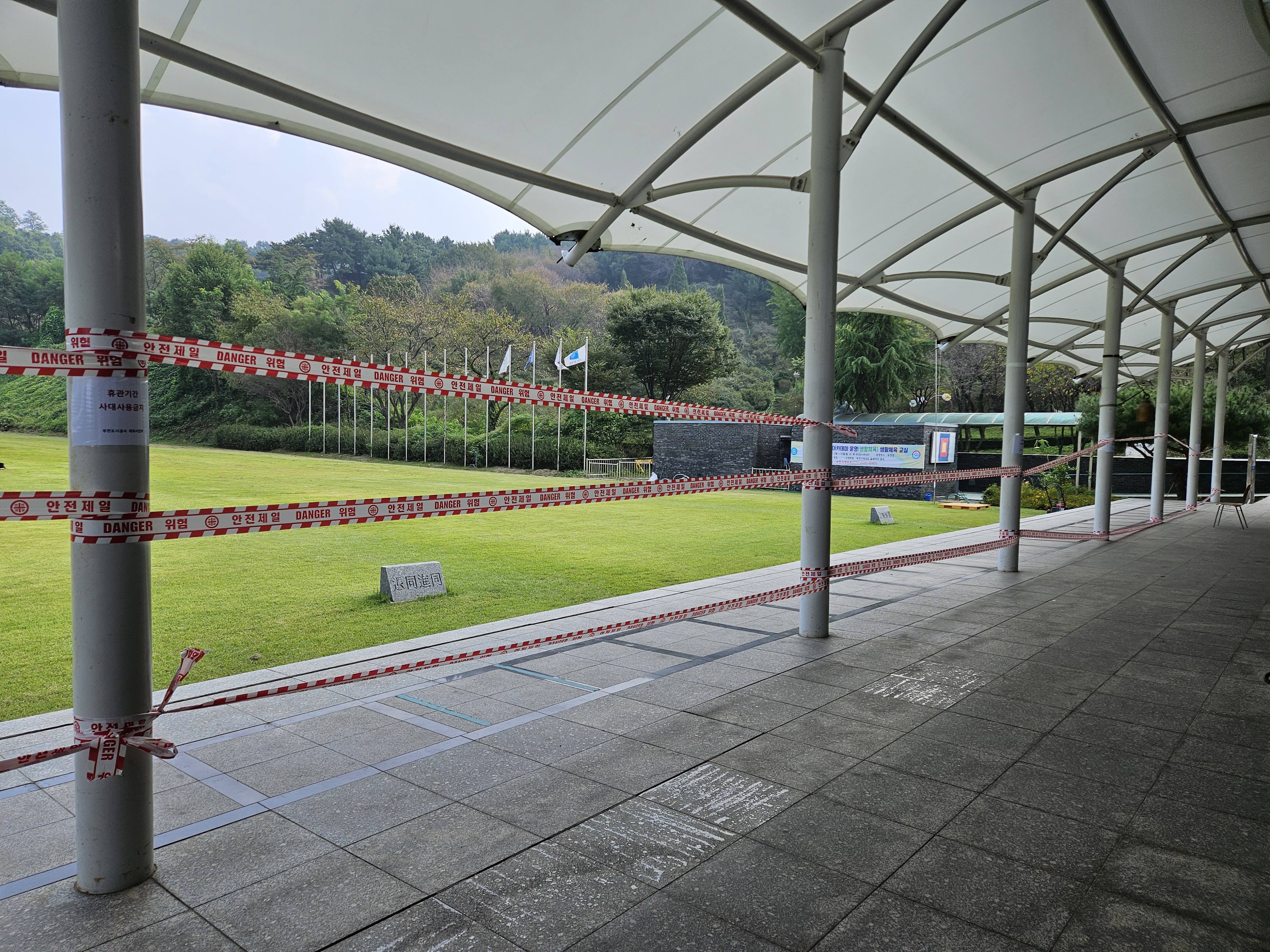 휴일 첫날 활터에 오르니 사대에 테이프를 둘러붙이고 습사를 하지못하게 직원이 통제를 하고있다.