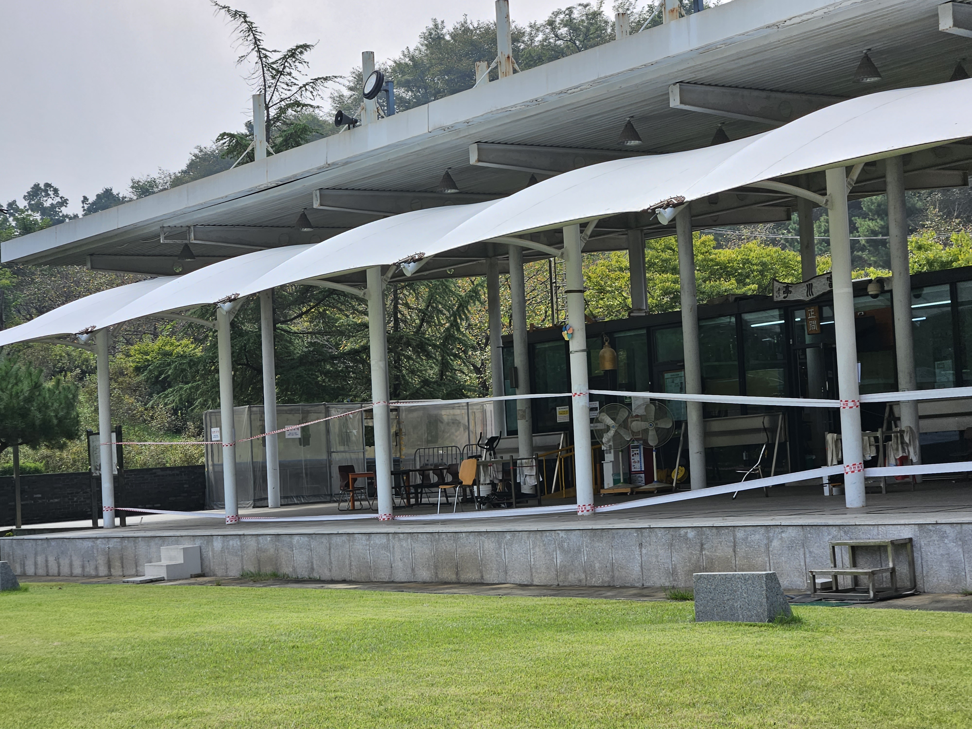 휴일 첫날 활터에 오르니 사대에 테이프를 둘러붙이고 습사를 하지못하게 직원이 통제를 하고있다.