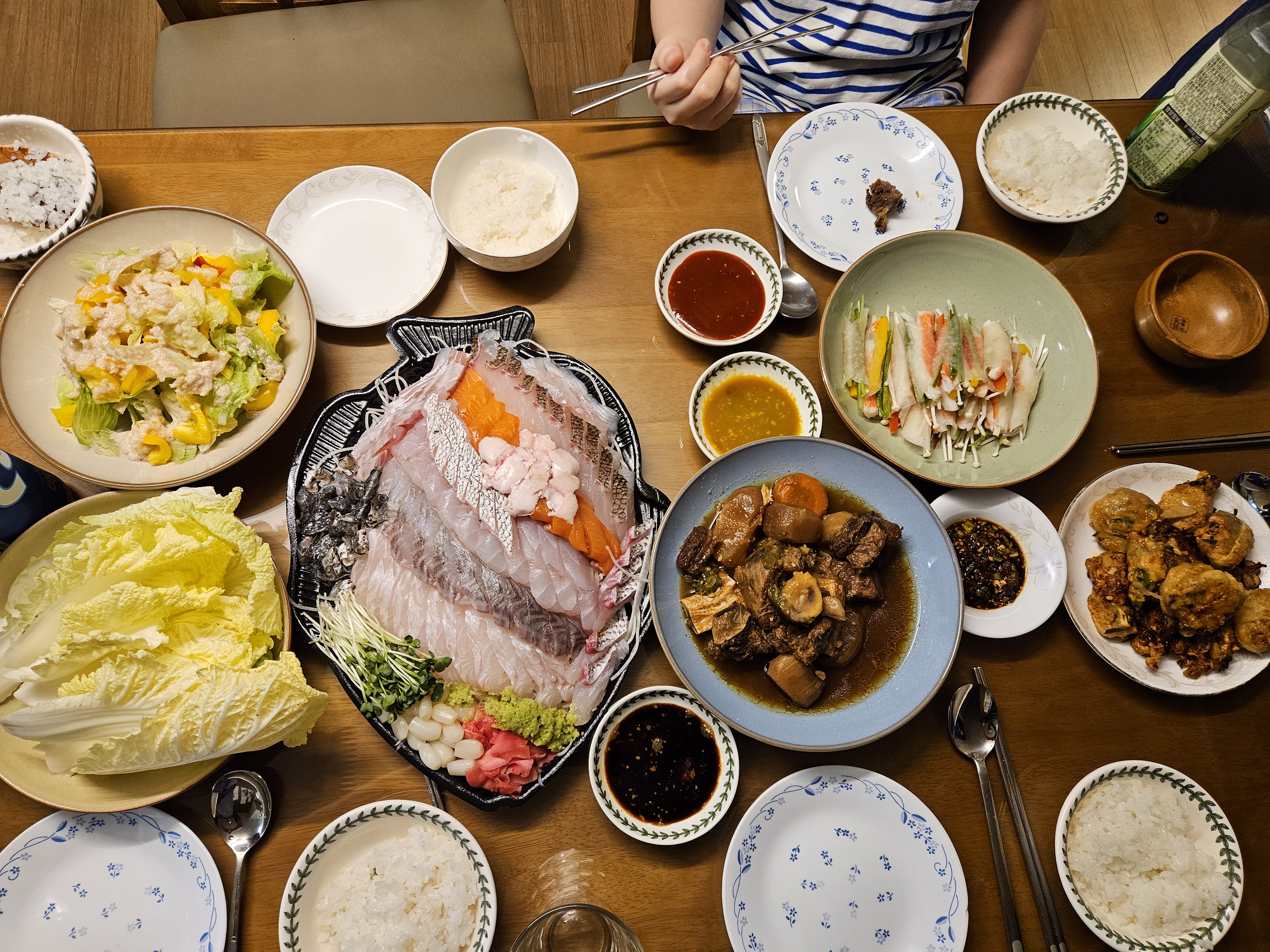 회와 갈비 게장 및 만두,부침개,묵과 야채등을 차리니 한상에 다 올라가질 못한다.