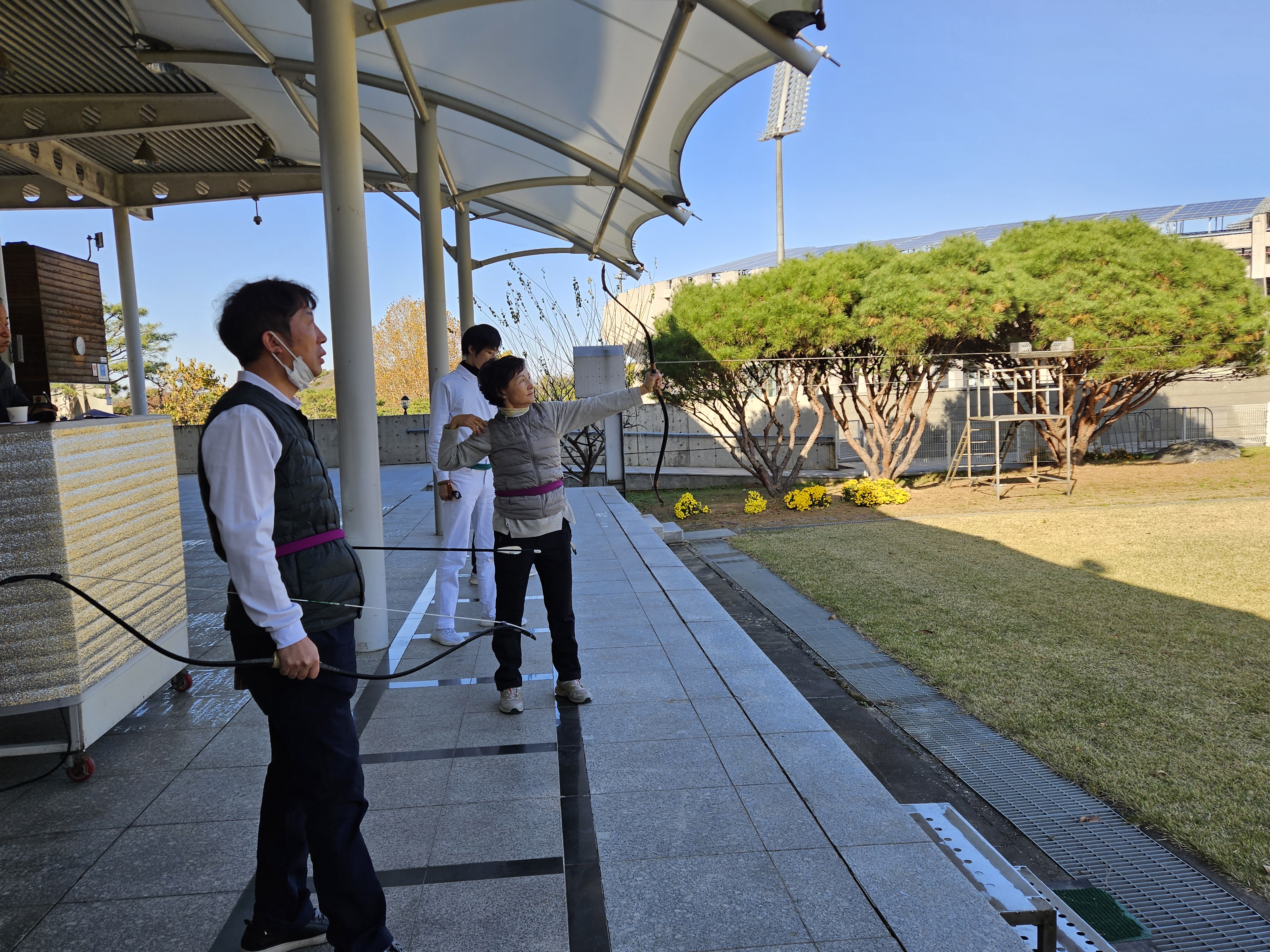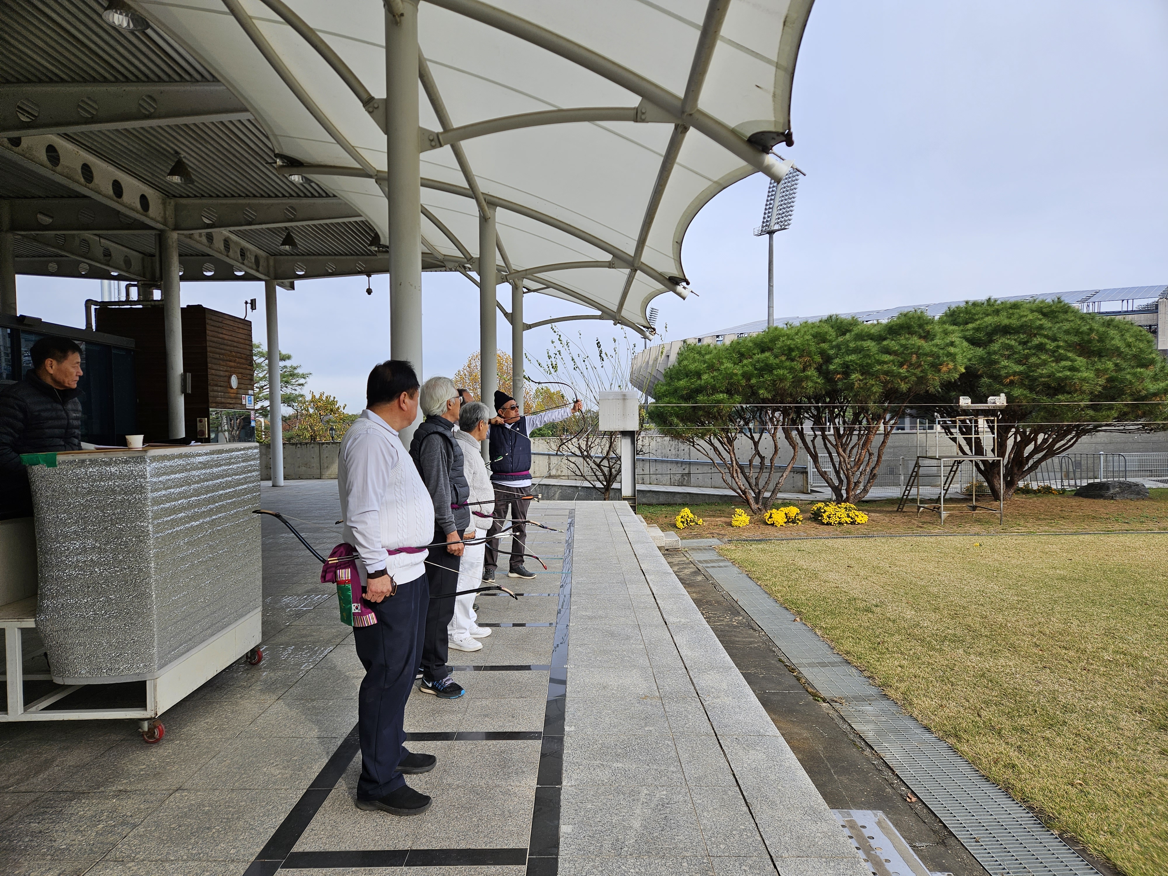 가을옷에 궁도복 조끼를 입고 점퍼를 걸쳤는데도 으실하다.