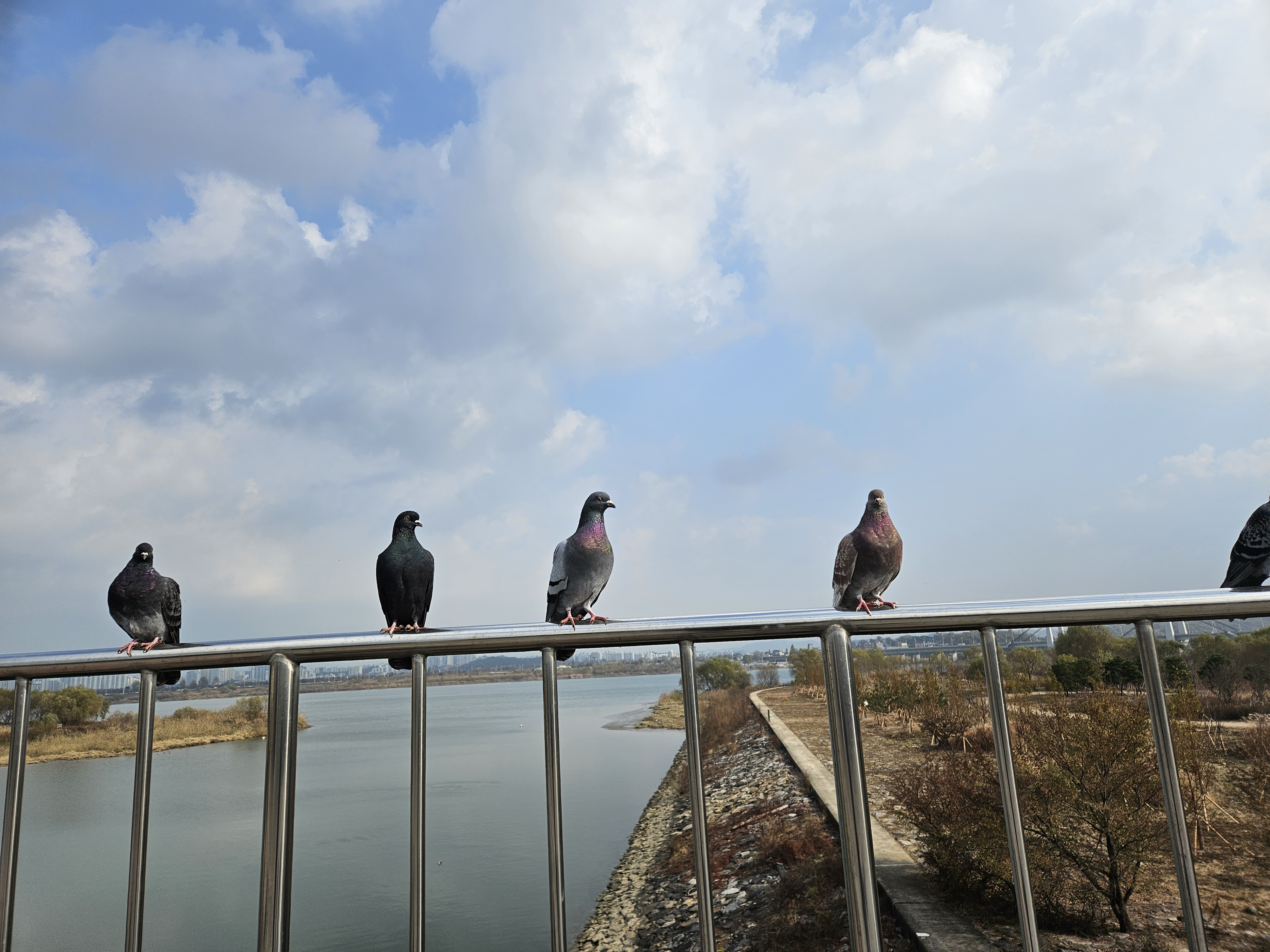 비둘기들이 나란히 난간에 앉아 다가서도 움직이지않고 바라보고있으니 굳이 방해할 것도 없다.