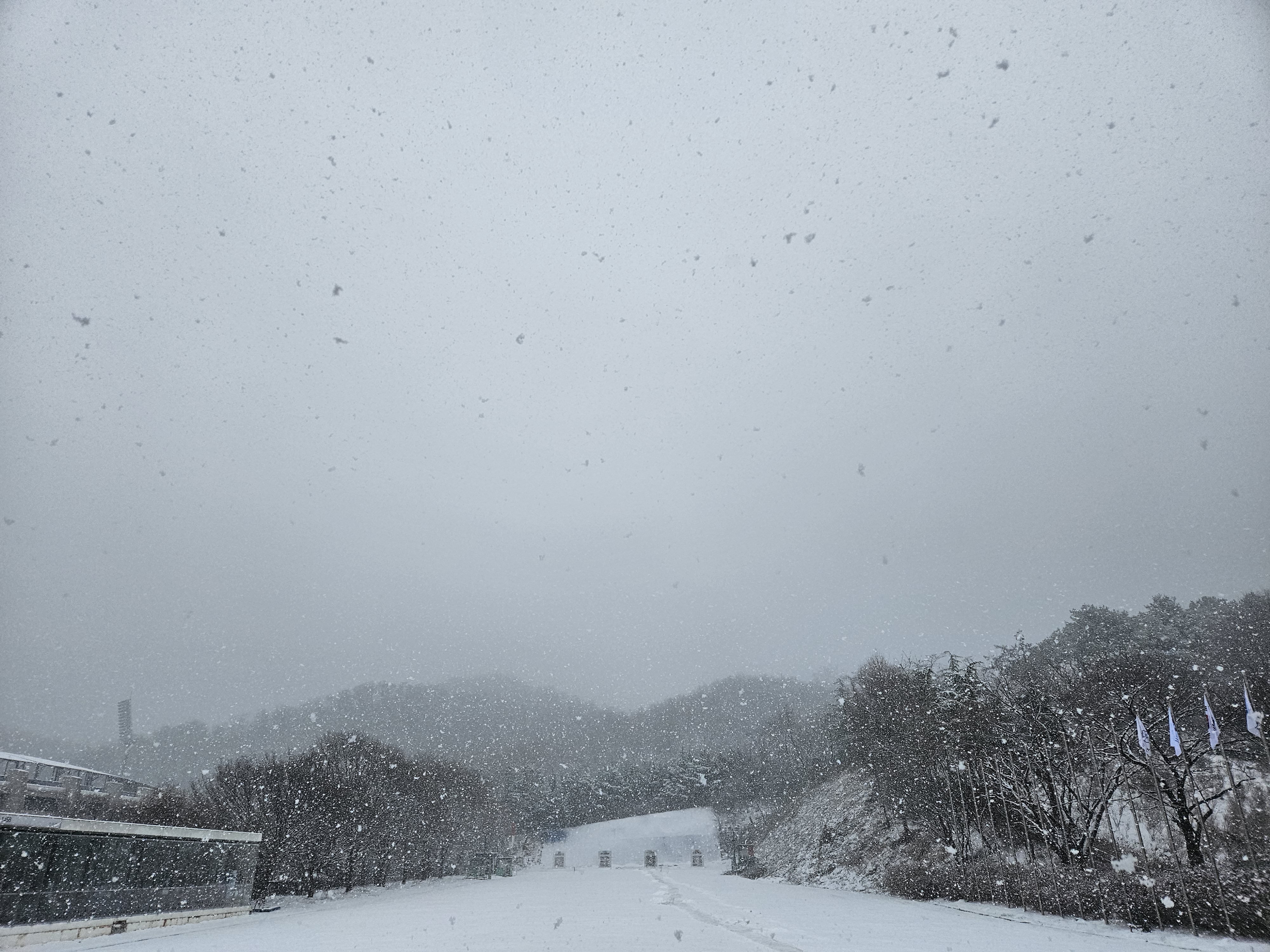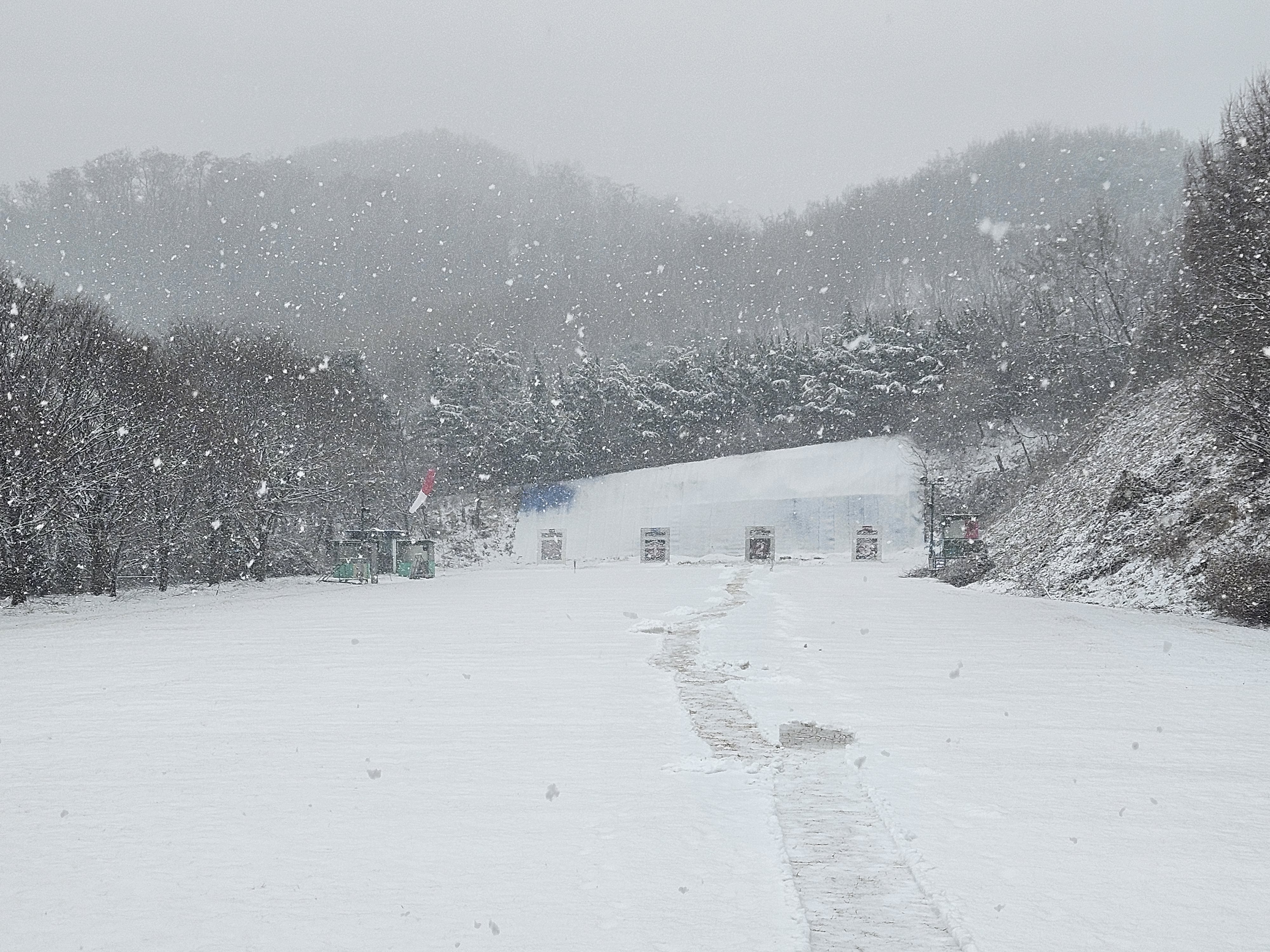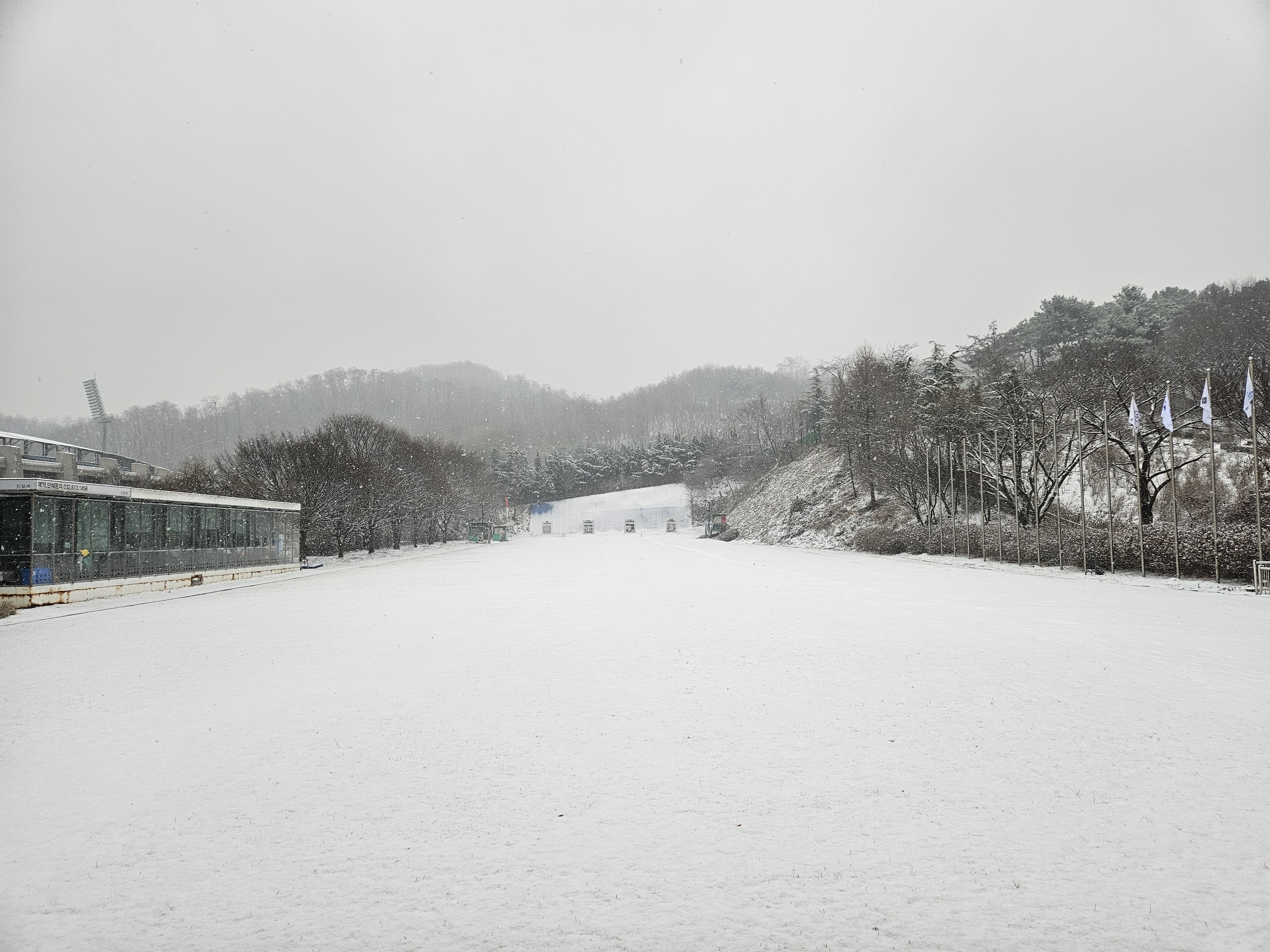 활터는 그야말로 온통 하얀세상인데 거기에 펑펑 눈이내리고 멀리과녘이 아스라히보이고 눈을 뒤집어 쓰고있다.