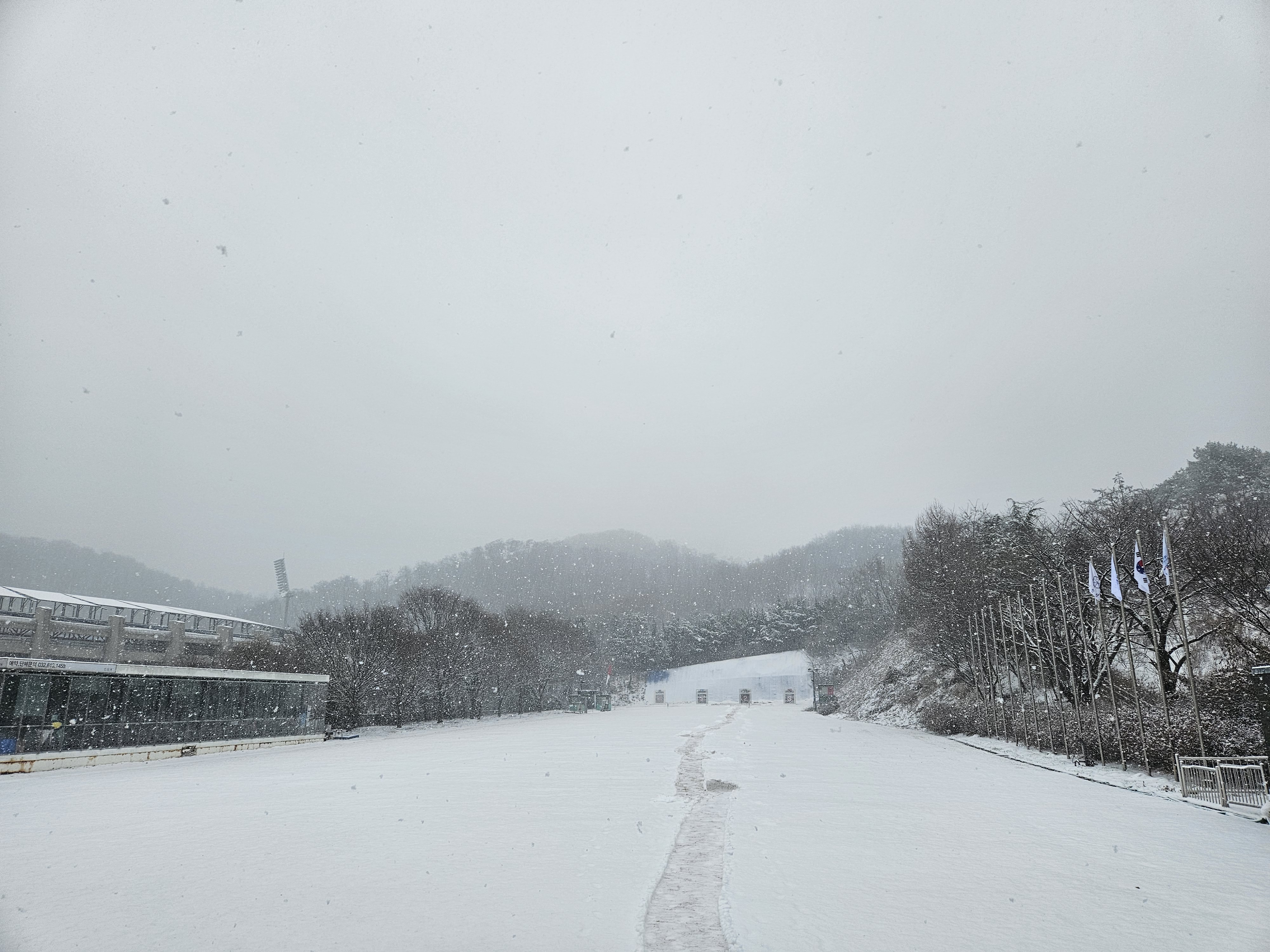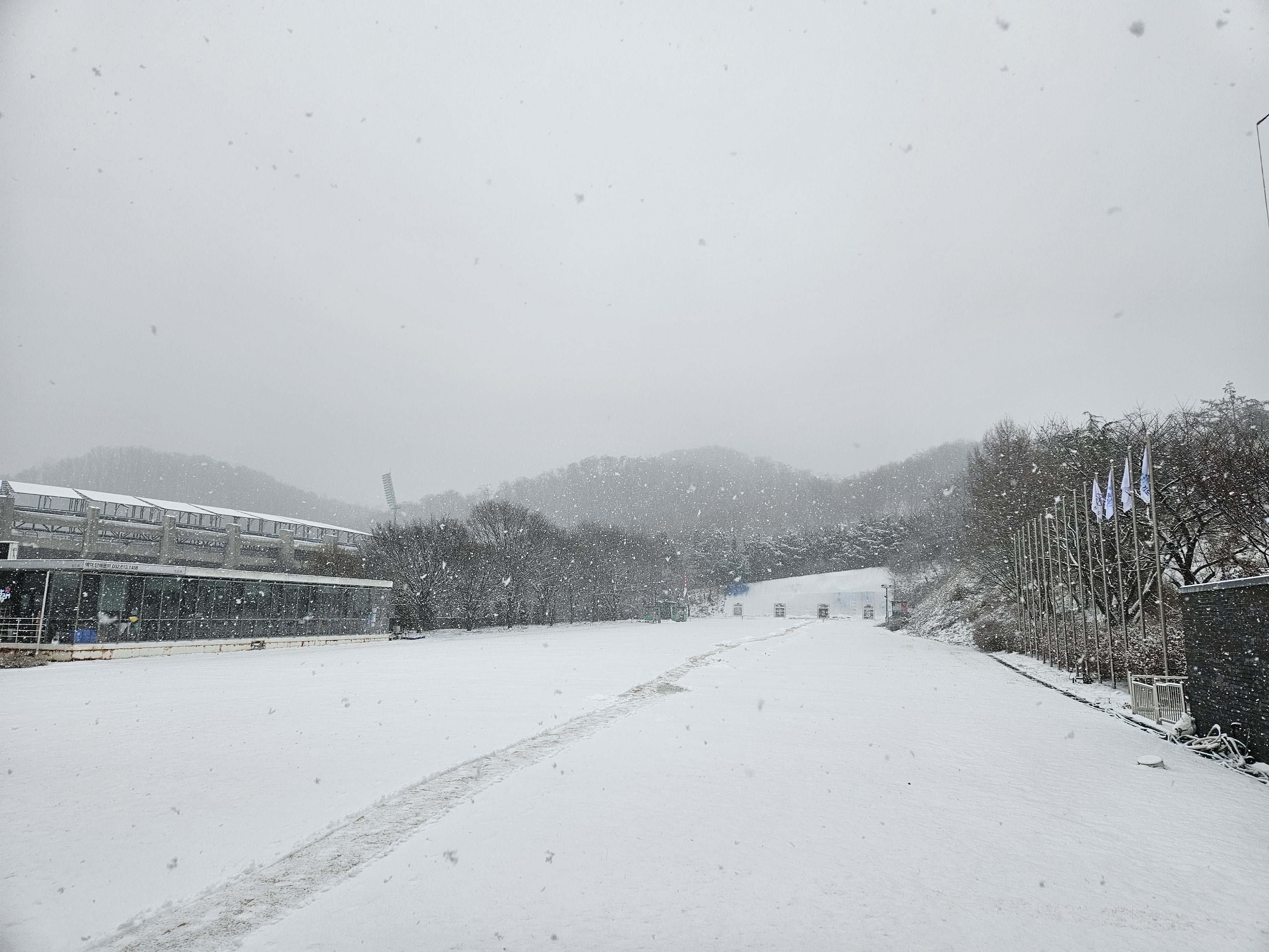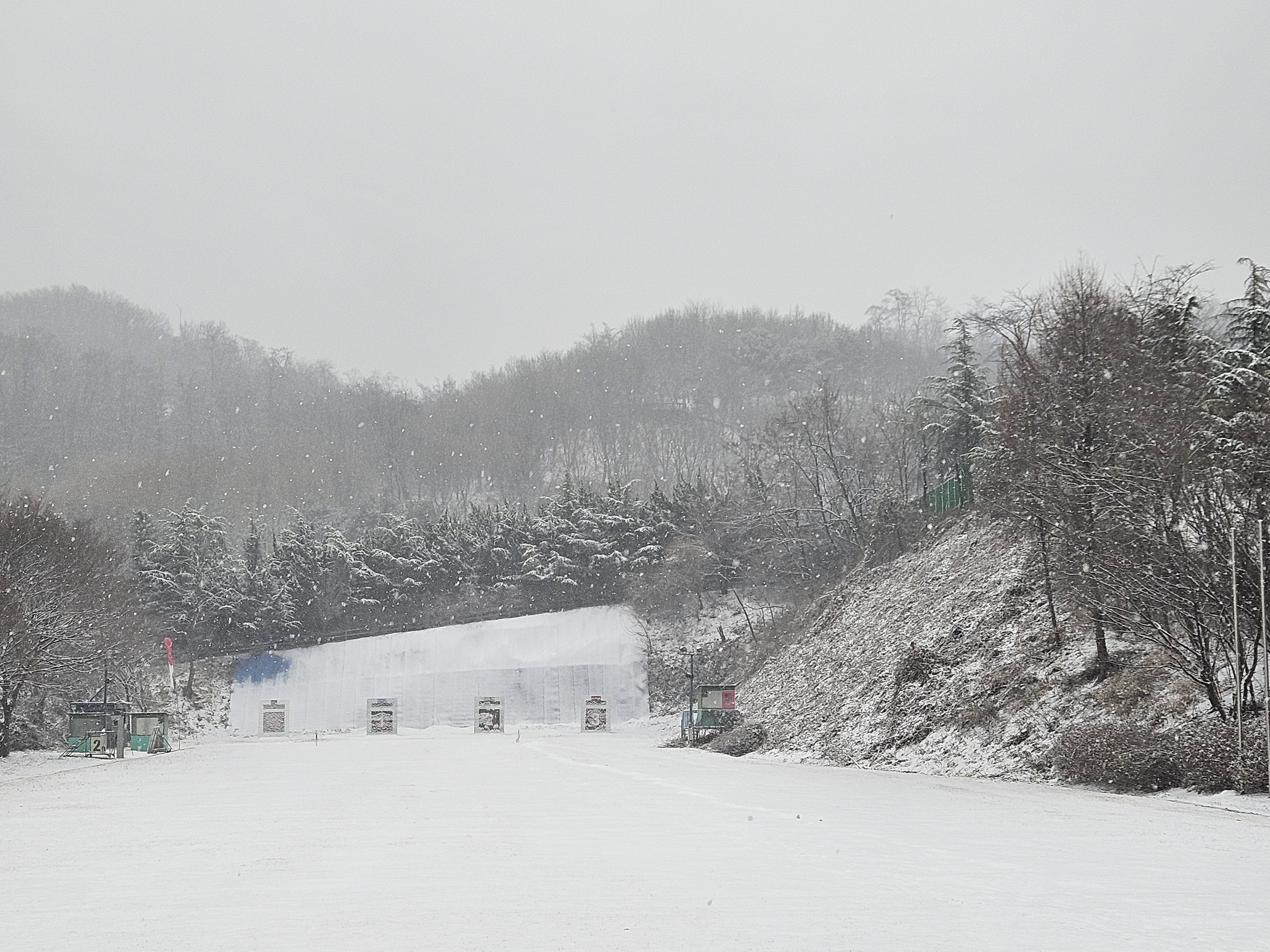 활터는 그야말로 온통 하얀세상인데 거기에 펑펑 눈이내리고 멀리과녘이 아스라히보이고 눈을 뒤집어 쓰고있다.