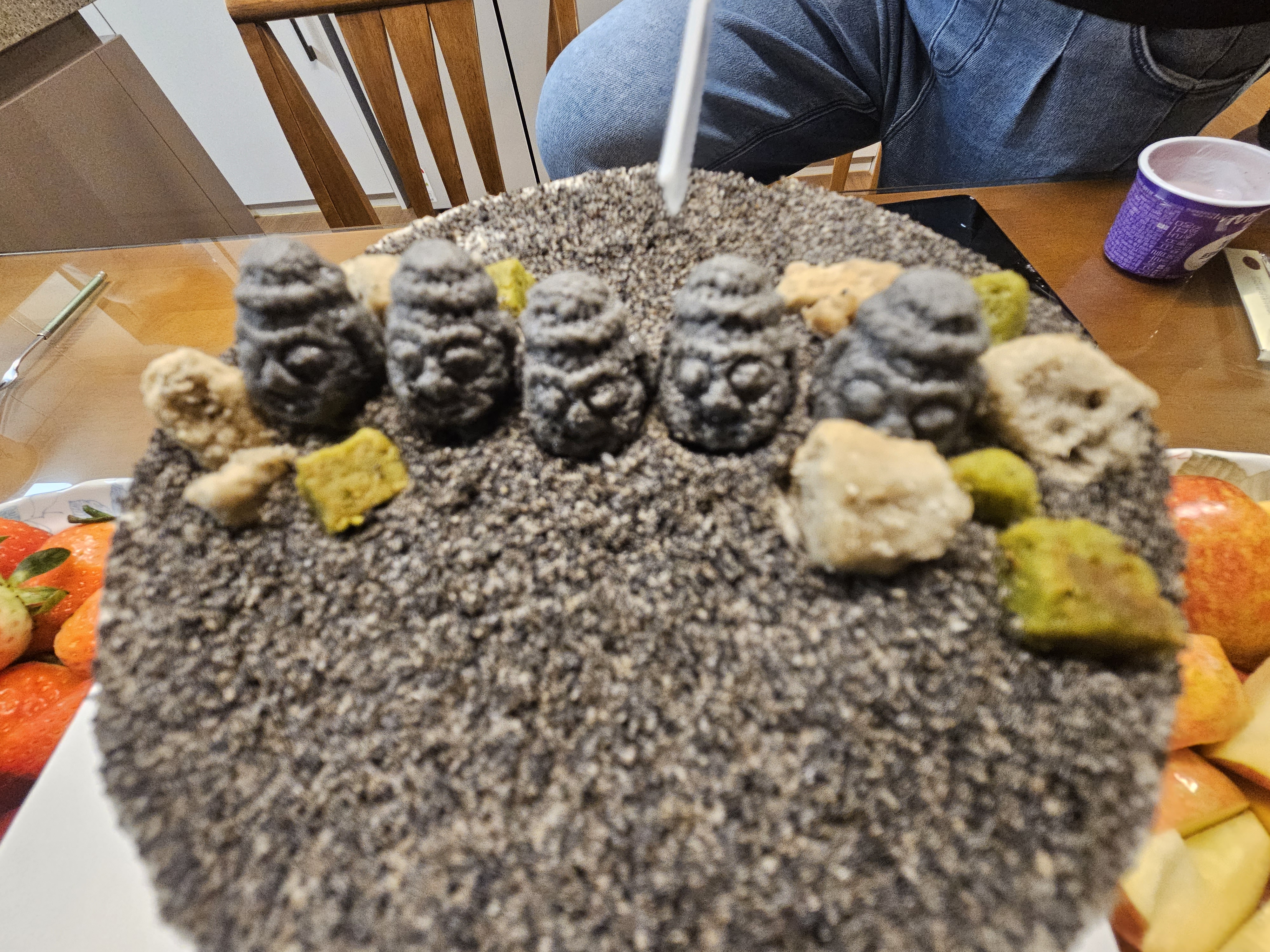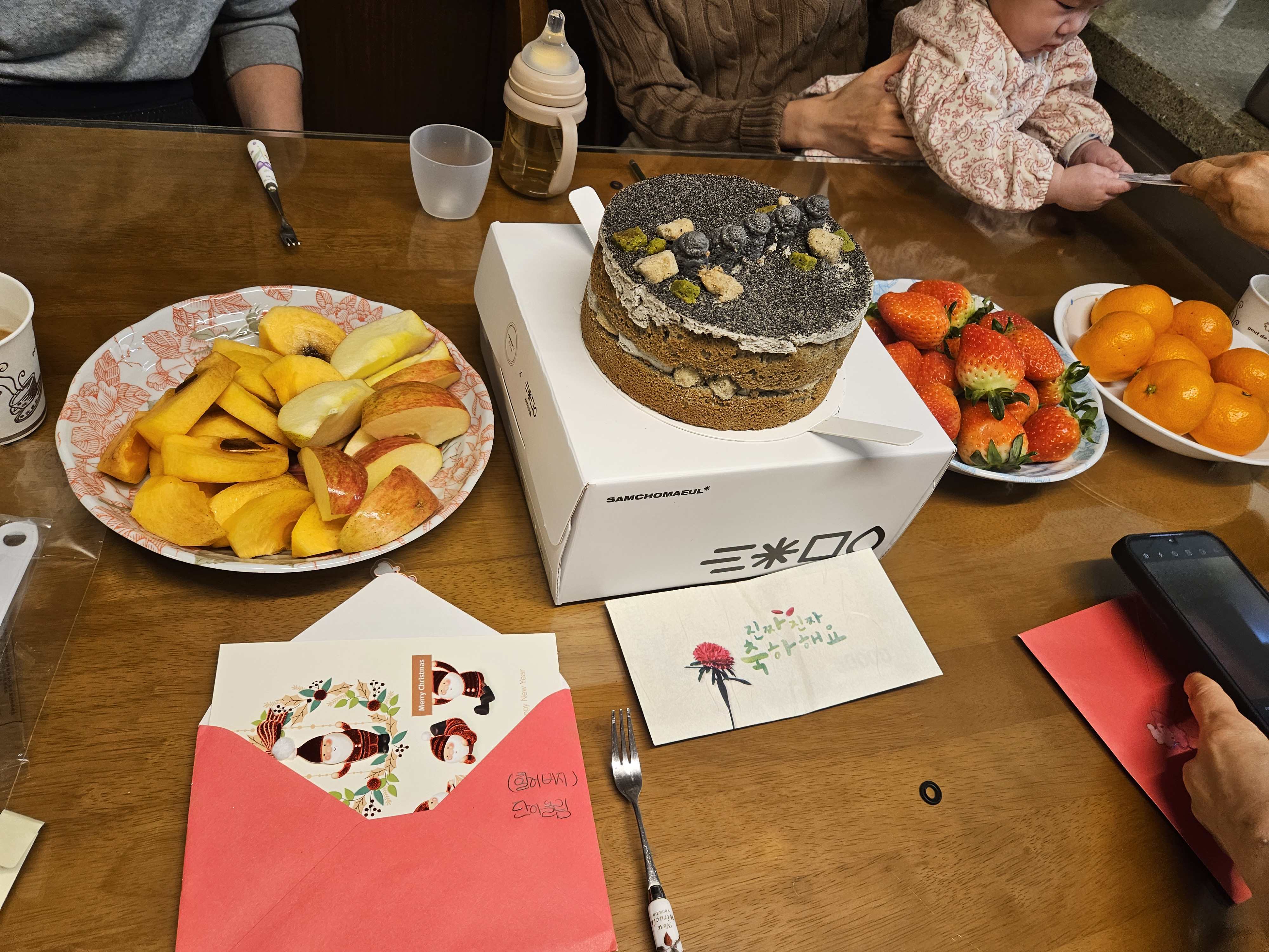 점심을 외식을 하고는 집으로 들어와 케익을 자르고 과일을 먹으며 휴일오후 시간을 손녀를 돌보며 재미있게 보낸다.