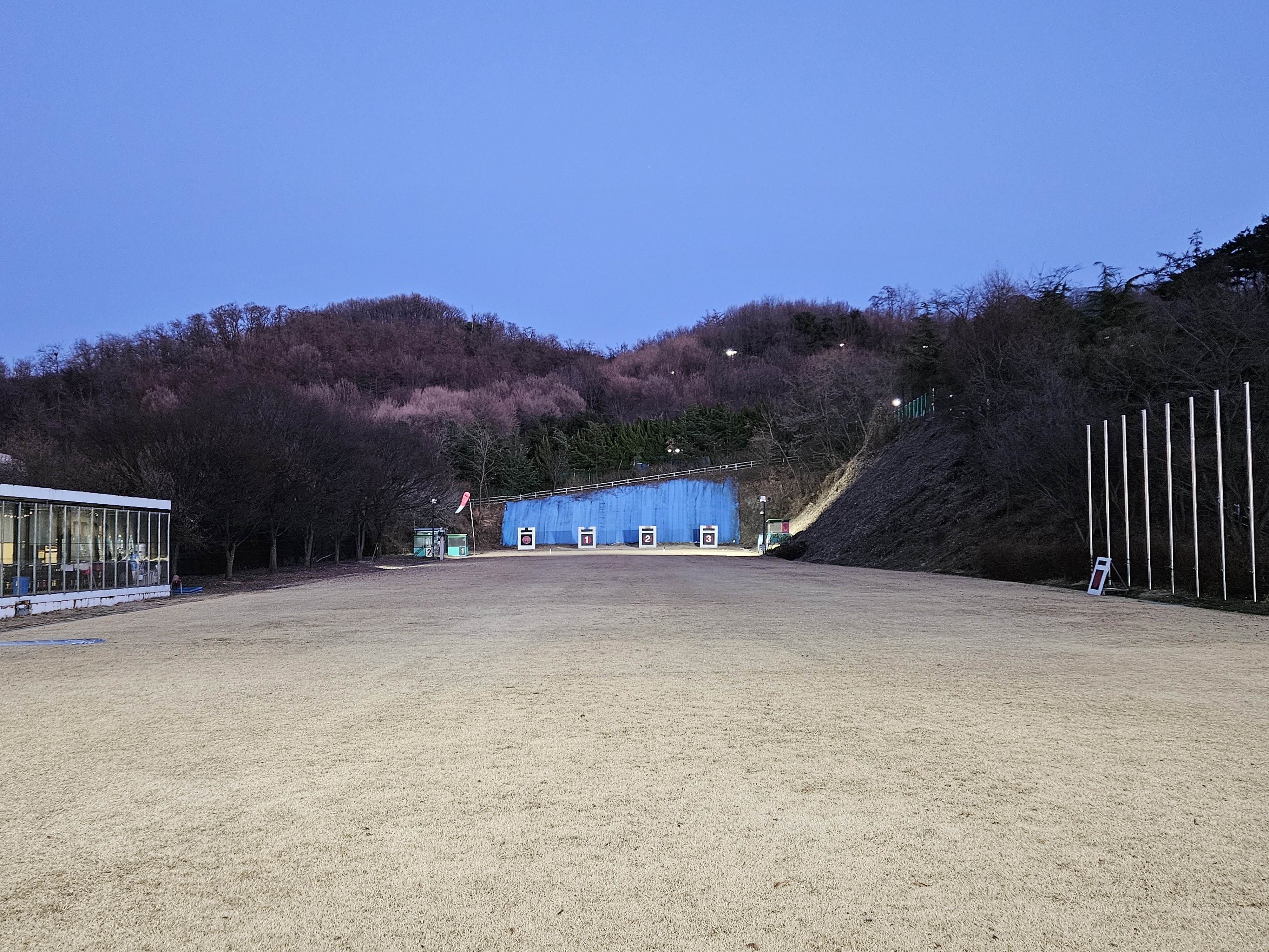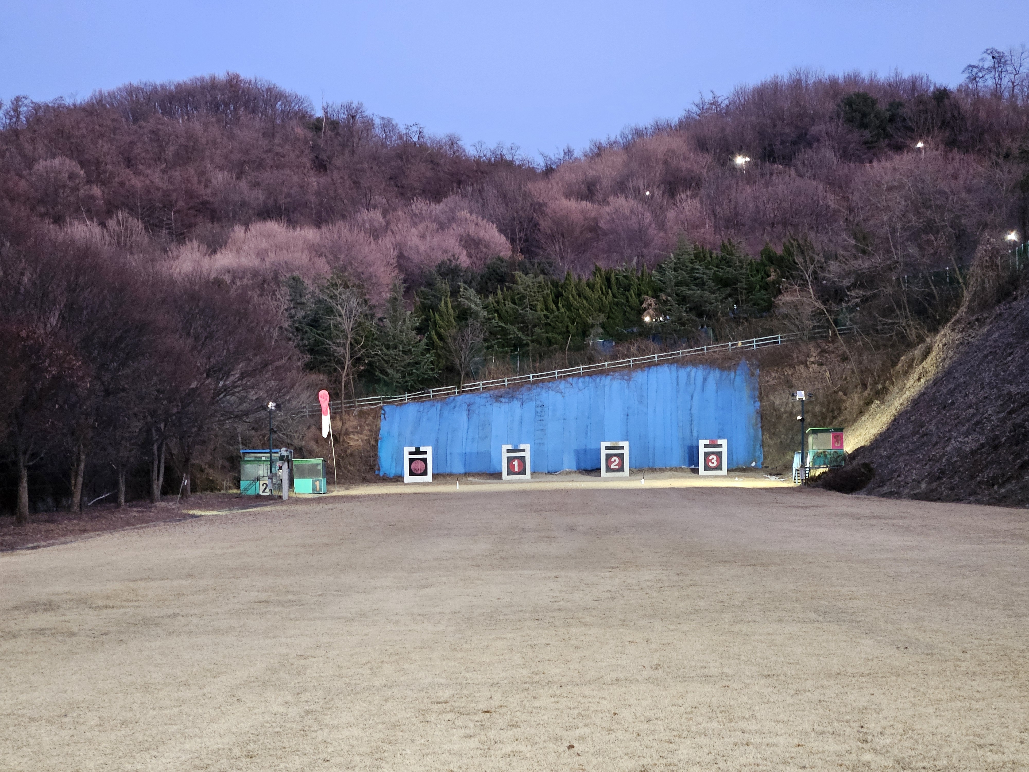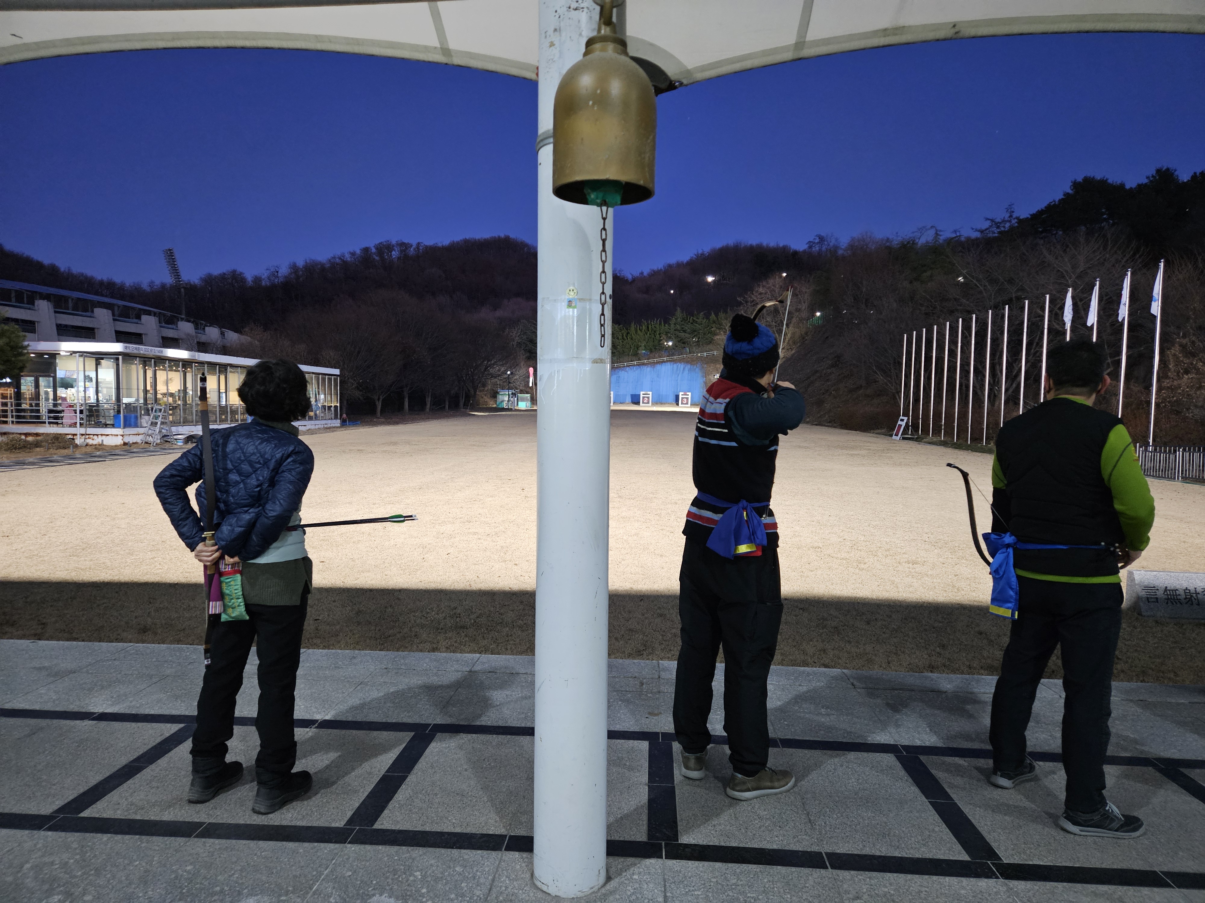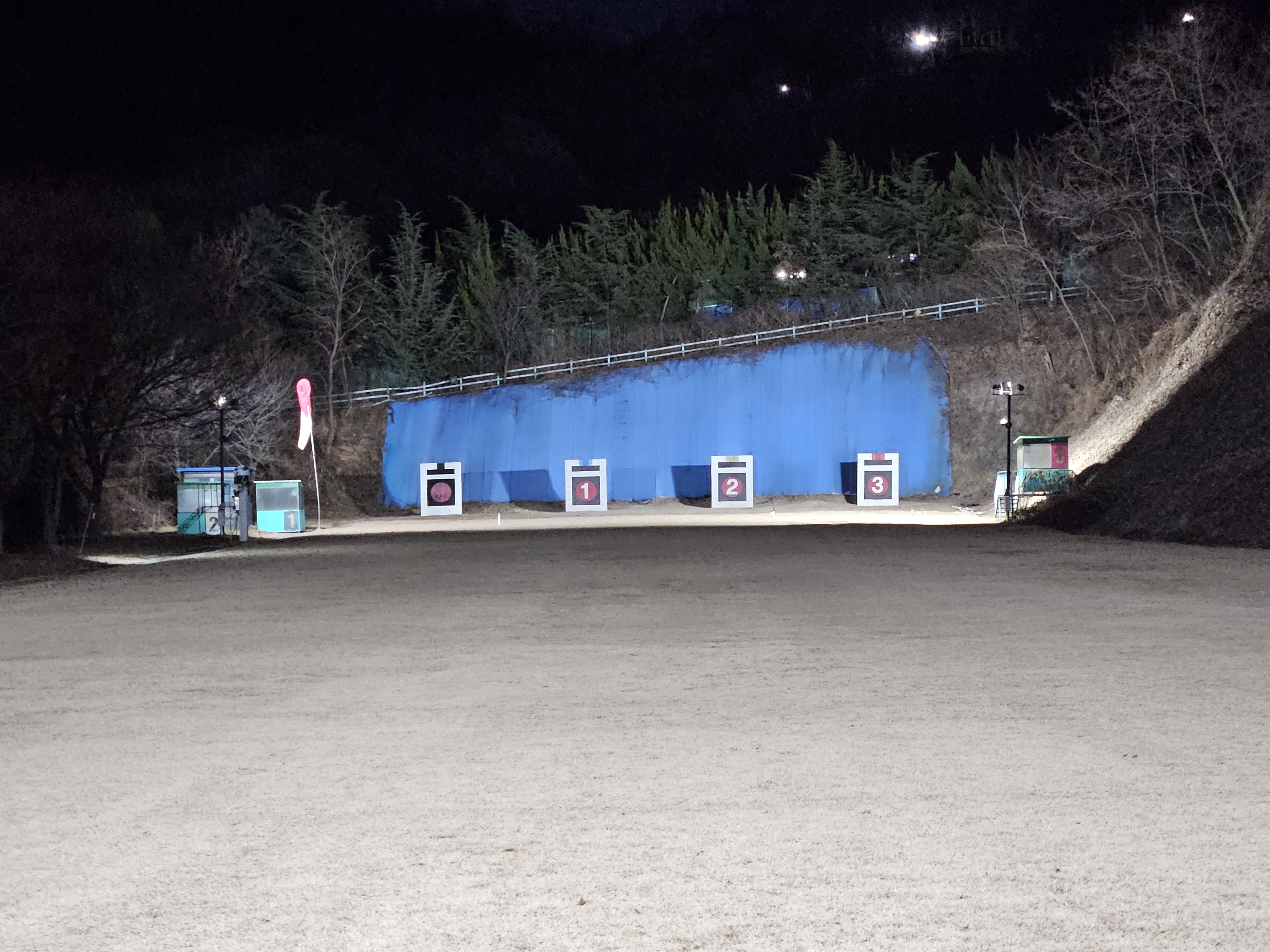 활터의 팬스 설치공사로 인해 주간에 습사를 금지하니 하는수 없이 공사가 종료된 저녁무렵에 사대에 오른다.
