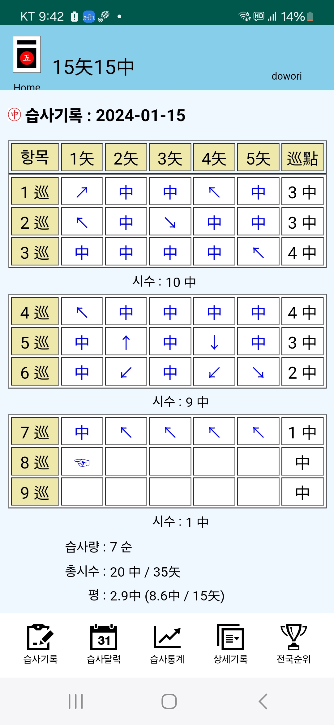 삼순에서 3,3,4발 관중으로 10중을 달성하고 이어진 3순에서는 4,3,2발로 9중에 머물고 만다.