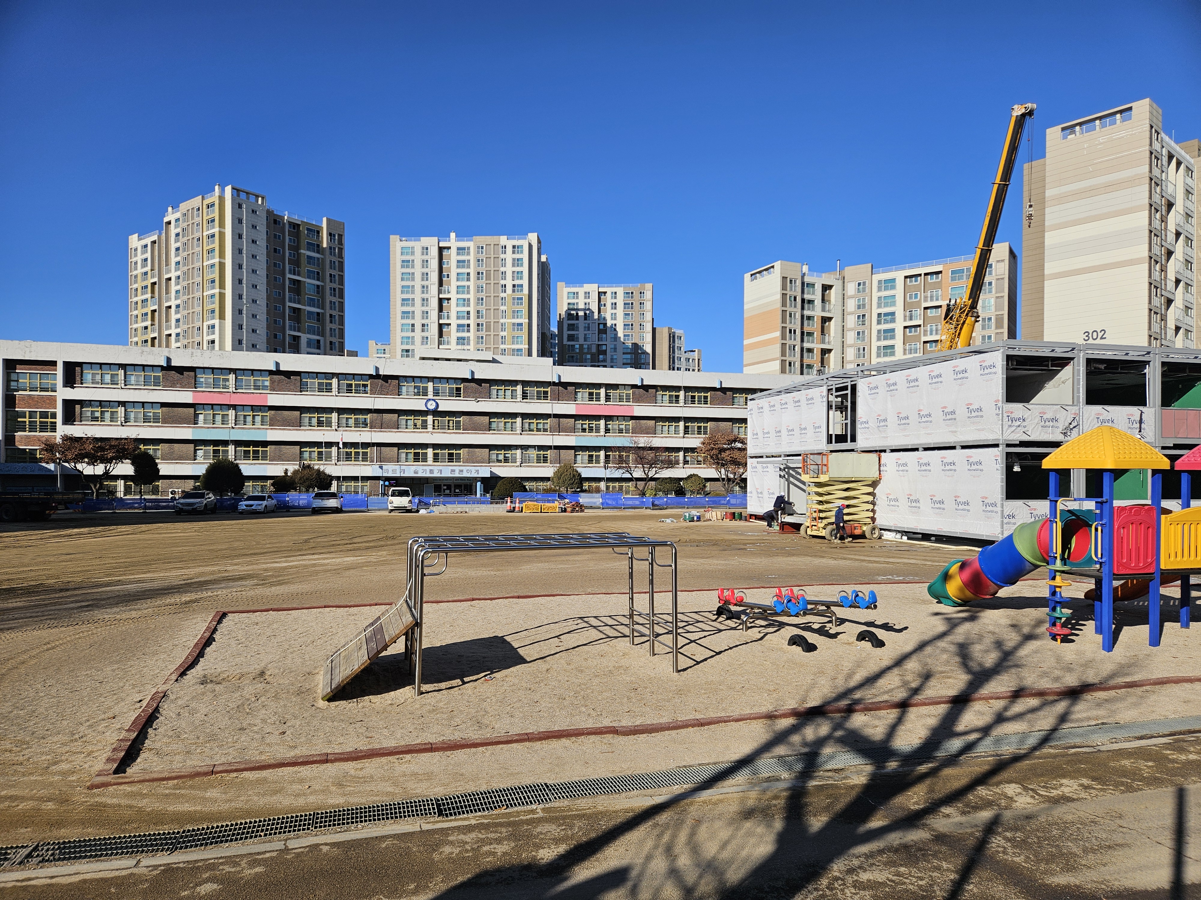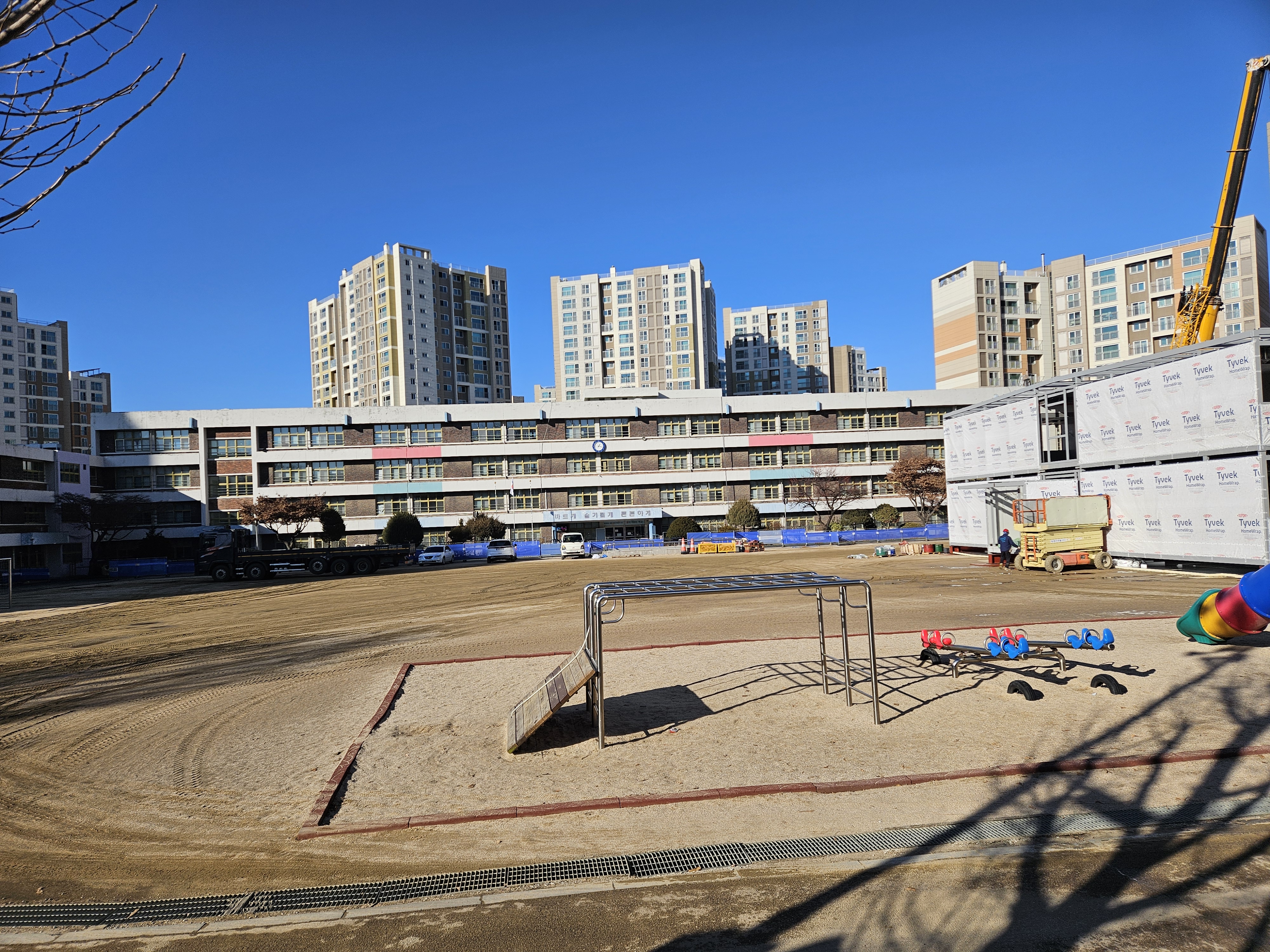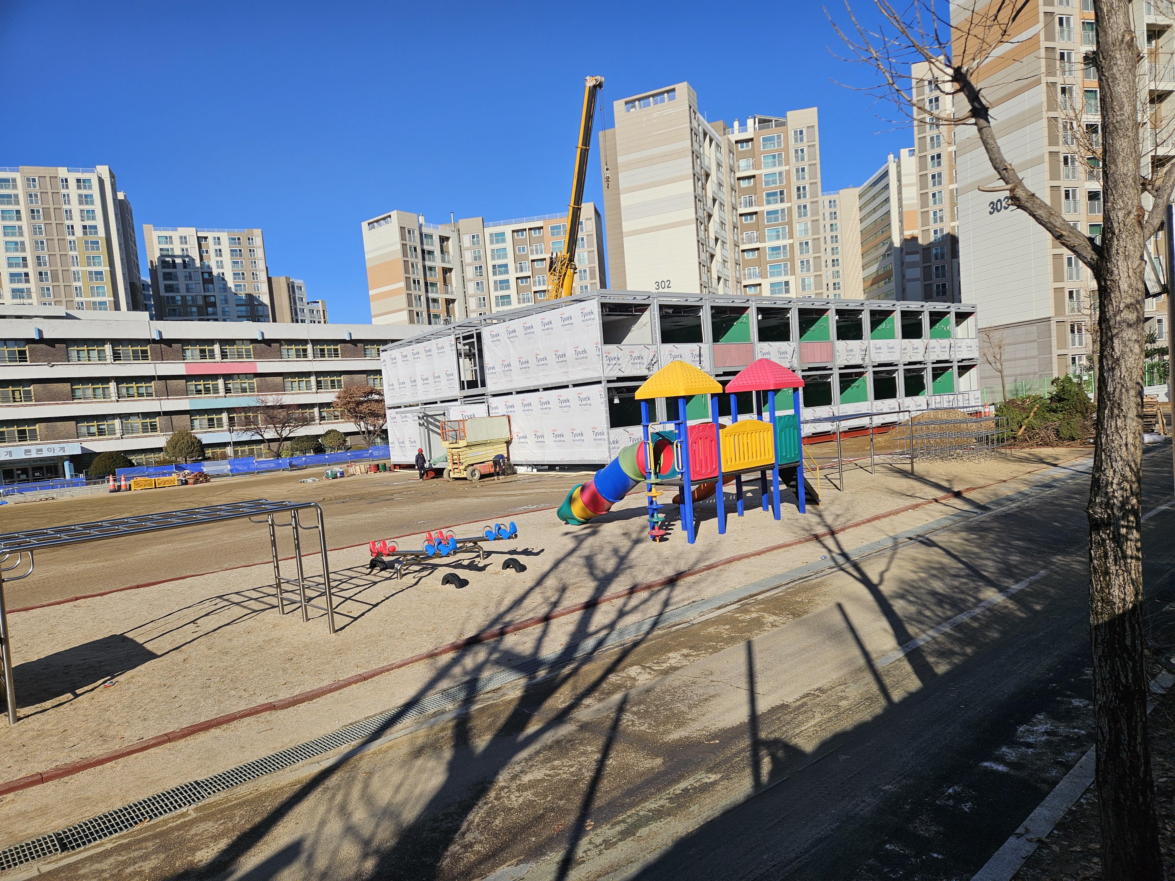 오후에 산책을 하면서 학교를 둘러보니 커다란 크레인이 이미 만들어진 모듈교실을 운동장에 설치하는 작업을 하고있다.
