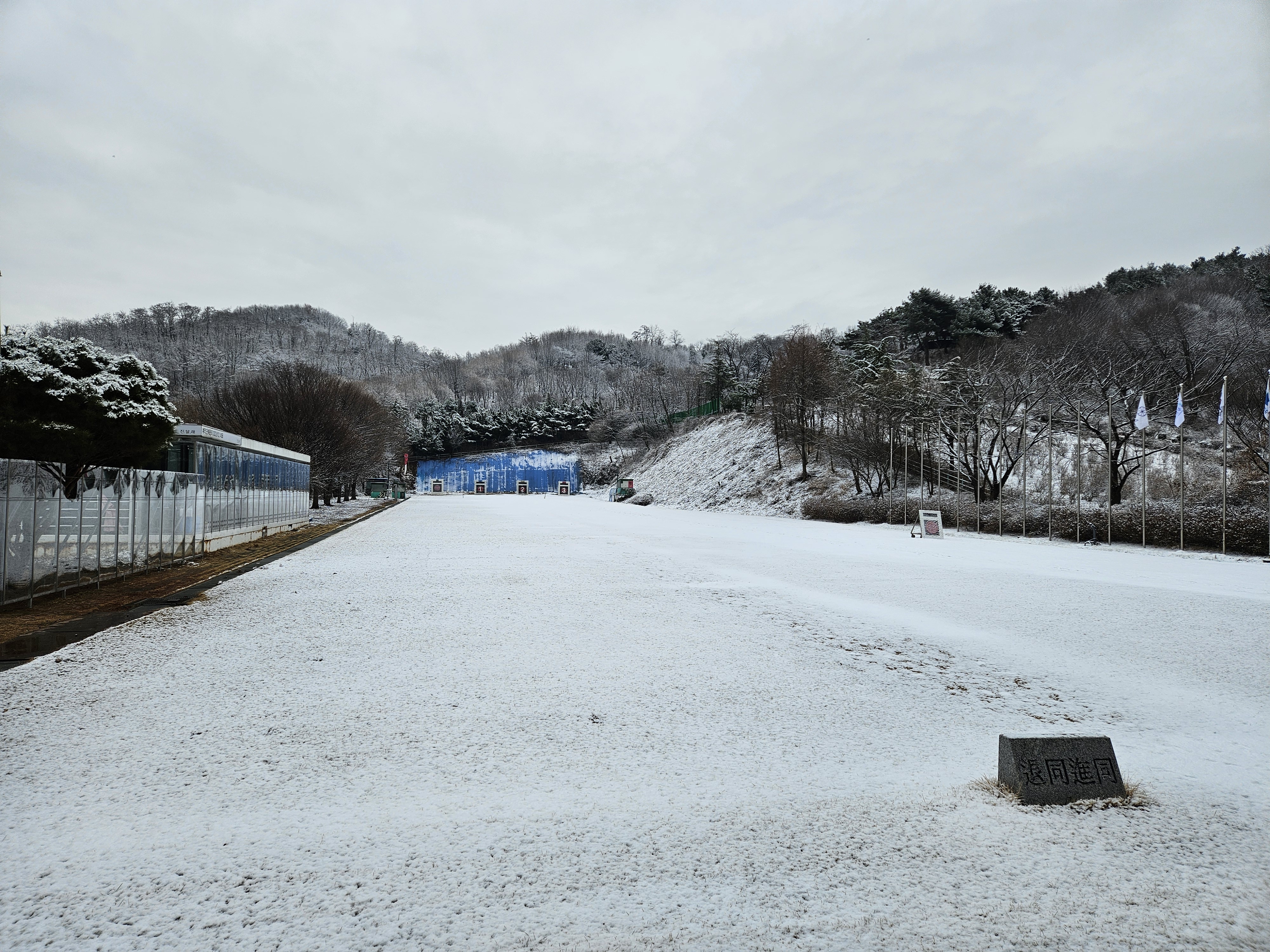 다음날 아침에 오른 활터와 산에는 하이얀 눈이 수북히 쌓여 겨울의 경관을 연출하고있다.