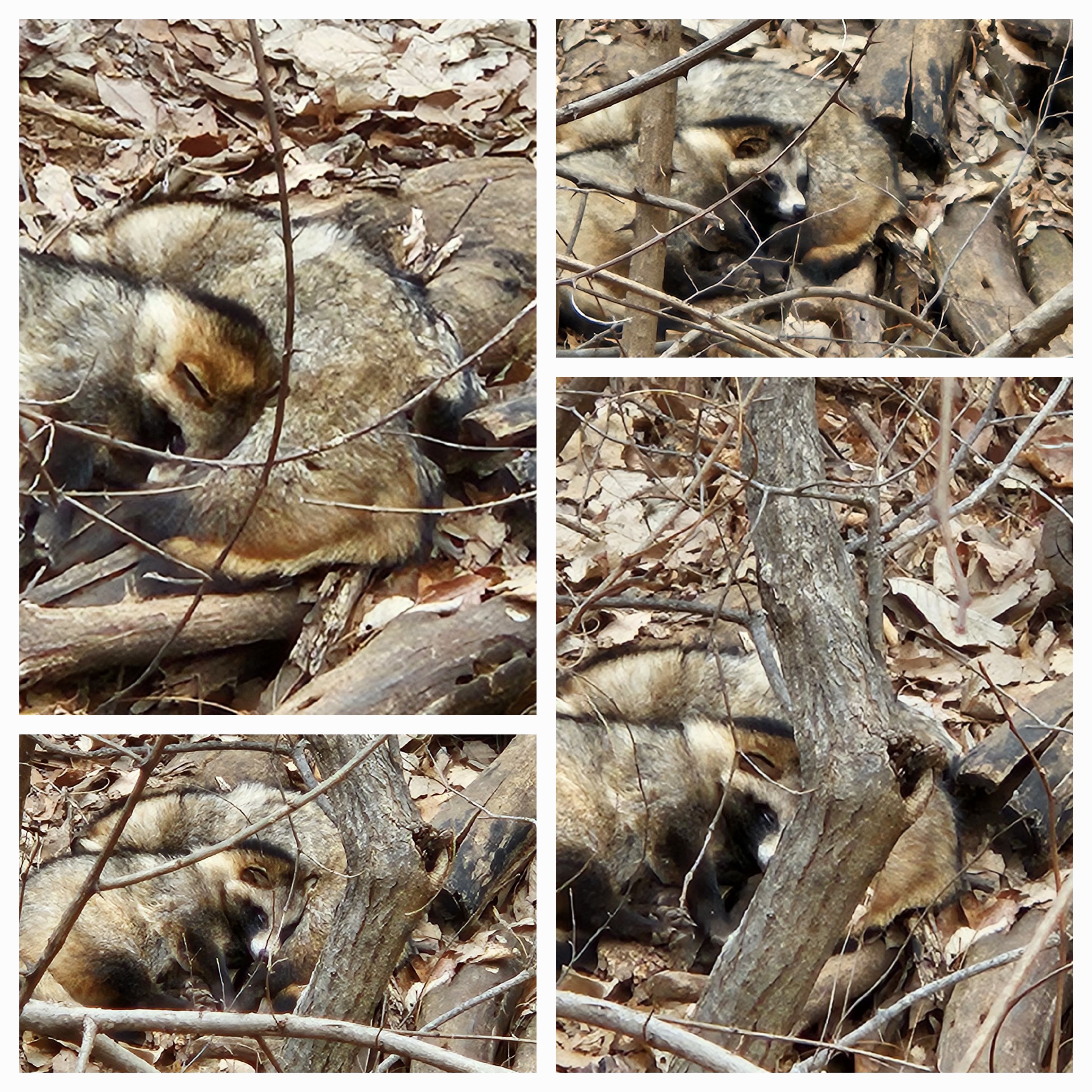 어느순간 사람들이 무언가를 쳐다보길래 바라보니 너구리 두마리가 양지녘에 웅크리고 잠을 자는가보다.