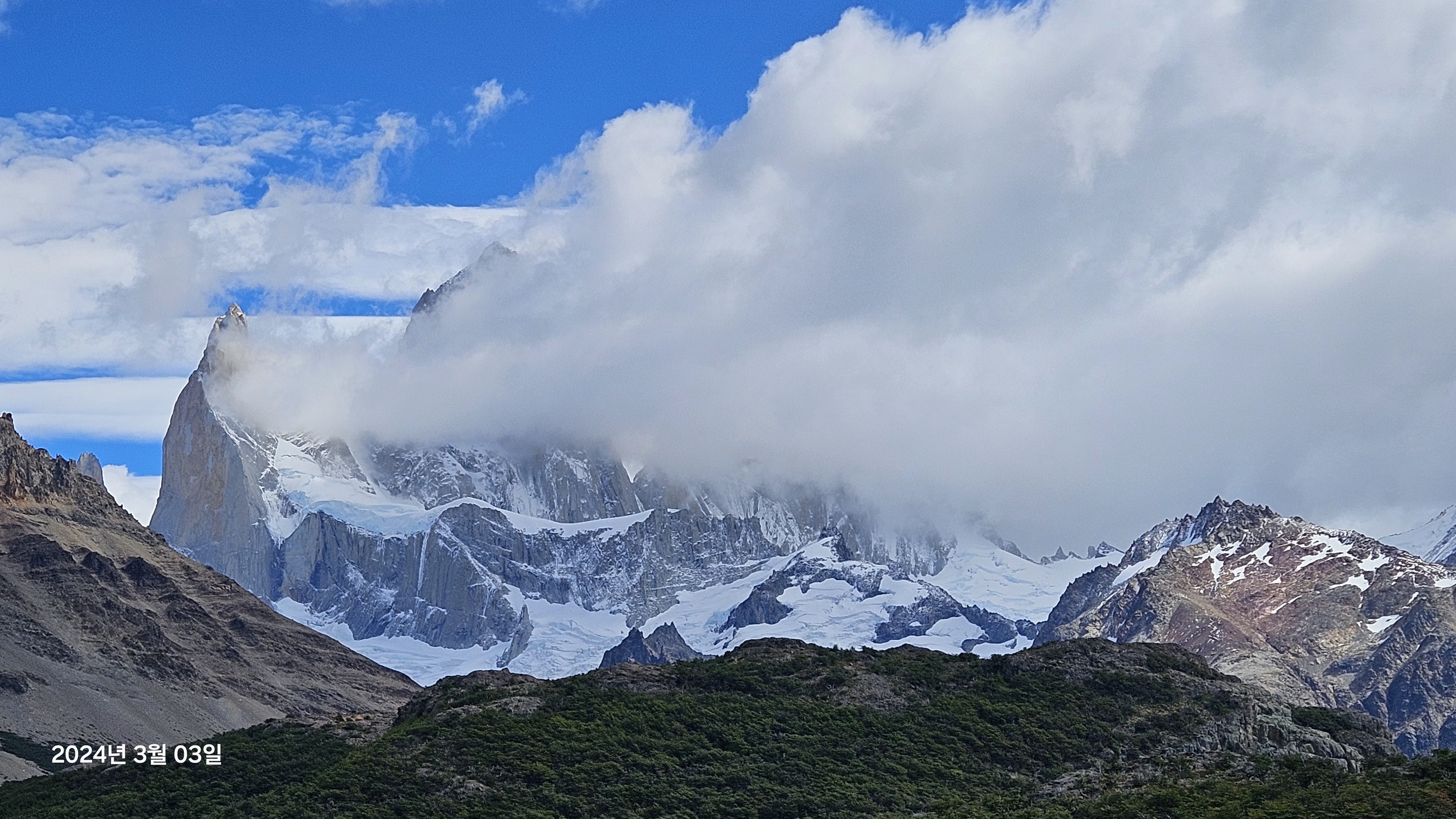 피츠로이정상부가 구름에 가려 보일듯 말듯하며 눈앞에 서있다.