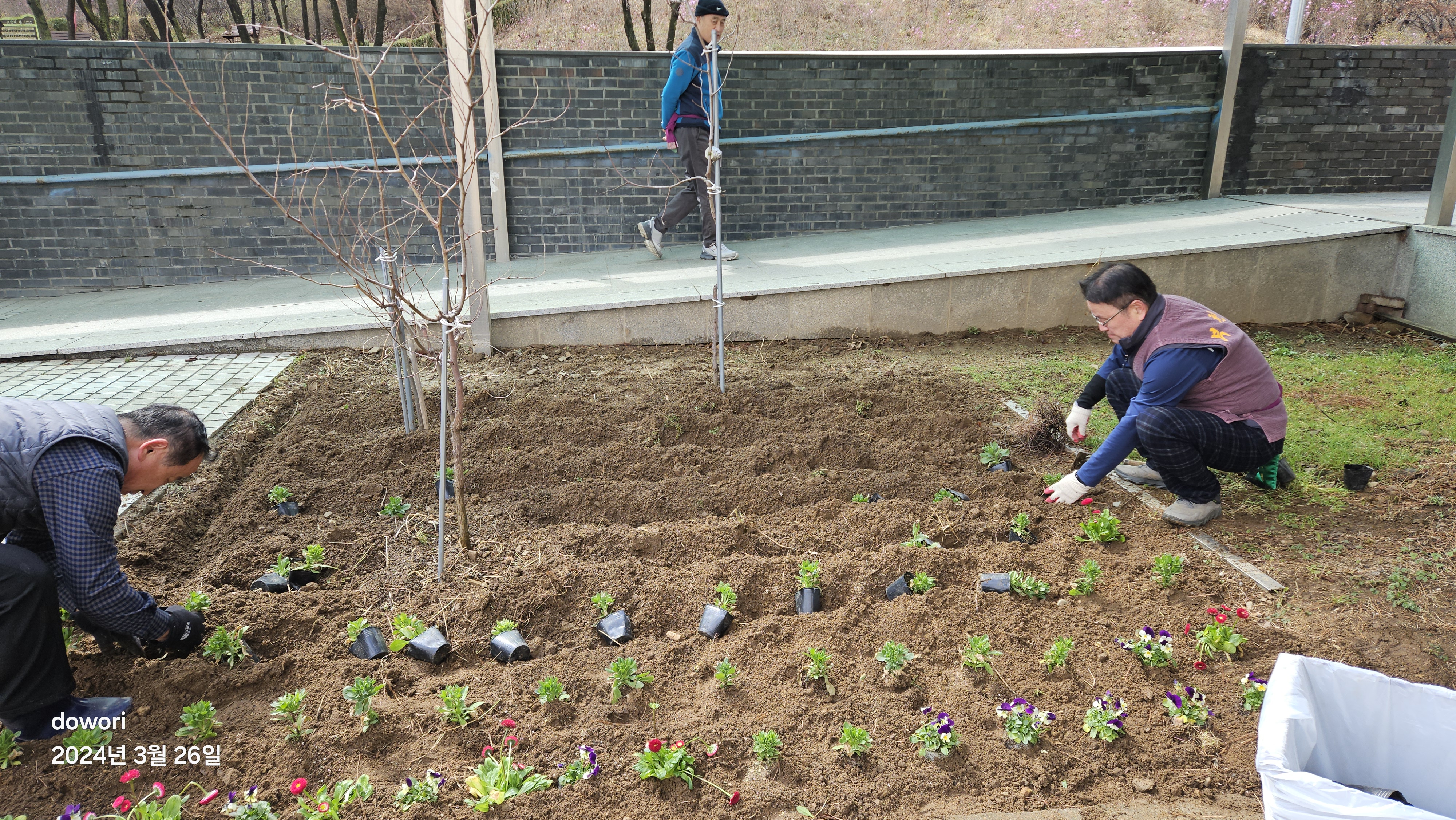 시 종묘장으로 가서 꽃모종 3판을 가득 얻어 활터의 빈 공간에 심는다.