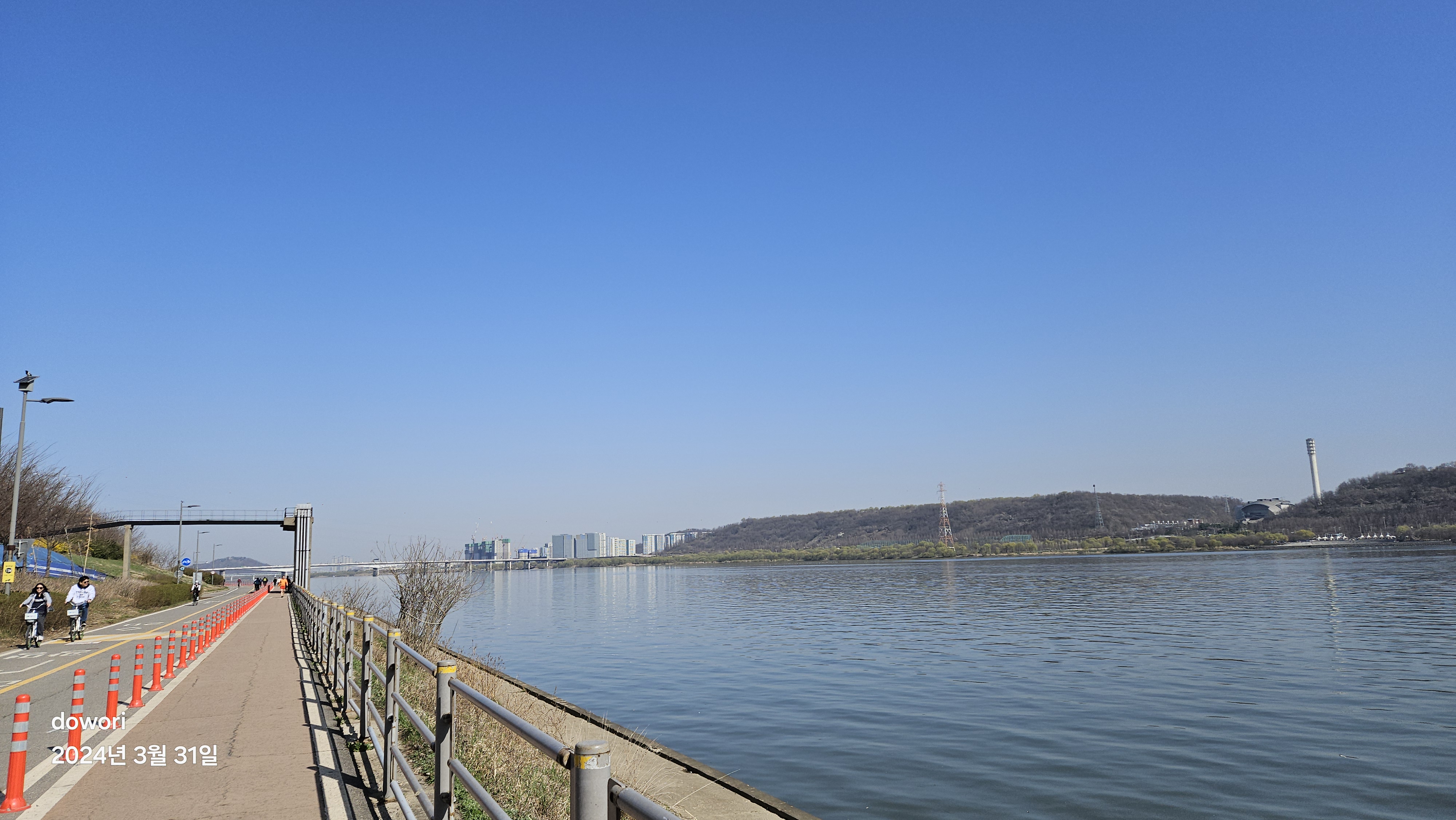 휴일이라 많은 사람들이 산책이나 운동을 나왔고,강변 곳곳에는 개나리와 각종 봄꽃과