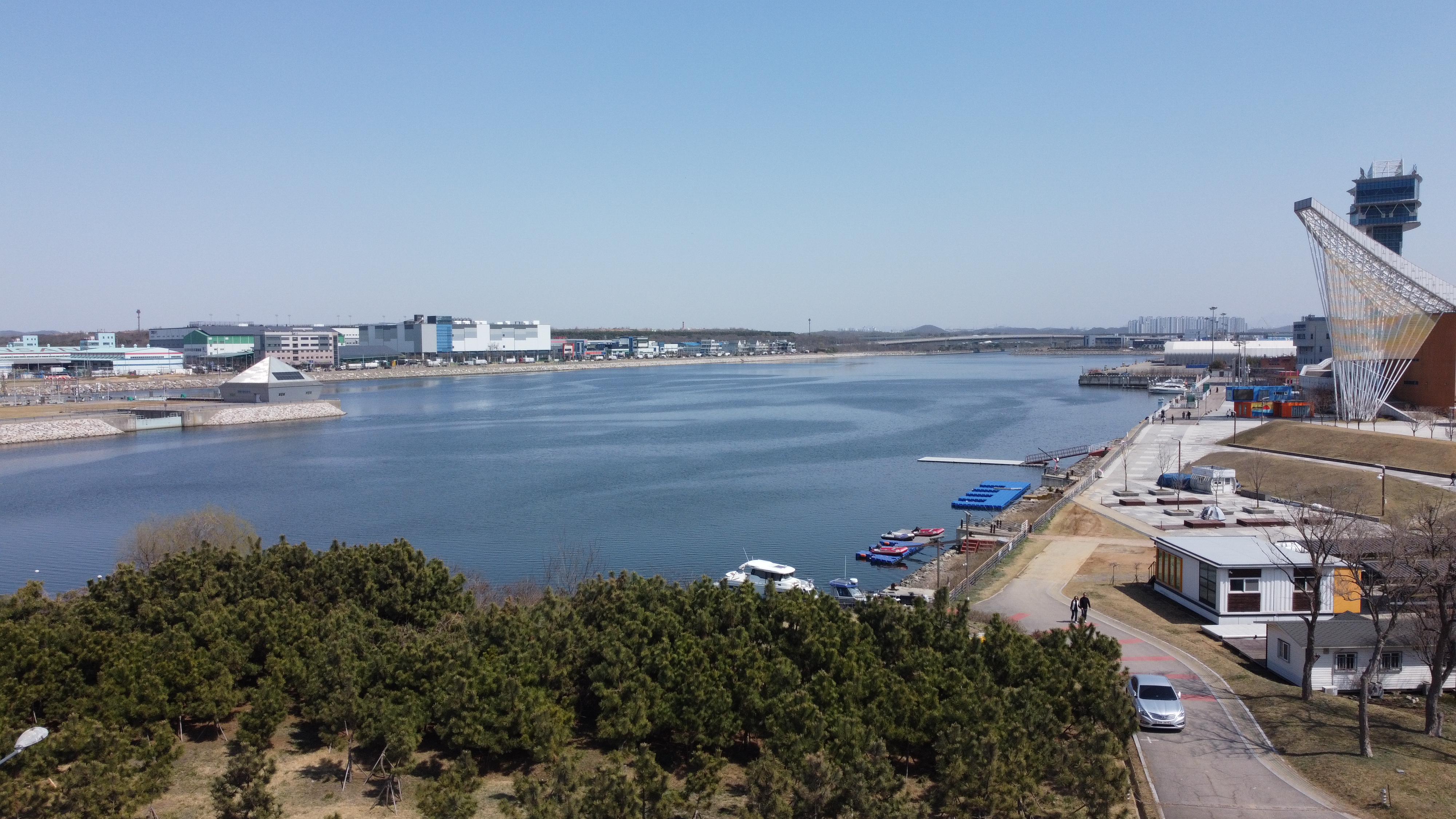 계양대교를 지나니 엉덩이가 슬슬 아파오니 잠시 벤치에 앉아 과일도 먹고 휴식을 취하며 드론을 날려본다.