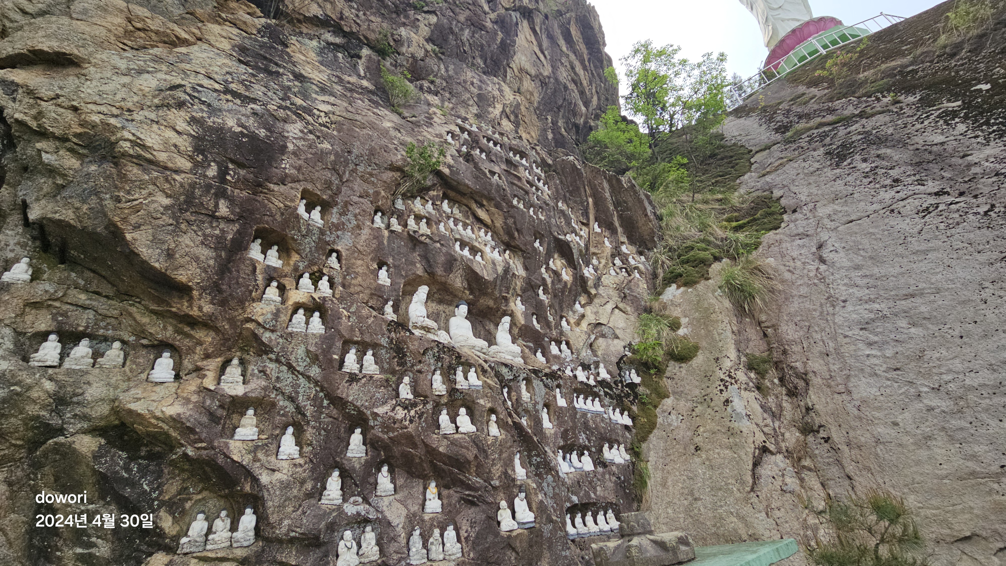 대웅전을 찾아 삼배를 드리고는 보살님의 안내로 들머리를 오르니 입구에 커다란 부처님의 입상이 우뚝서있다.