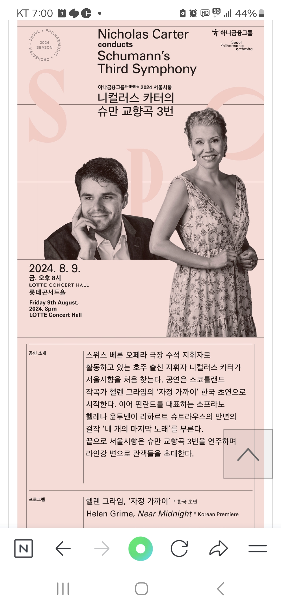 오늘의 SPO공연은 니콜라스 카터 지휘의 슈만교향곡3번을 위주이다.