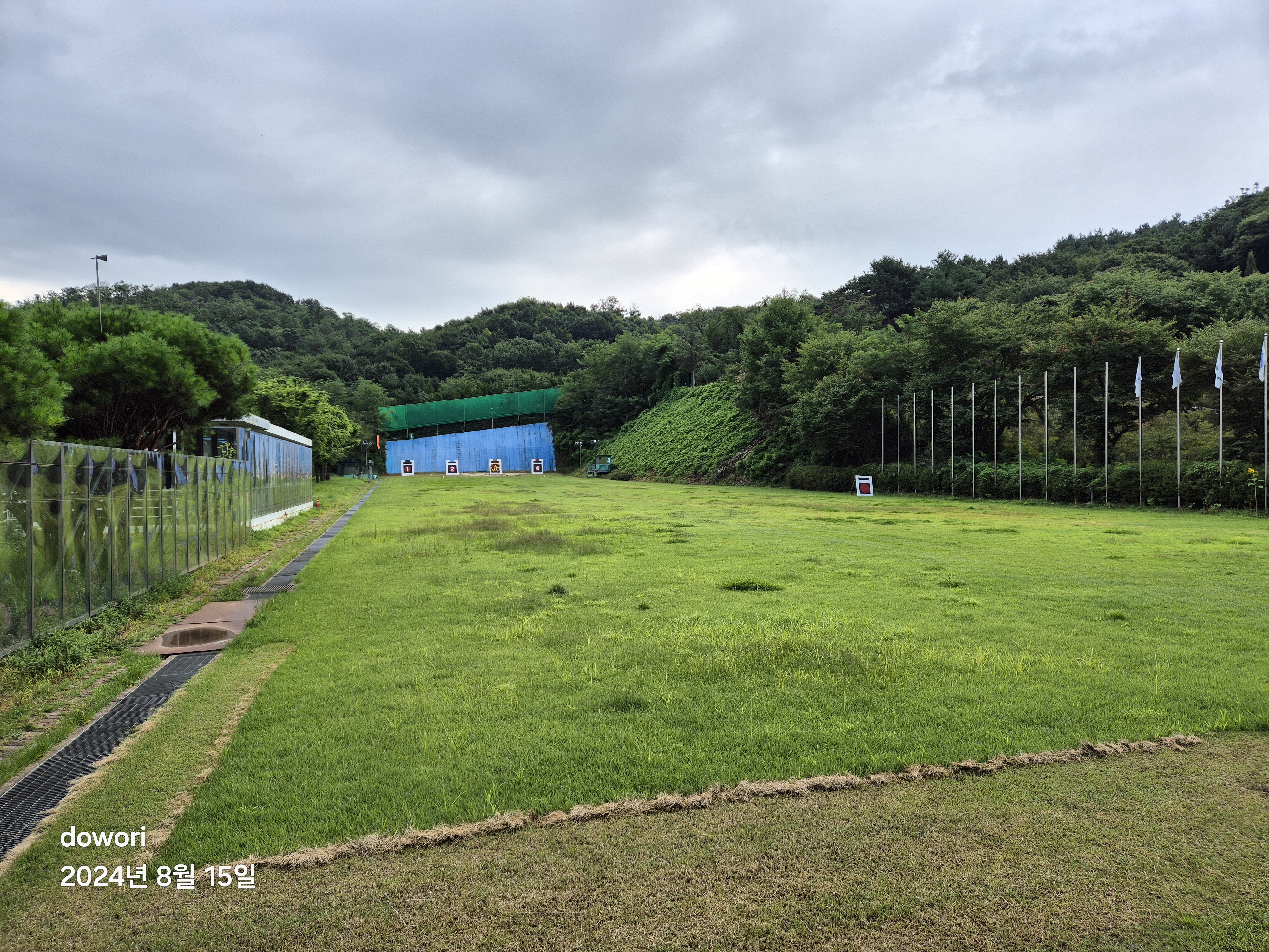아침에 활터에 오르니 습하고 무더운 날이라 사대에 물을 뿌려