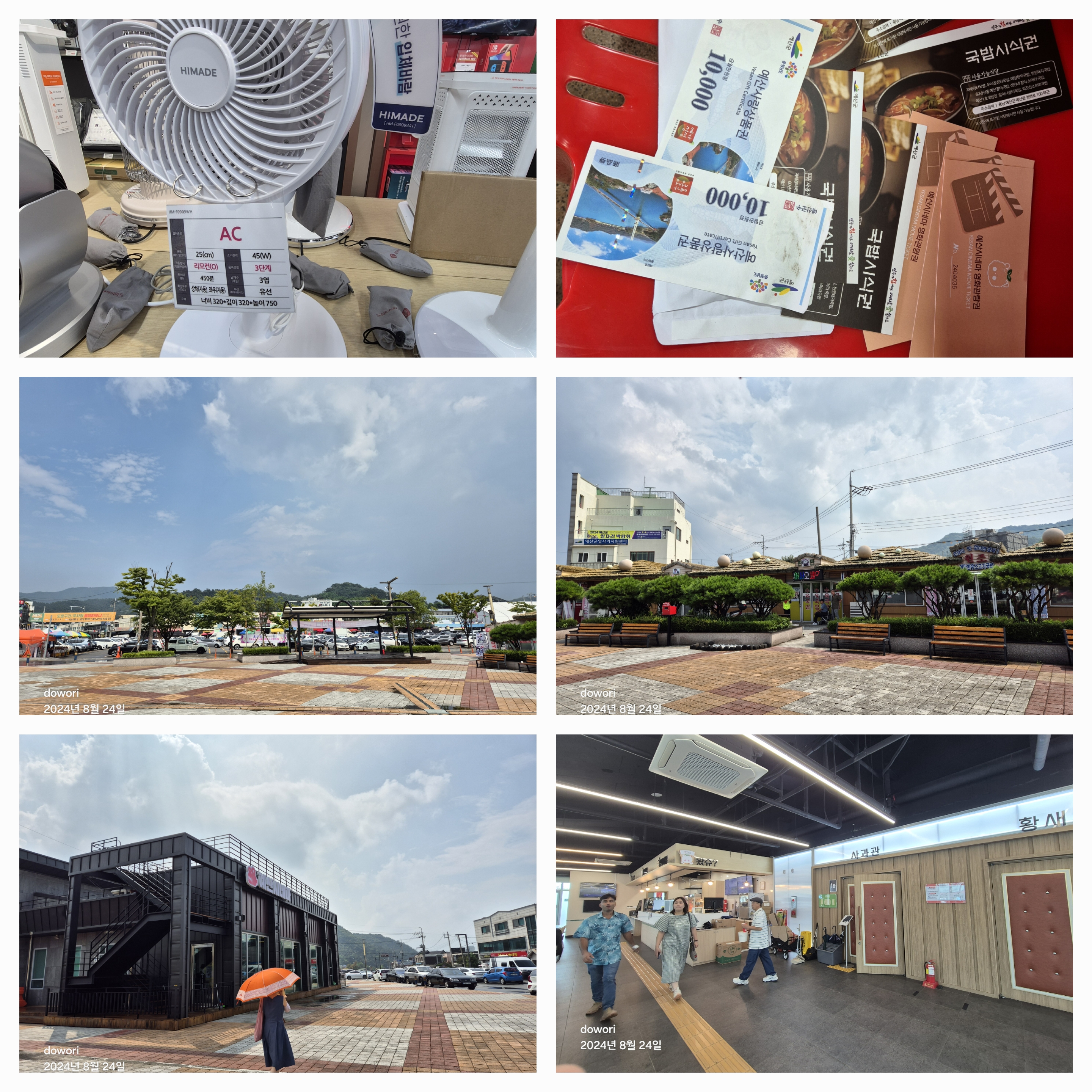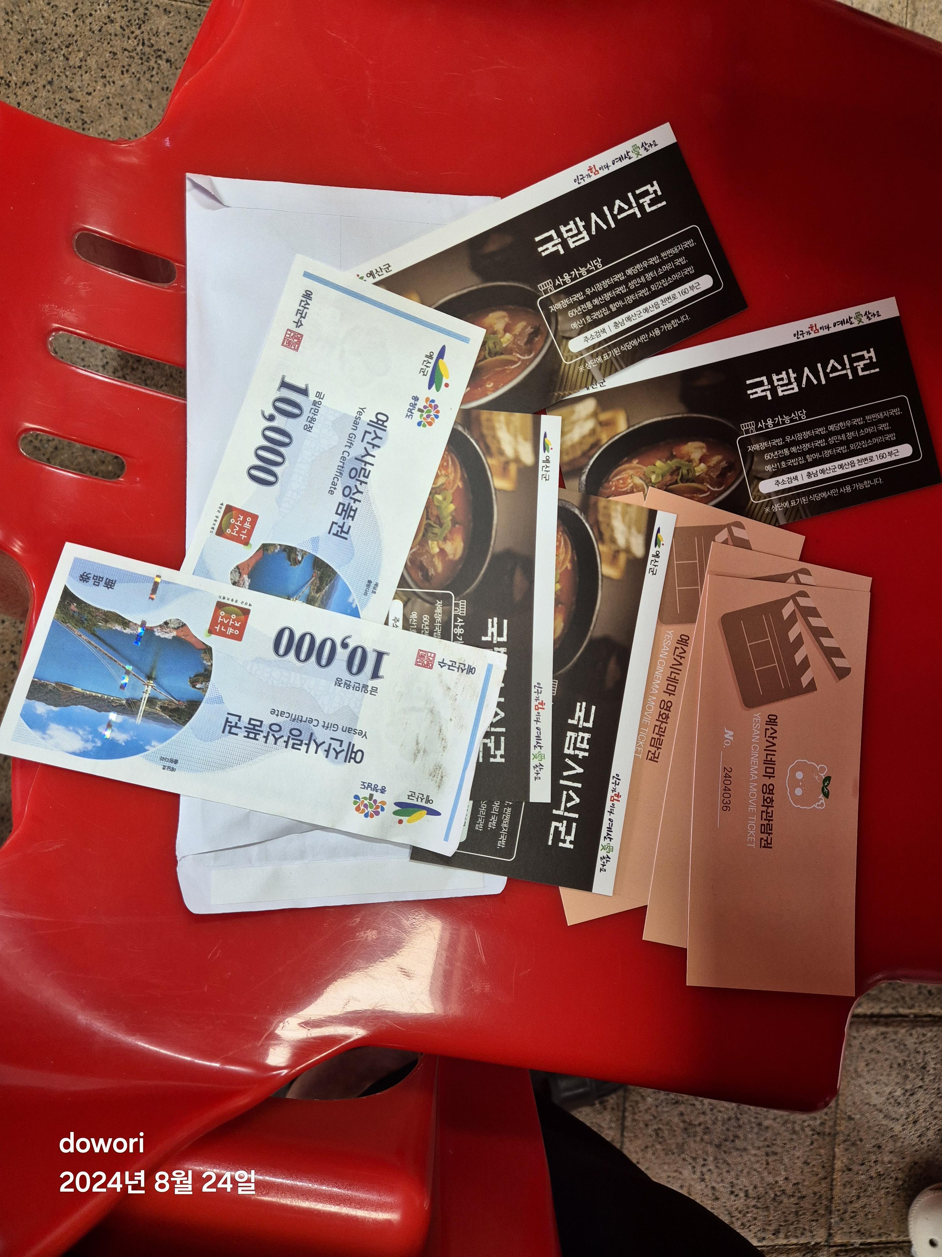 쓰레기봉투60매와 영화티켓2매,예산시장 식당의 국밥티켓2매,상품권1매를 각자에게