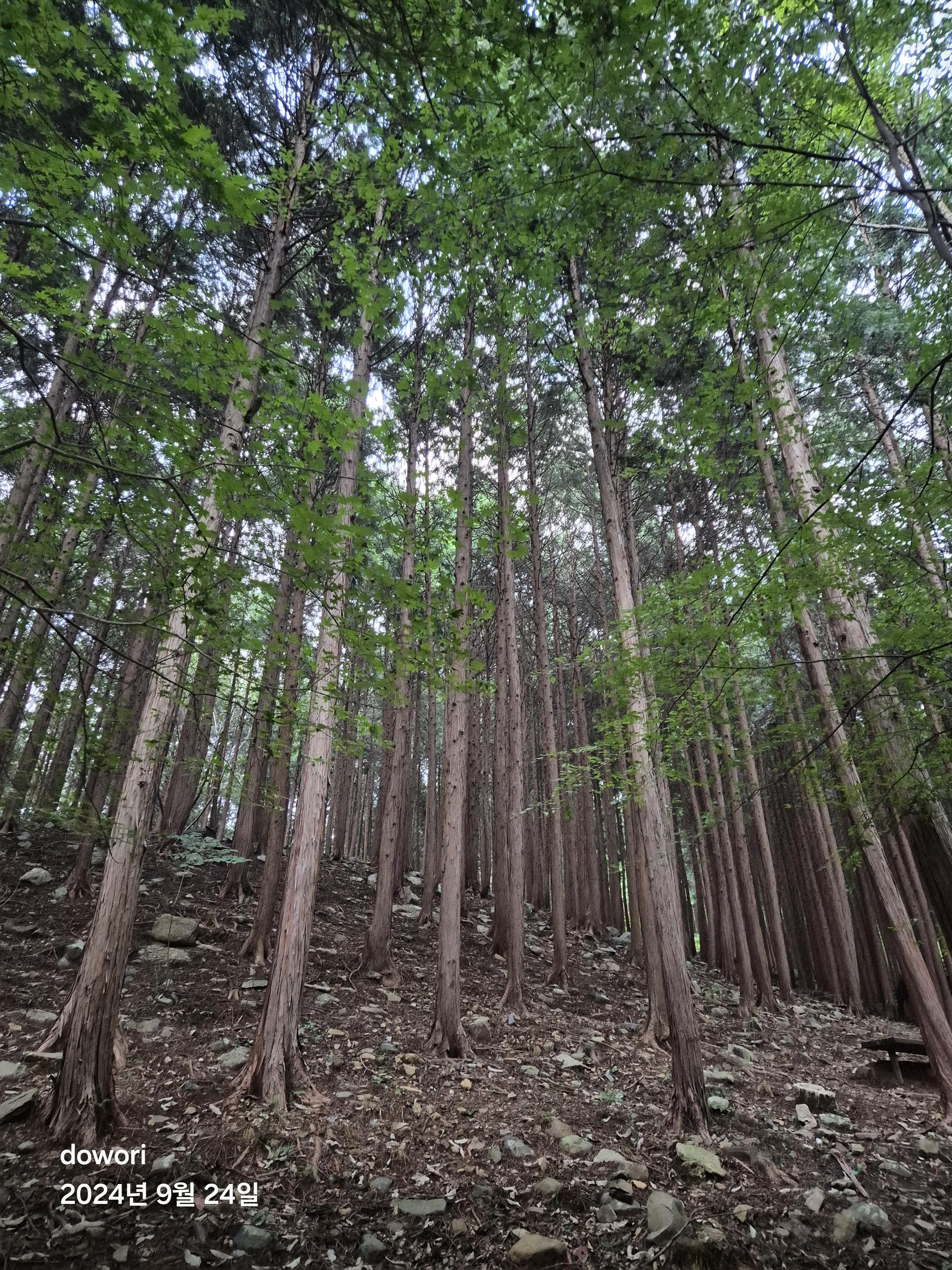 해질무렵 성주산의 편백나무숲을 한바퀴둘러보고는 술한잔을 마시는데,마트에서 준비한