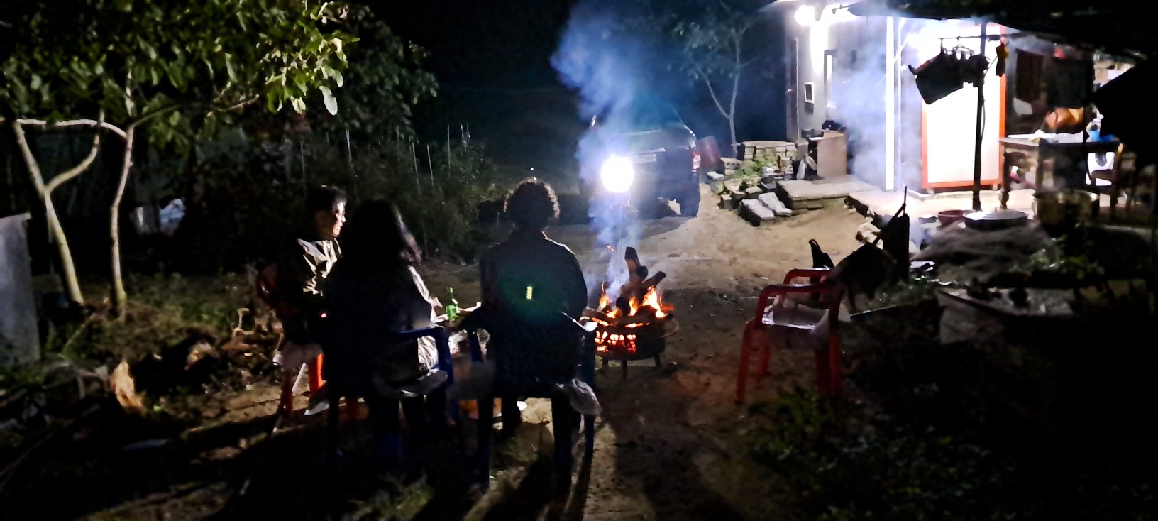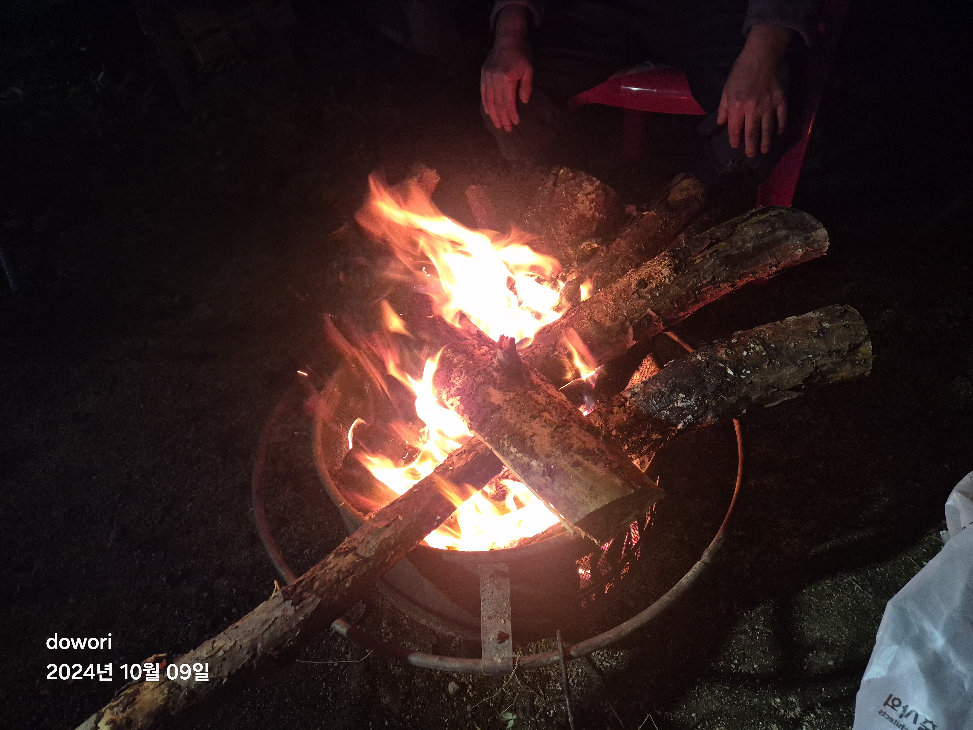 캠핑화롯대에 장작불을 피우고 준비한 회를 안주로 한잔술을 마시니