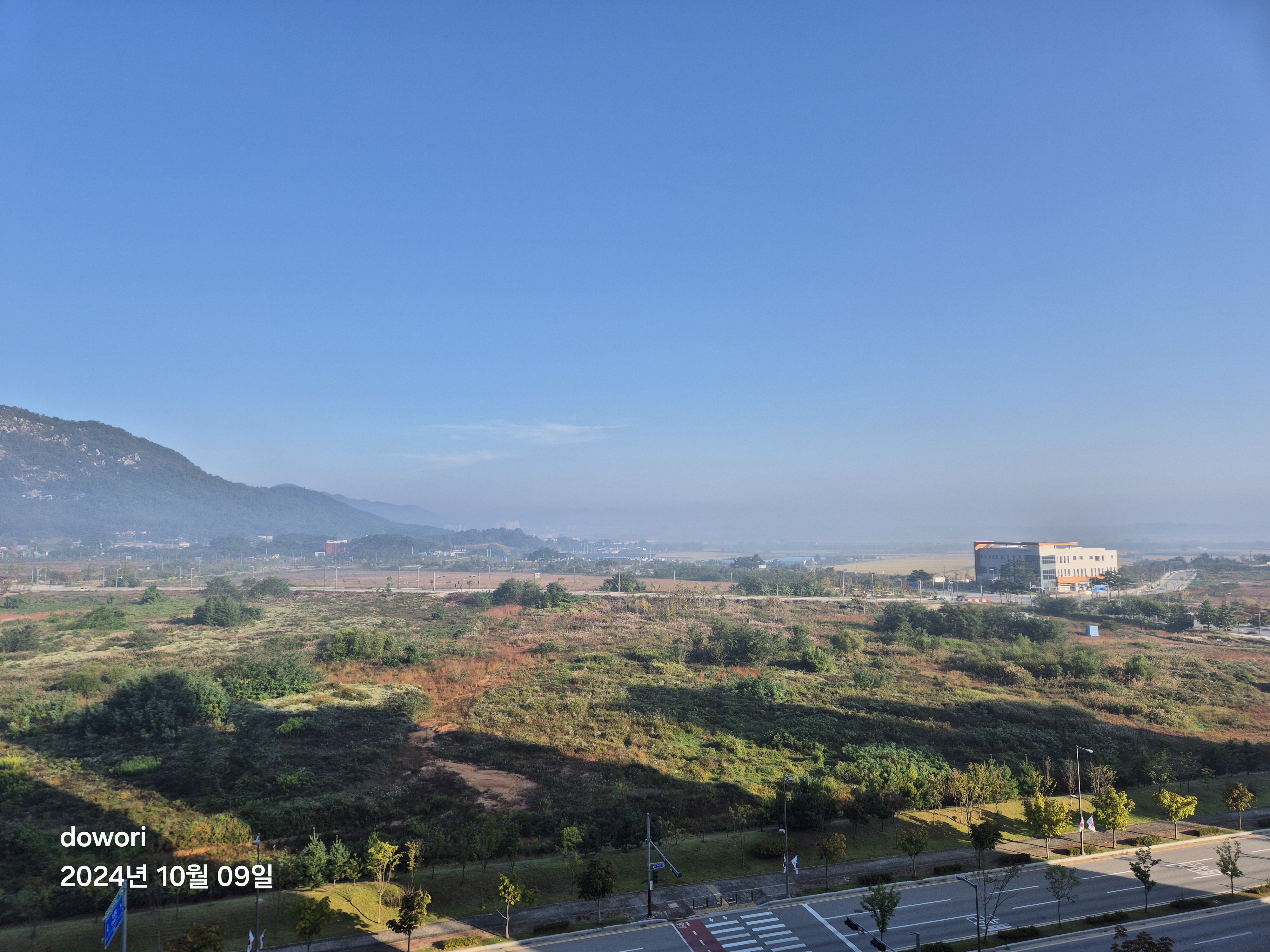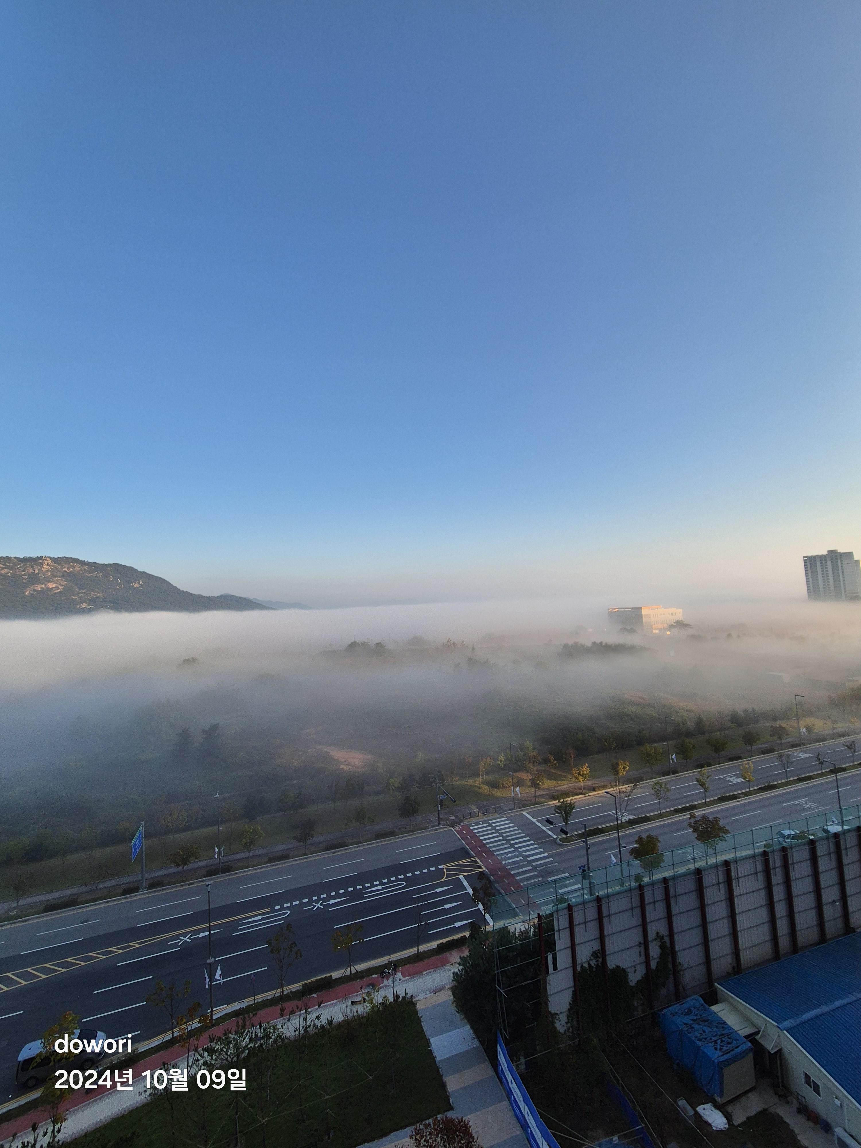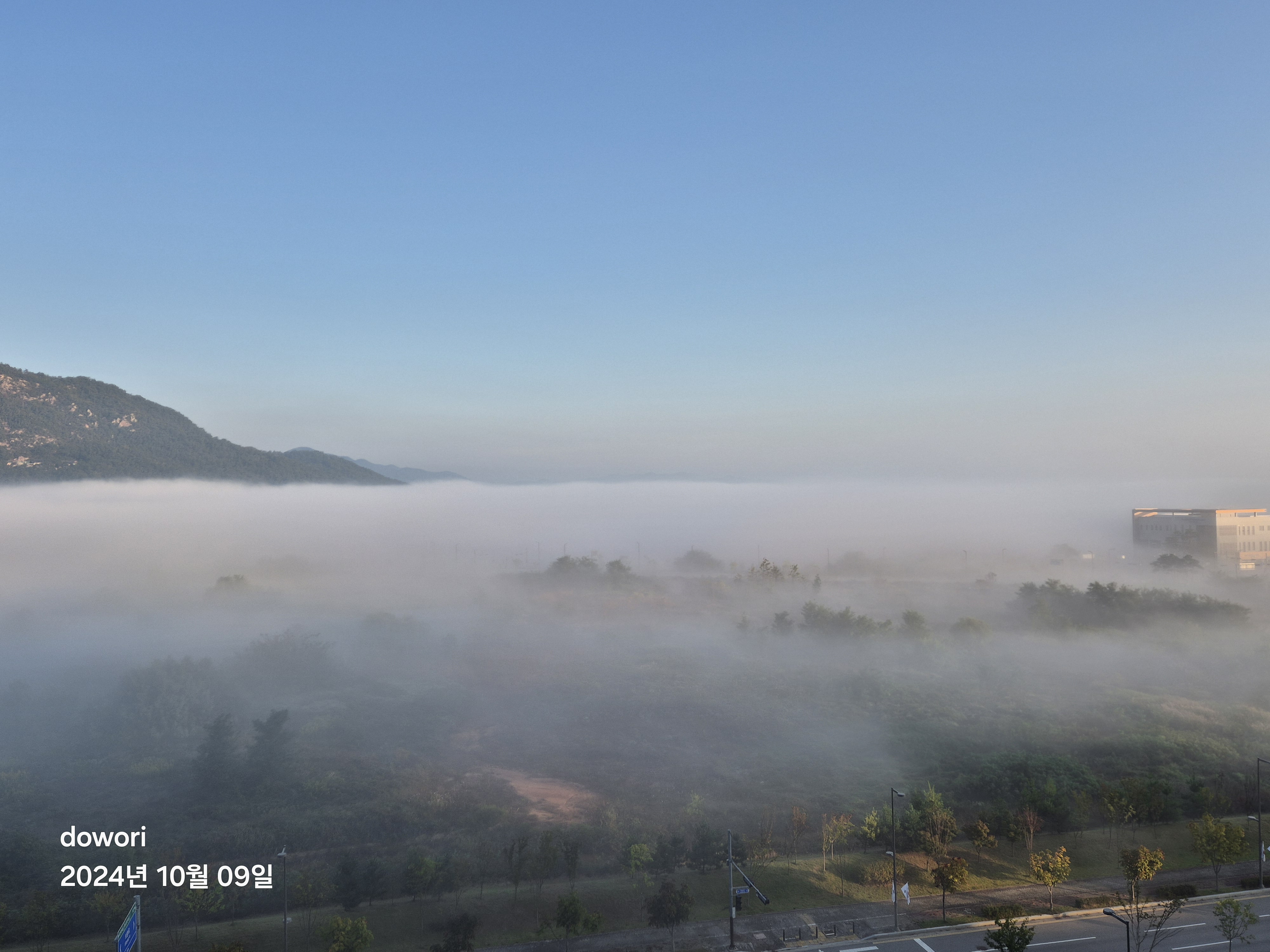 아침에 기상하니 들판에 안개가 자욱하니 드리우고있다.