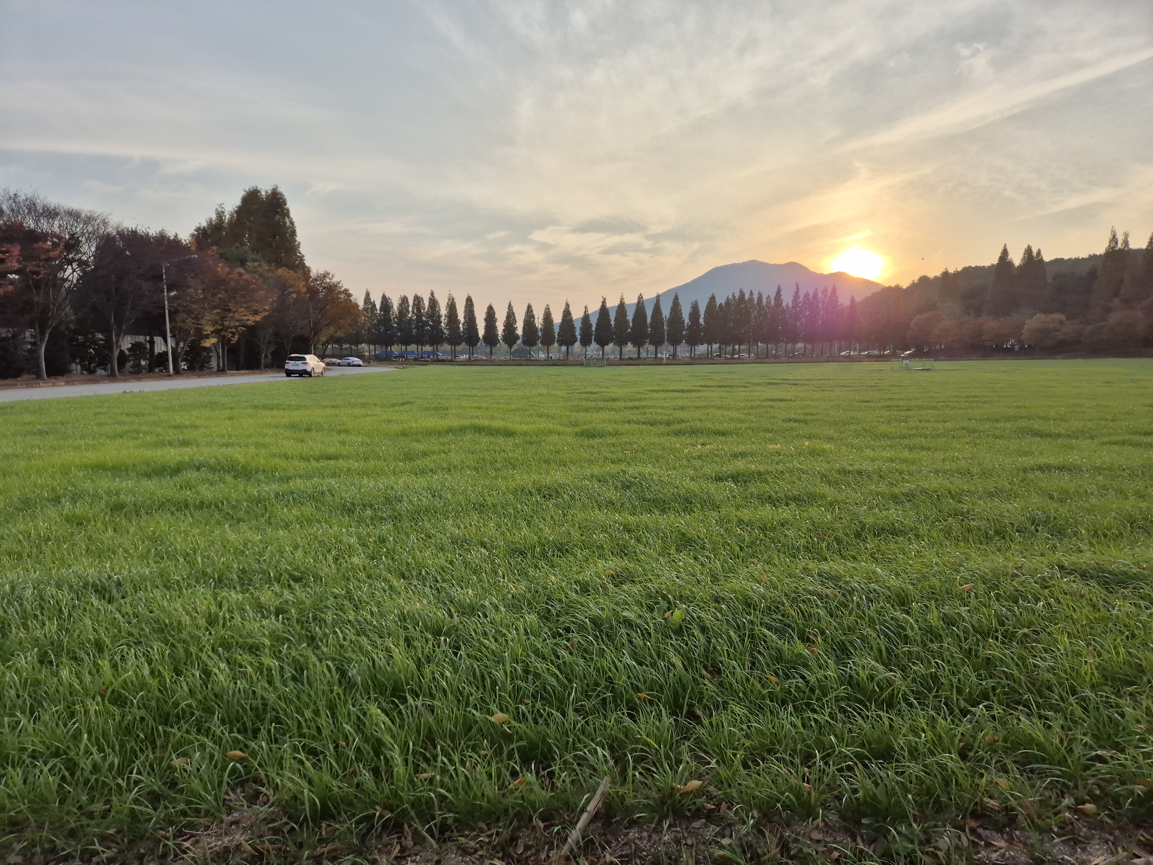 가축사료용으로 재배하는 작물의 푸르름 뒤로 서산을 넘어가는 석양의