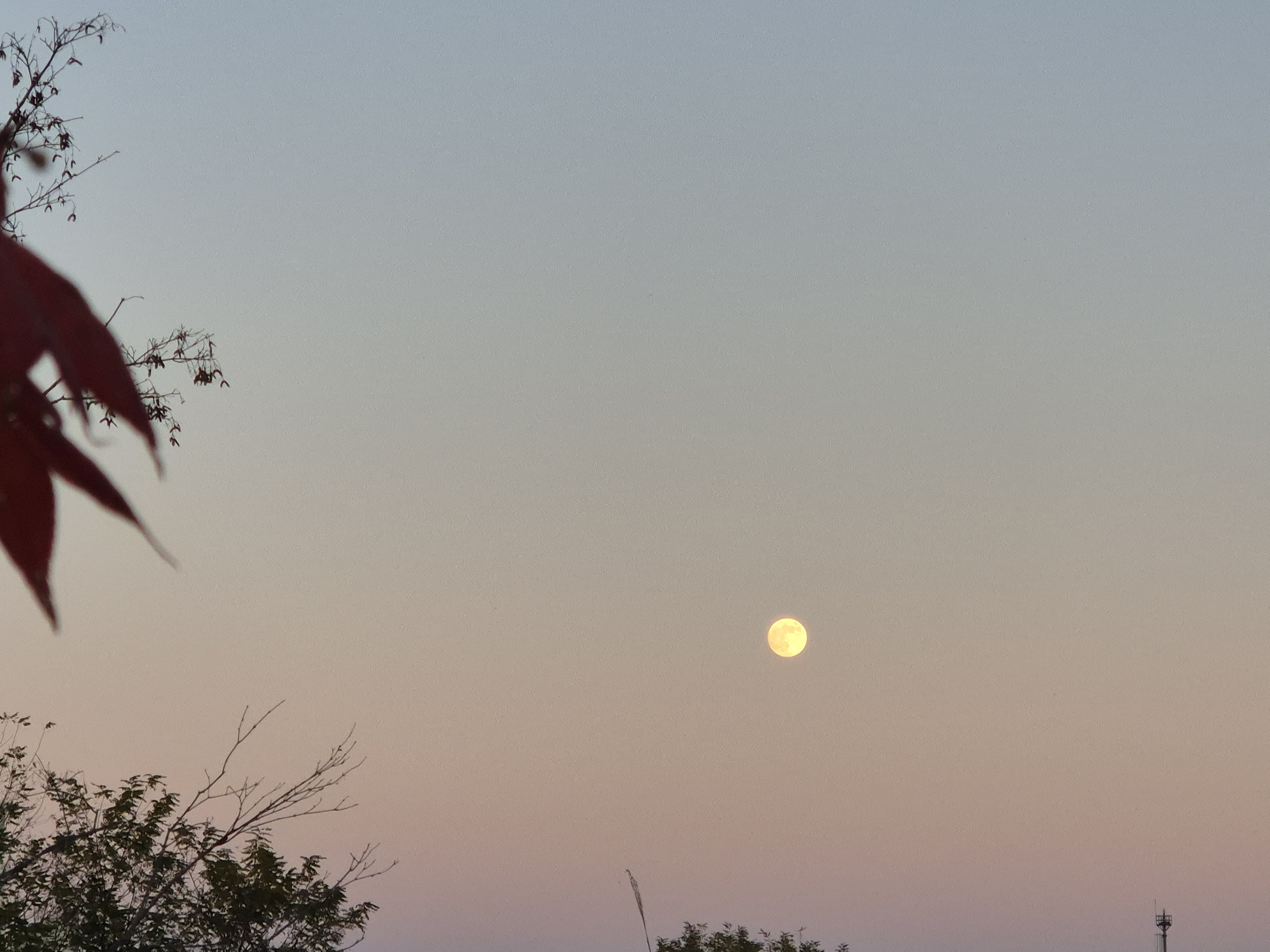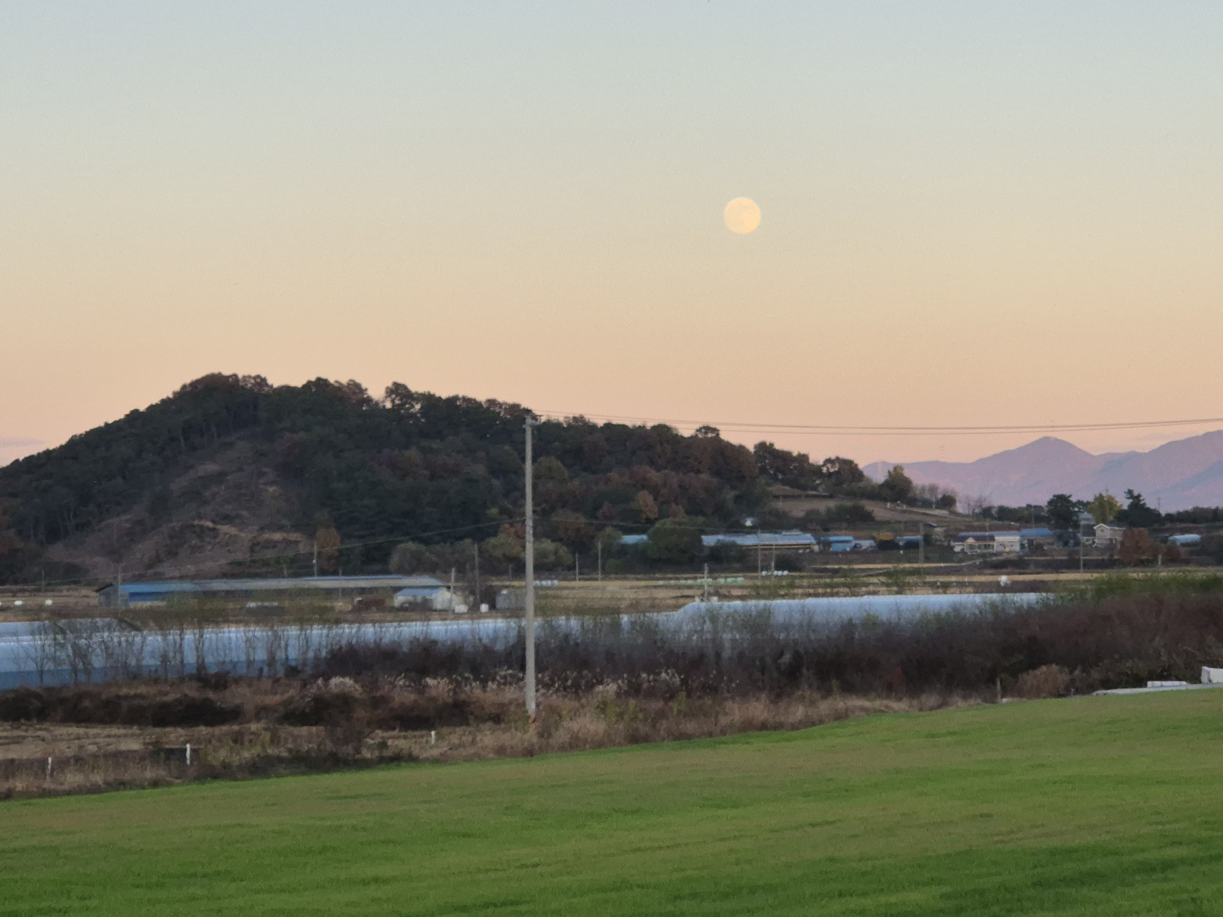 붉은 태양빛을 받으면서 산위를 지나 하늘로 떠오르는 보름달...보름이다.