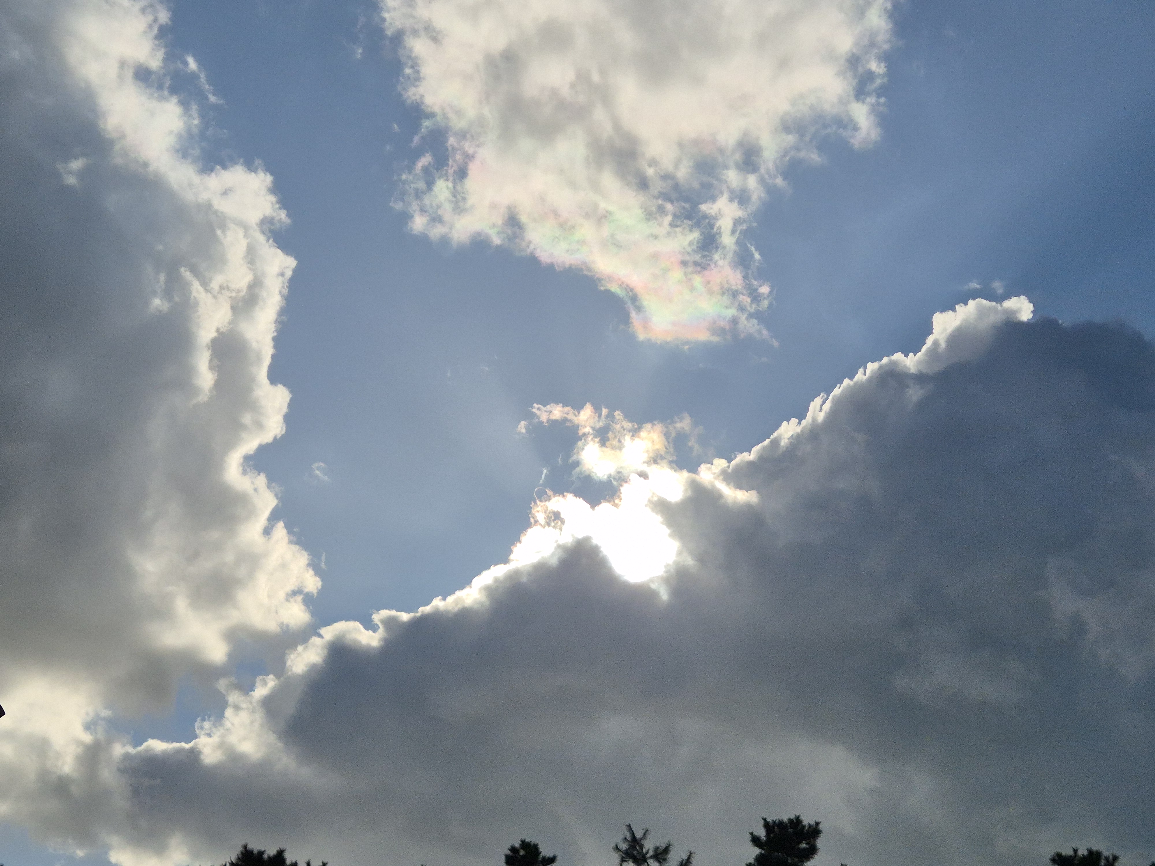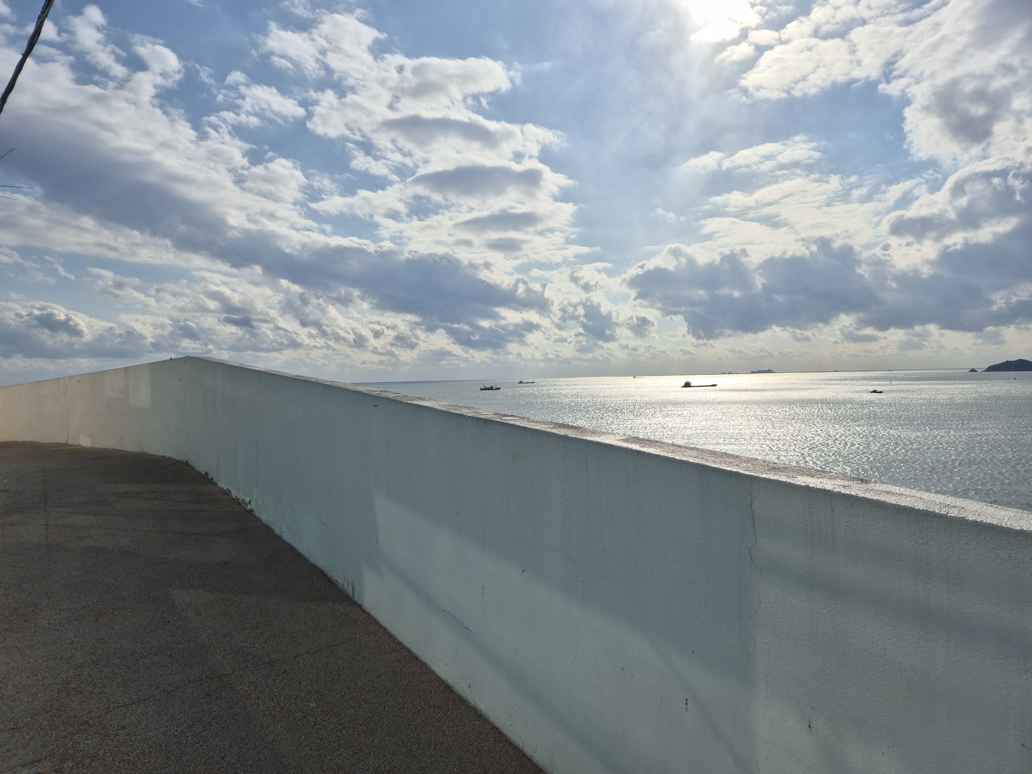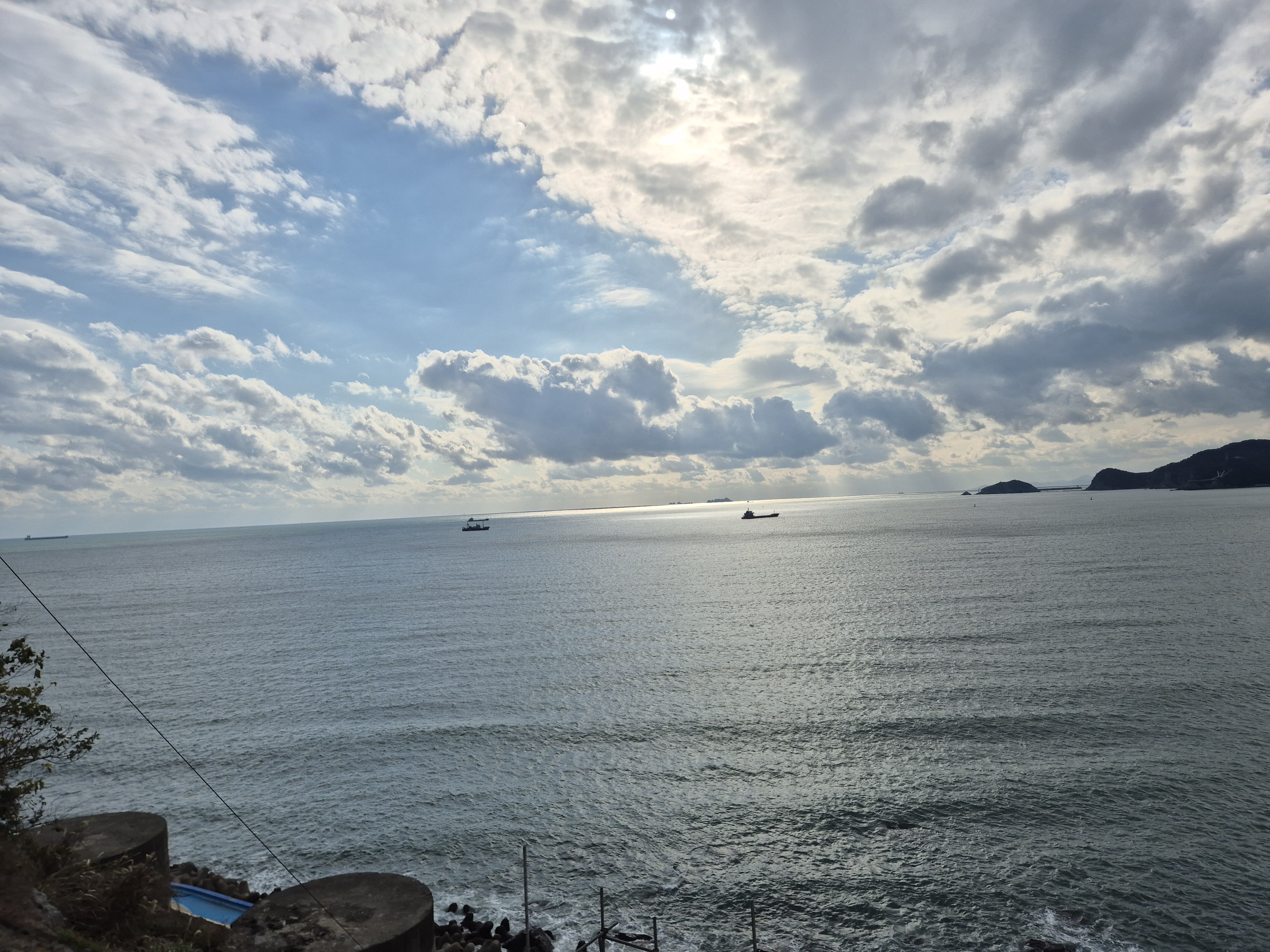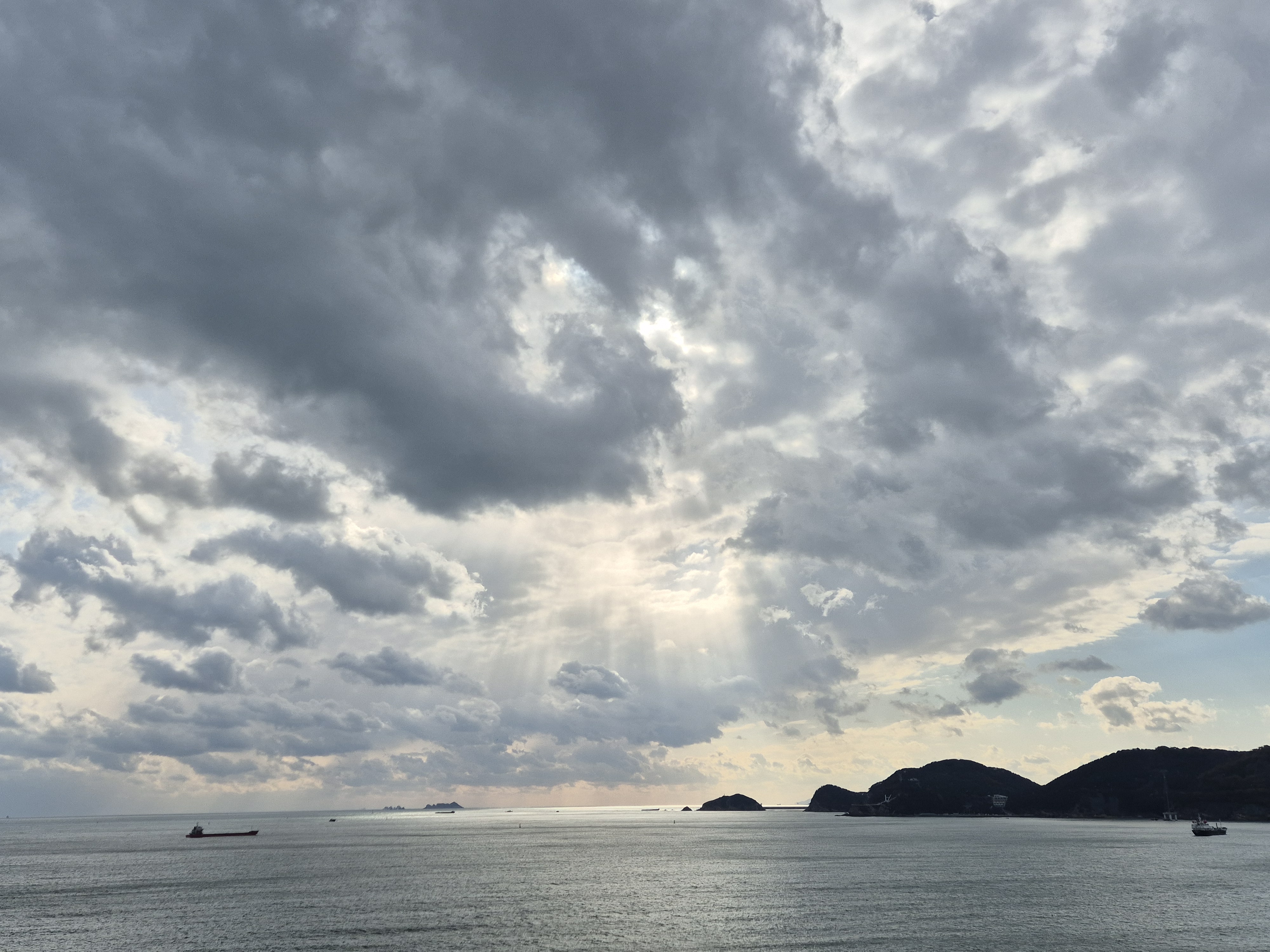 구름사이로 내리 비치는 햇살과 넓은 바다와 윤슬....