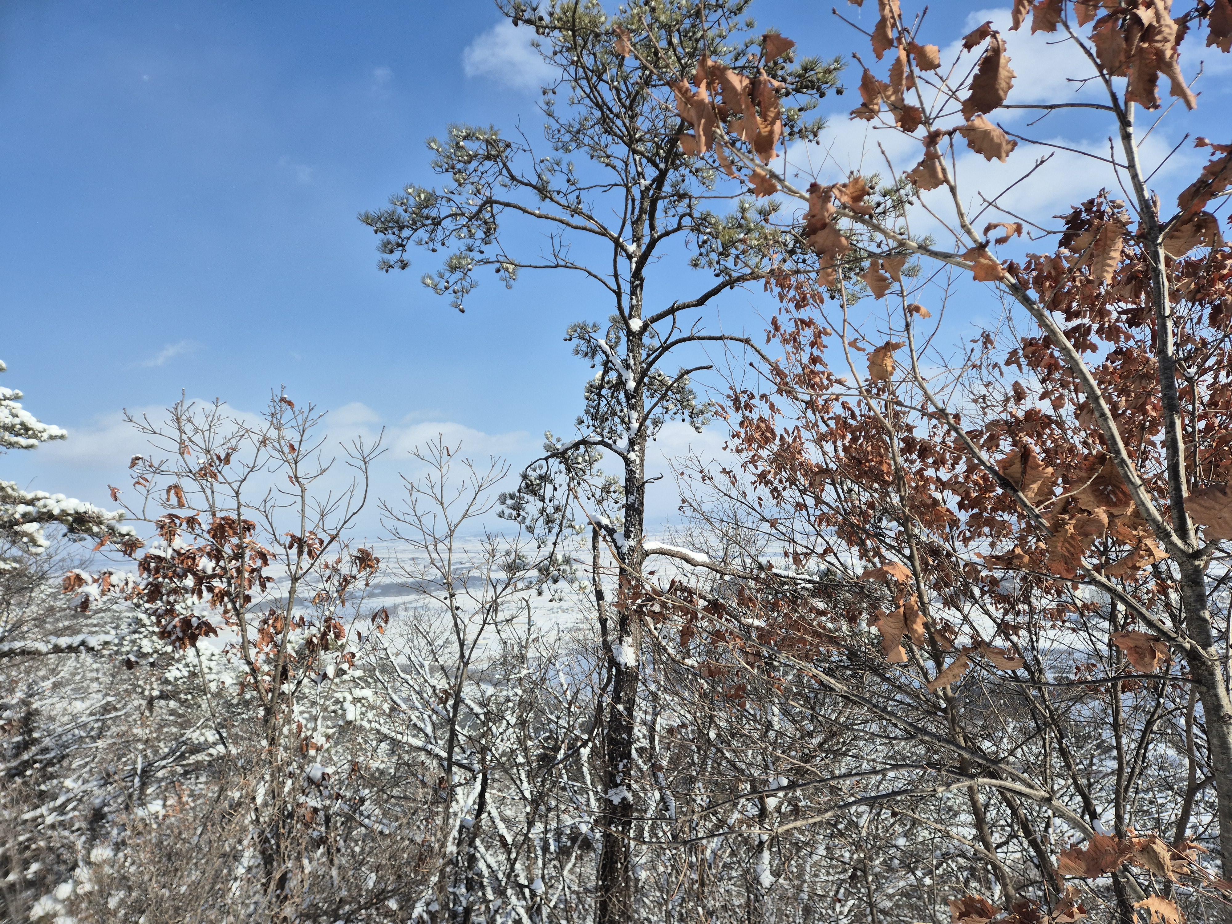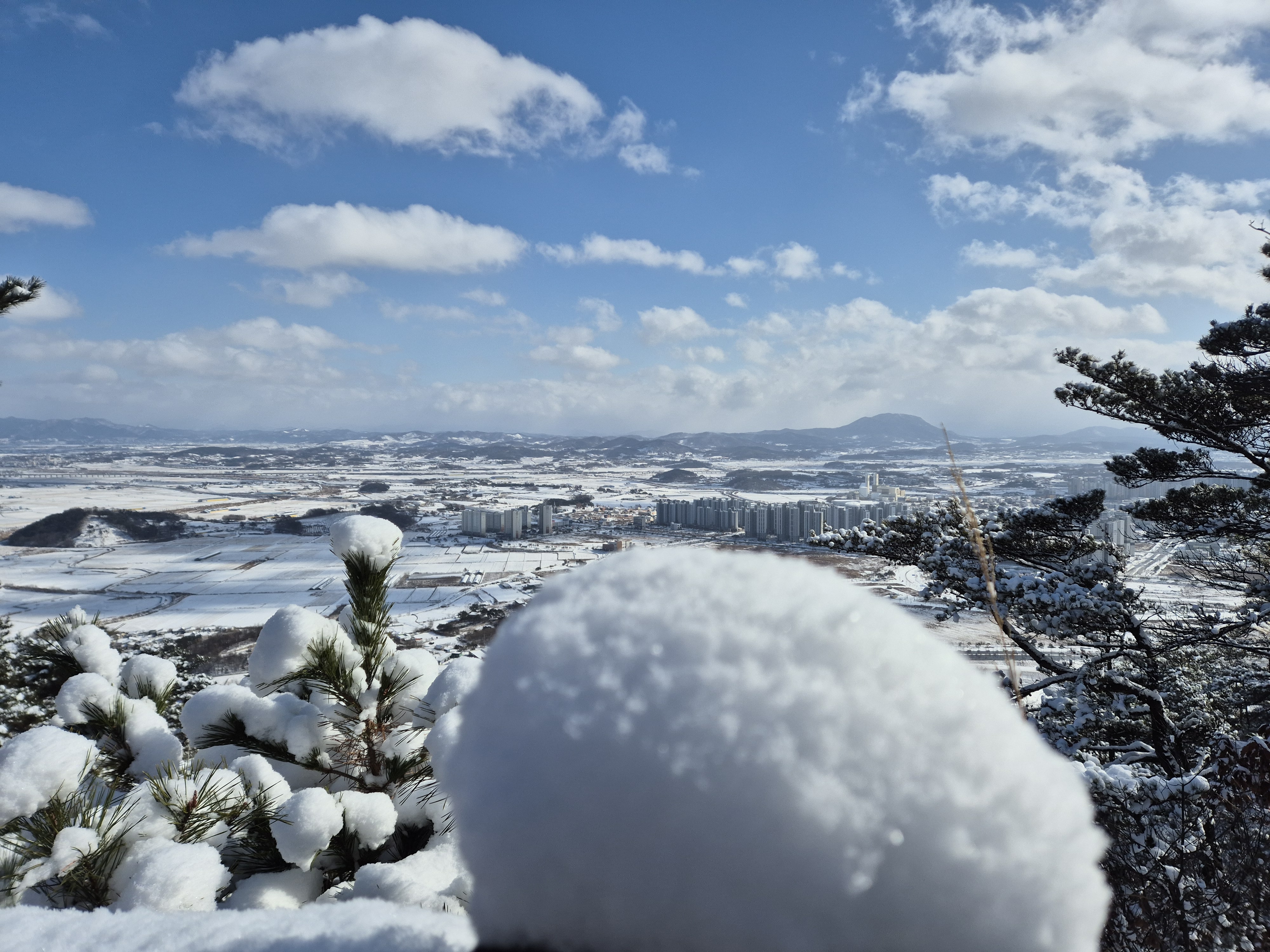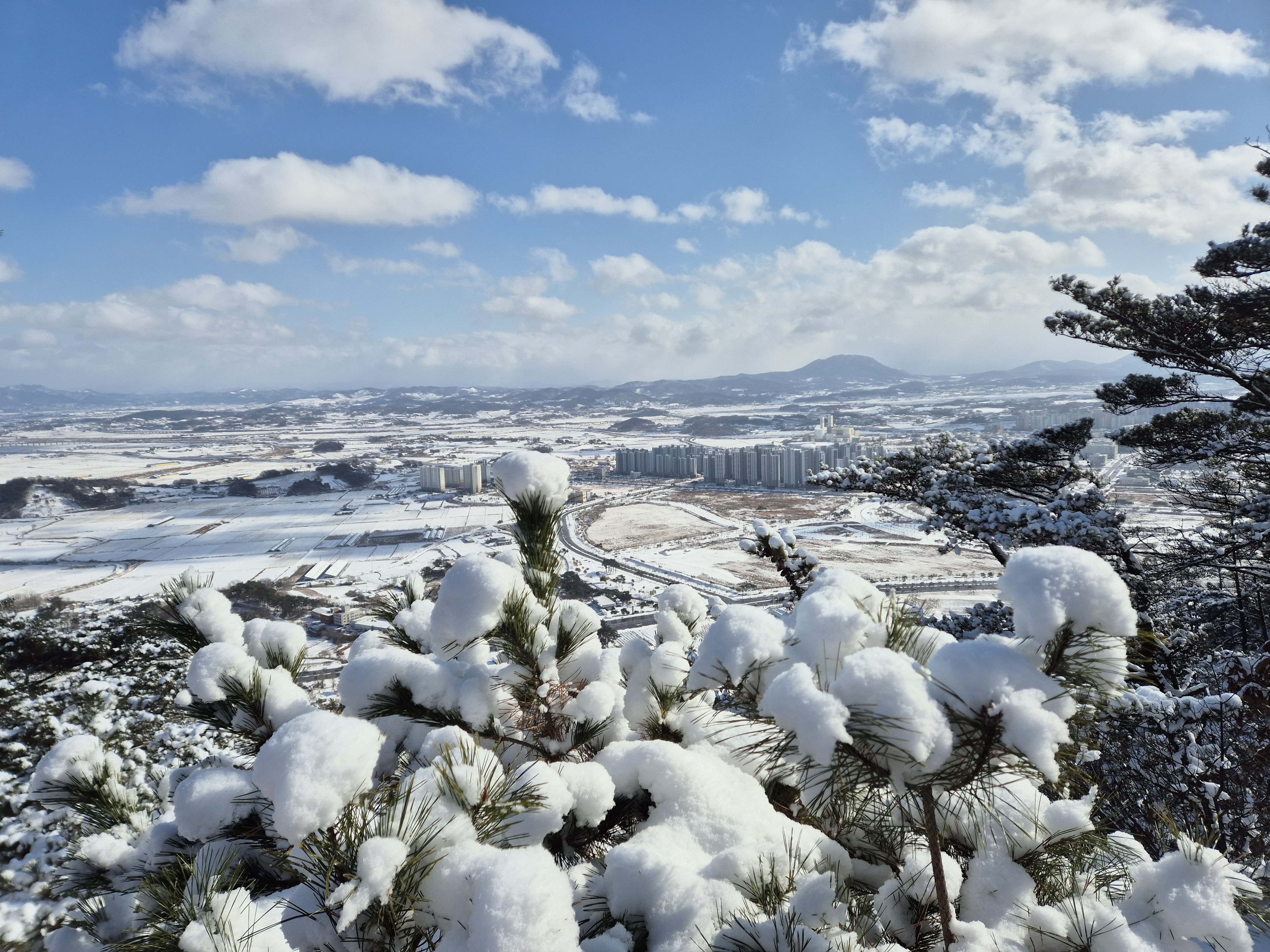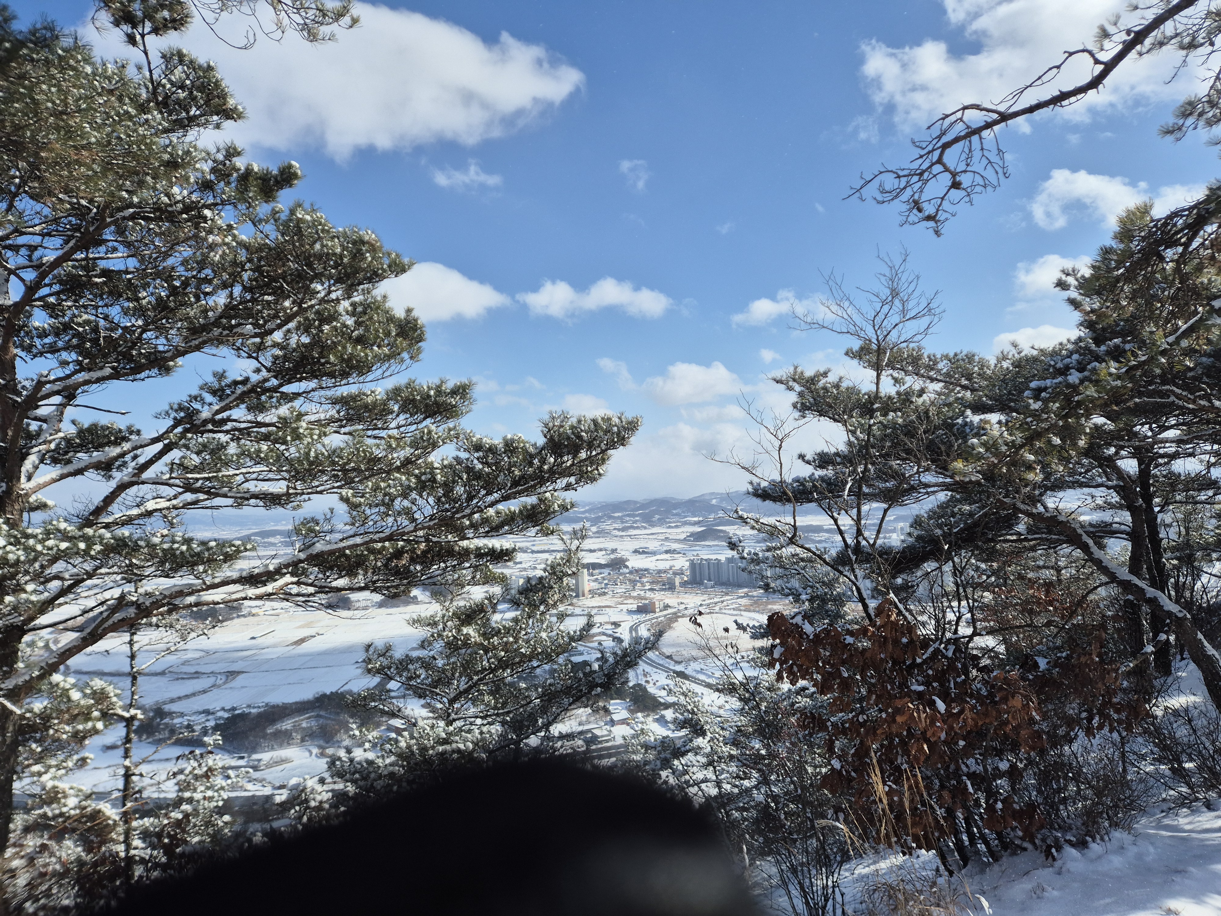 맞은편의 가야산과 멀리보이는 봉수산도 흰눈으로 뒤덮혀 있다.