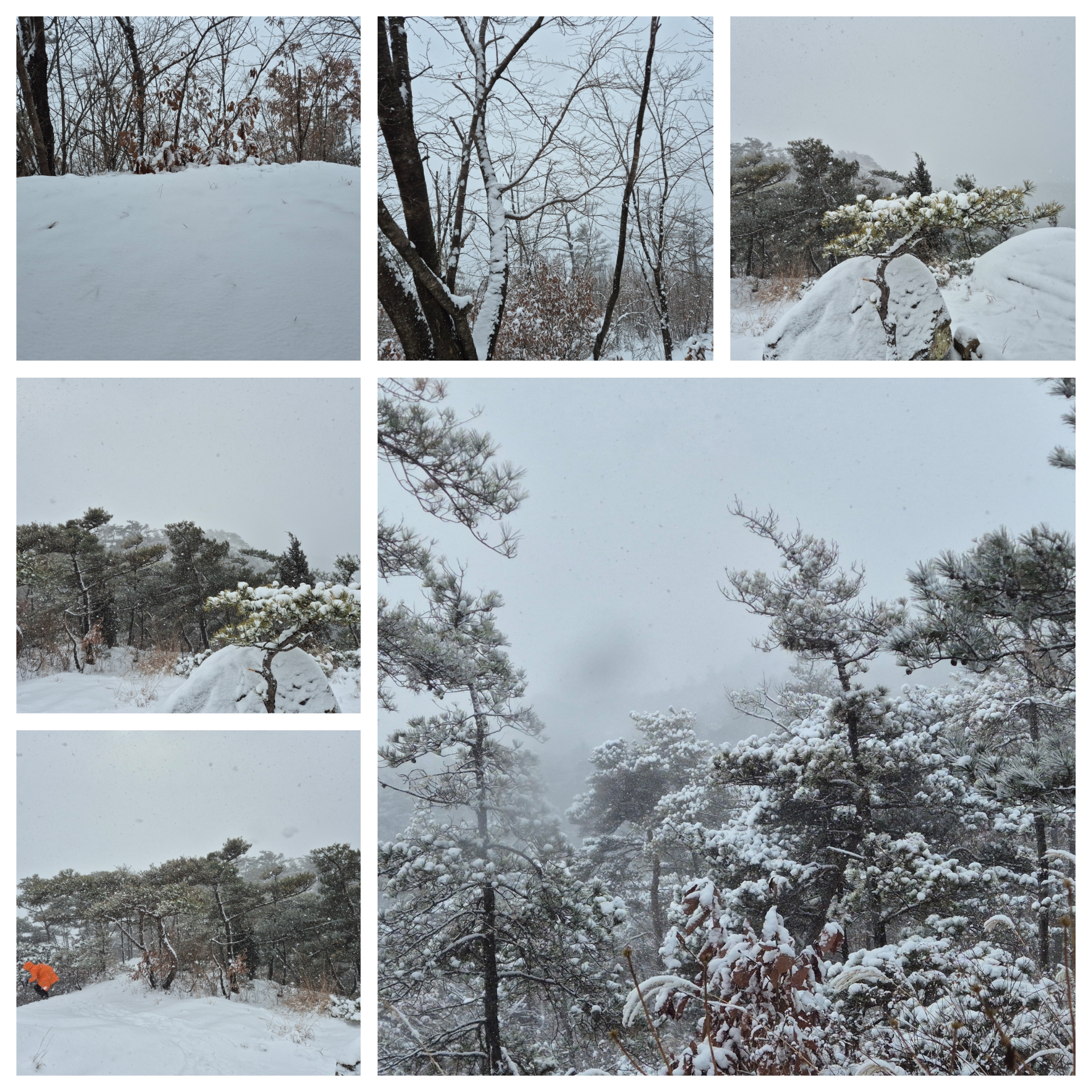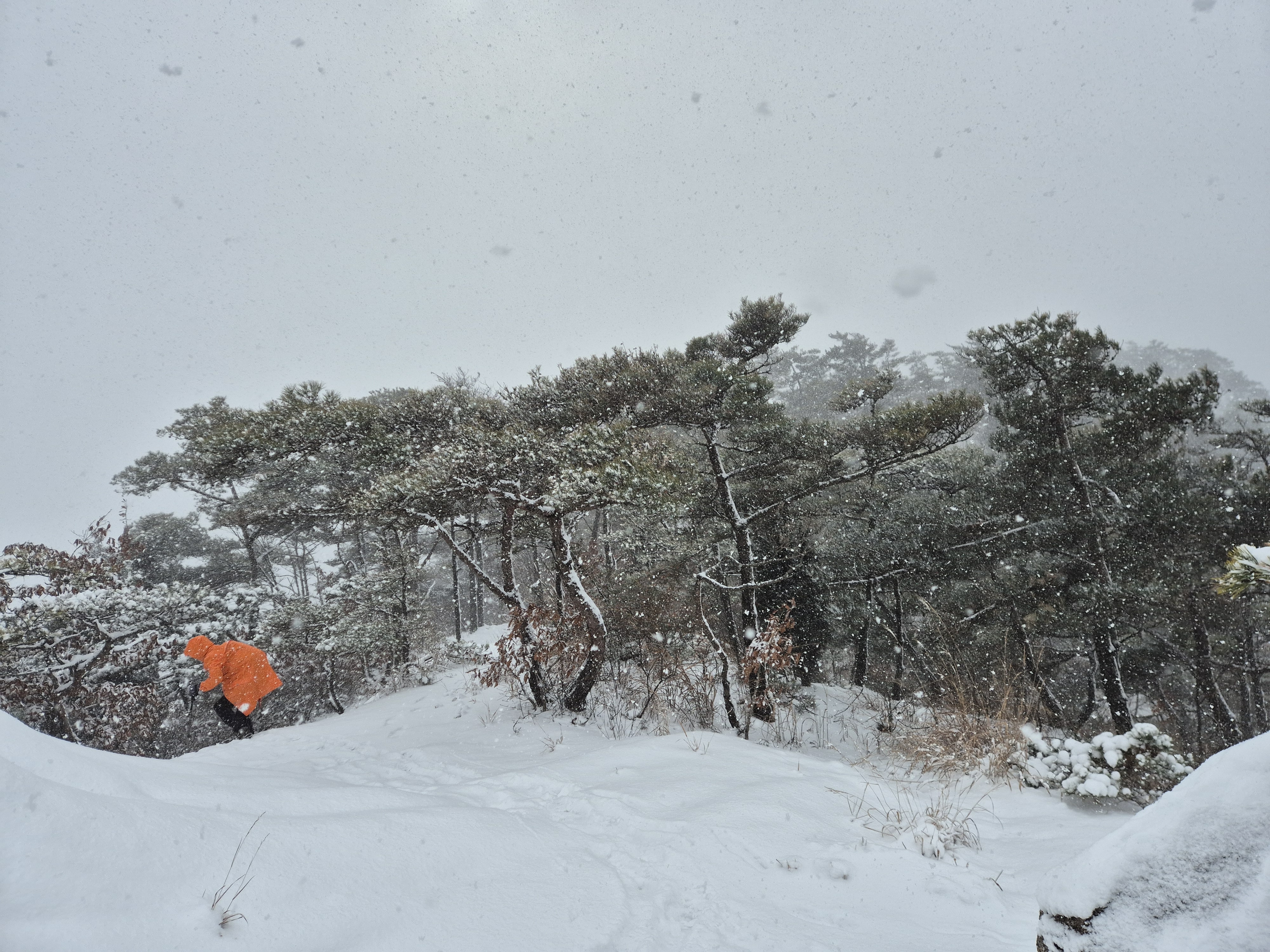 폭설과 한파예보의 눈길속에 우비를 입고는 산길을 오르는데,그래도 눈길속에