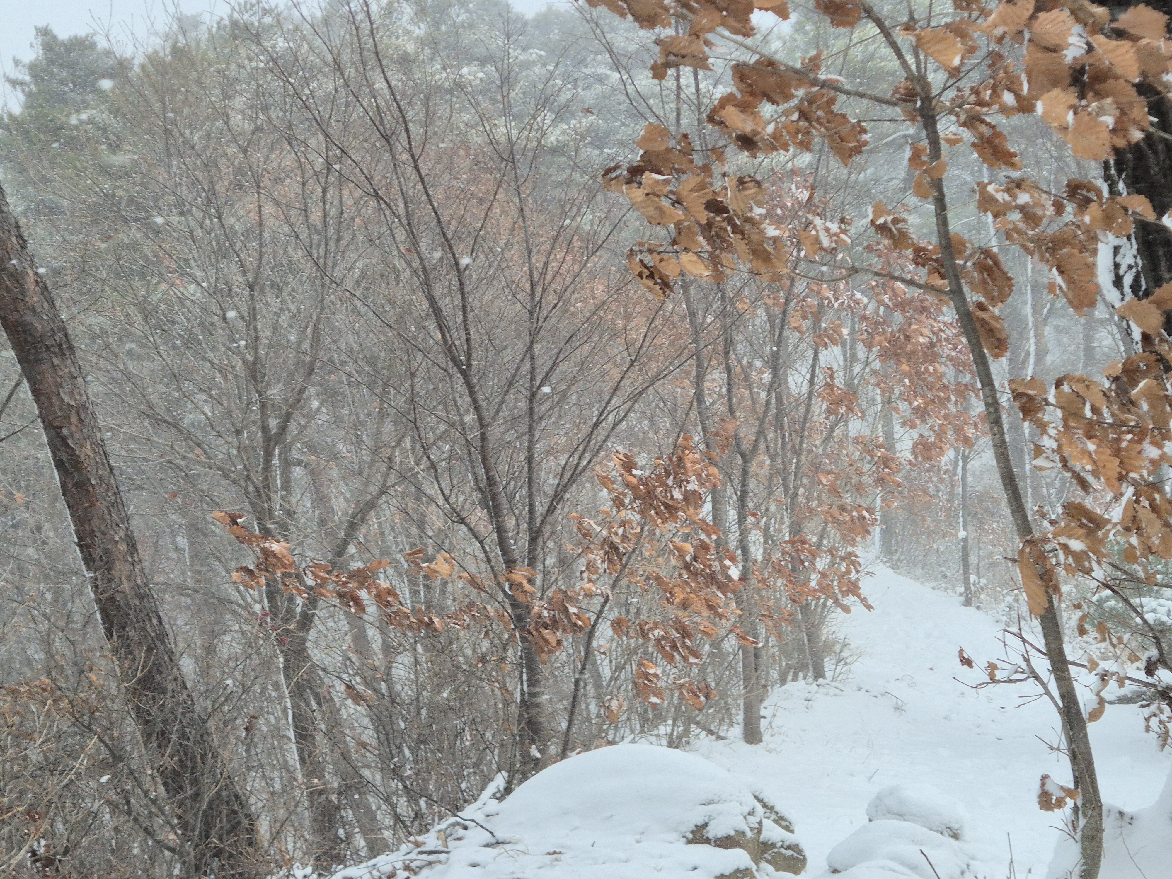 폭설과 한파예보의 눈길속에 우비를 입고는 산길을 오르는데,그래도 눈길속에