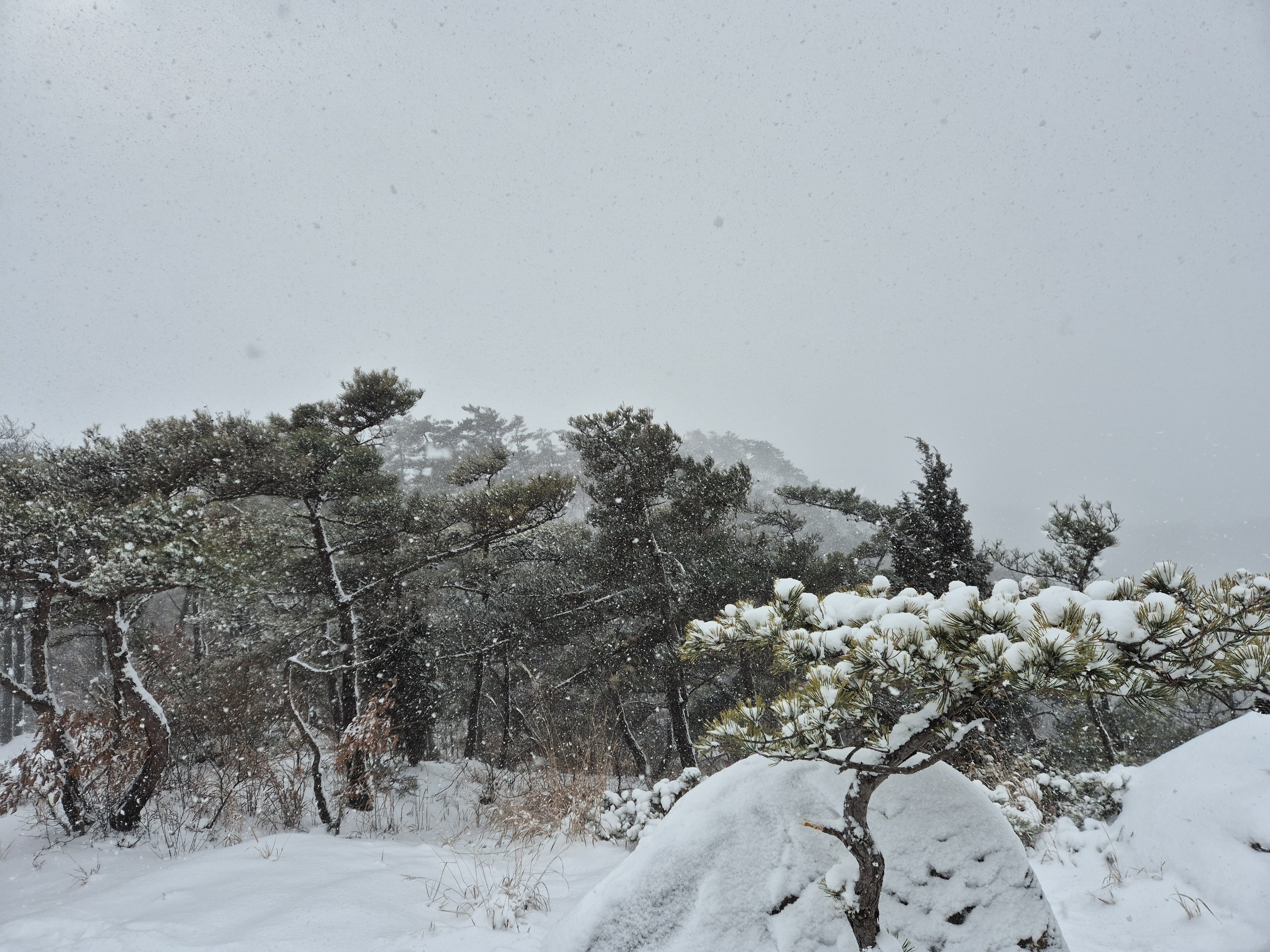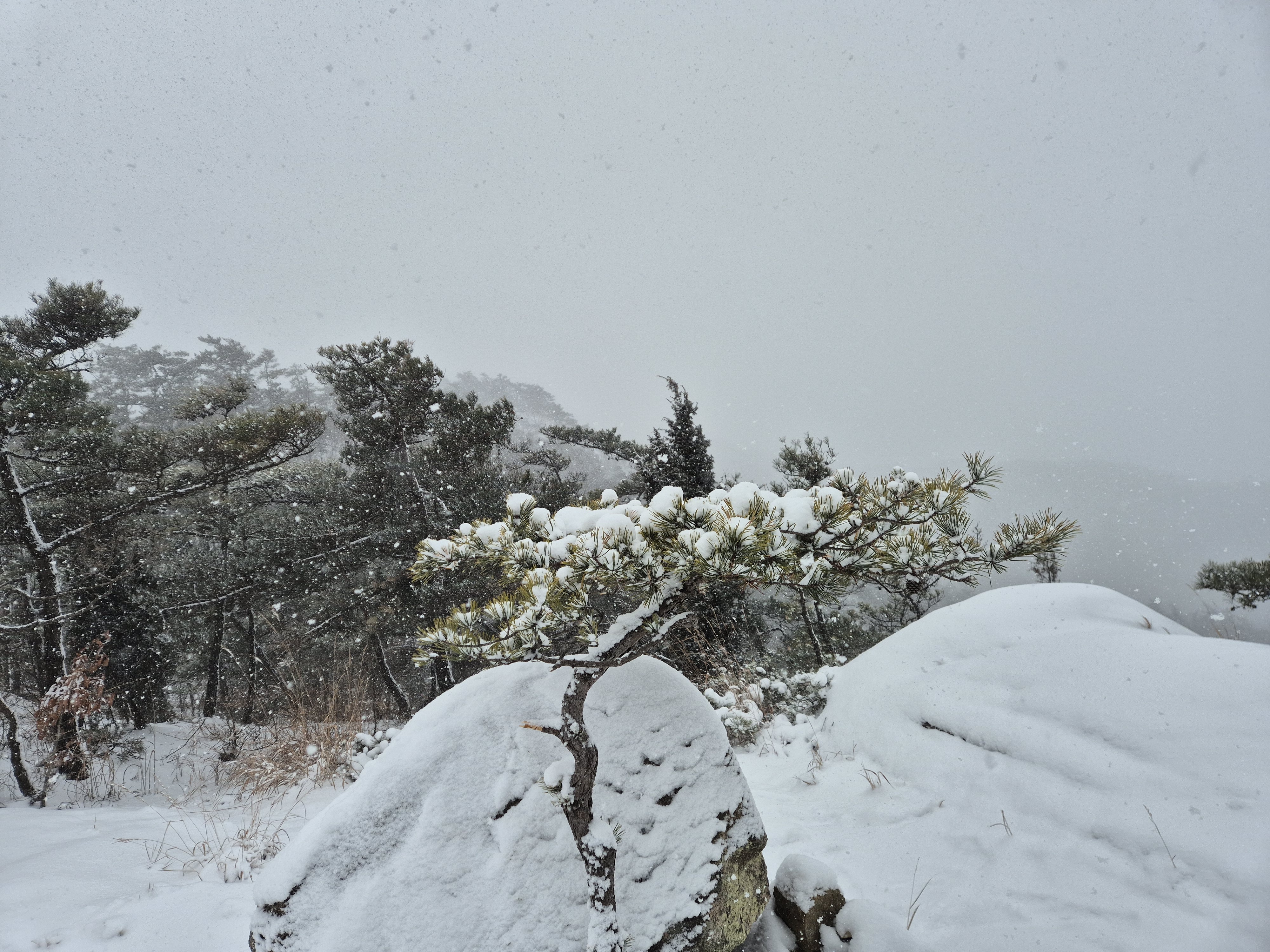 예보대로 폭설인지 눈덩이가 흩날리며 내리고 주변전망이 전혀 보이질않는다.