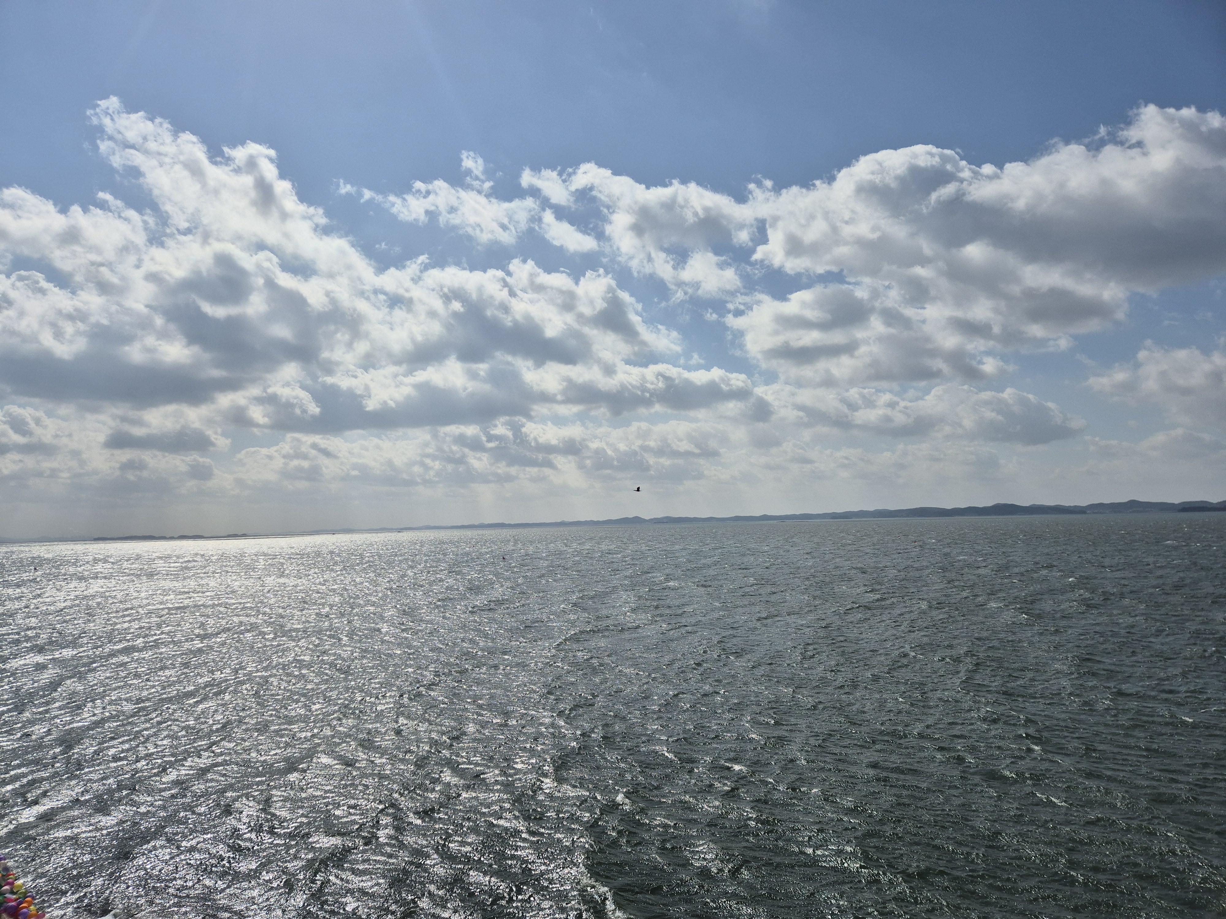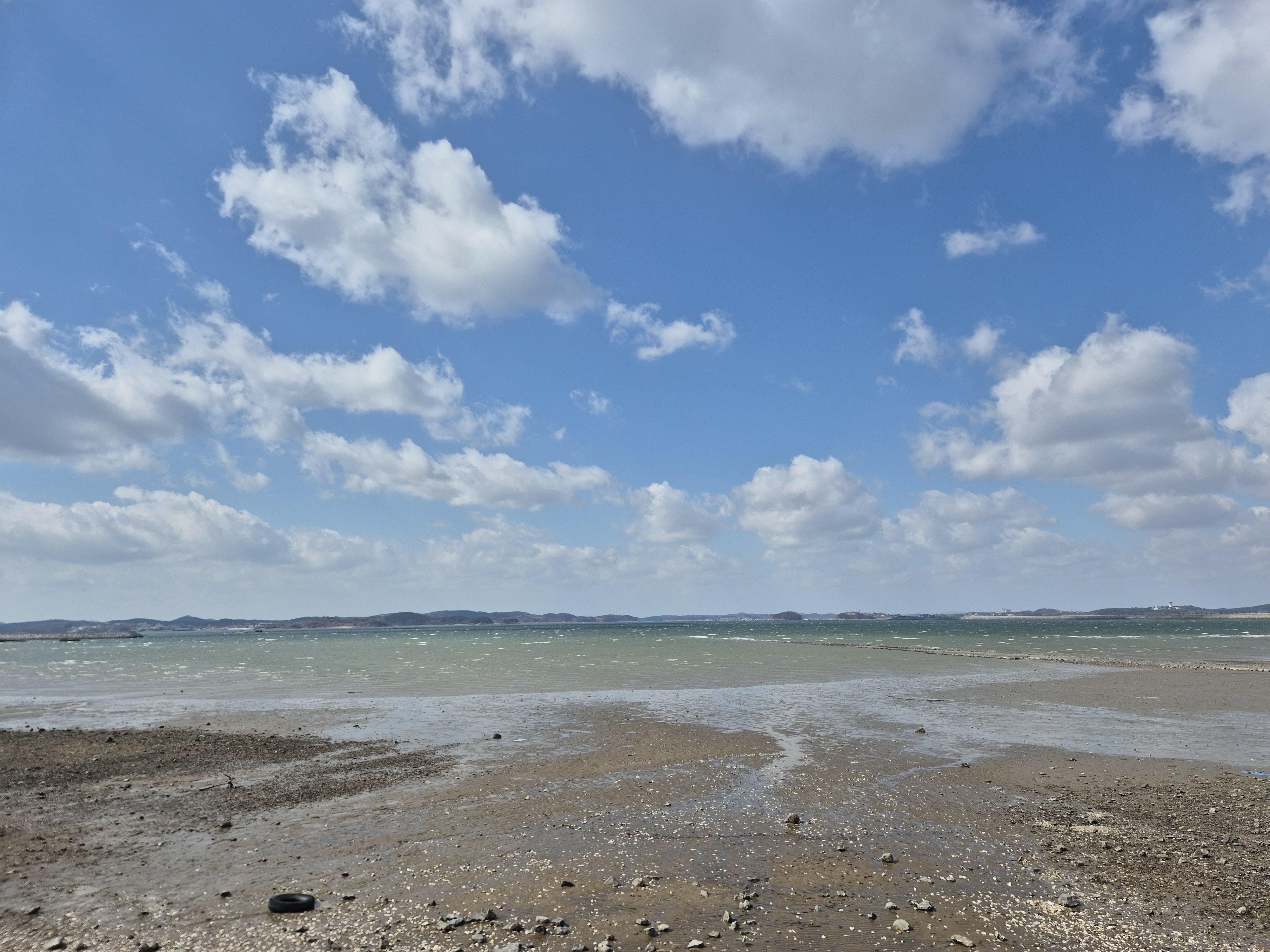 청명한 하늘에 바람이 불어 싸늘한 바다이다.