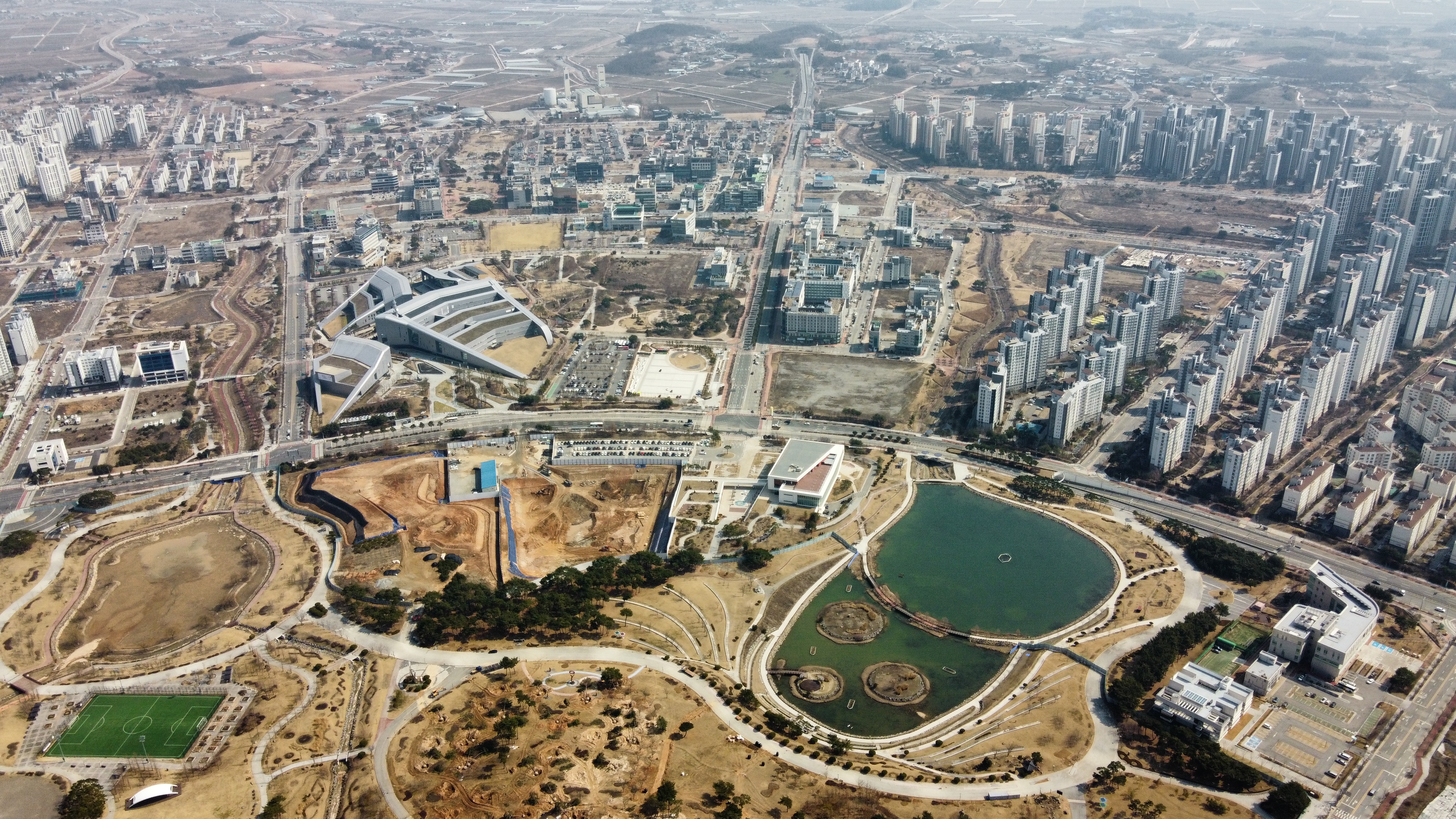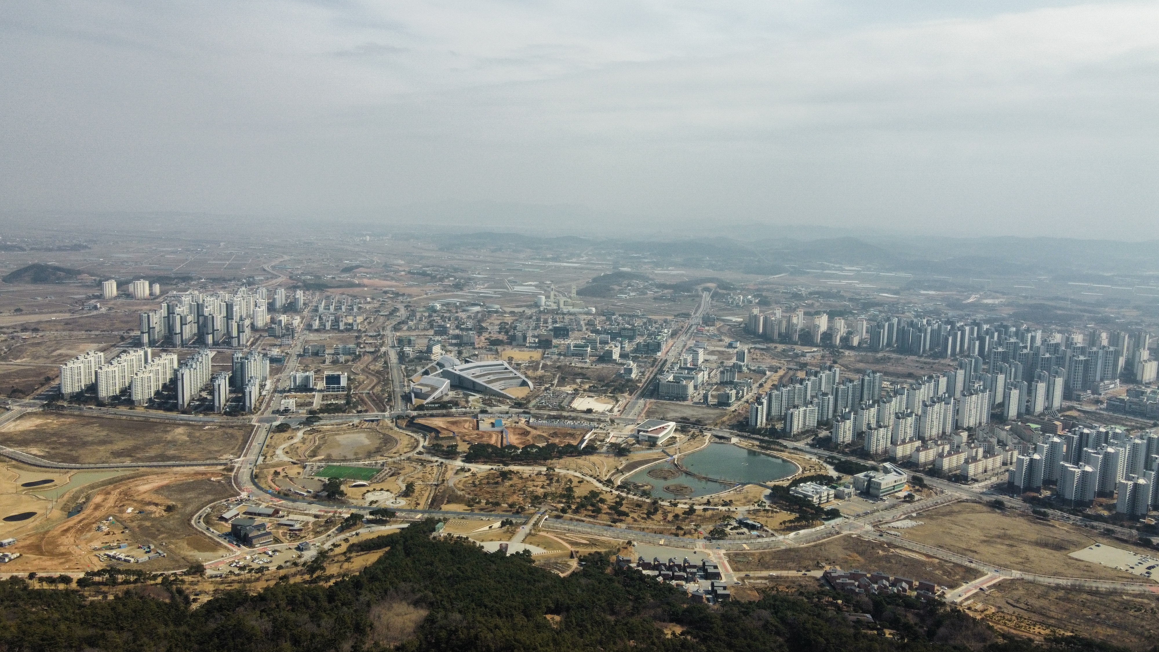 도서관 맞은편의 호수는 홍예공원의 정비공사로 물이 빠진것이 확연히 보인다.