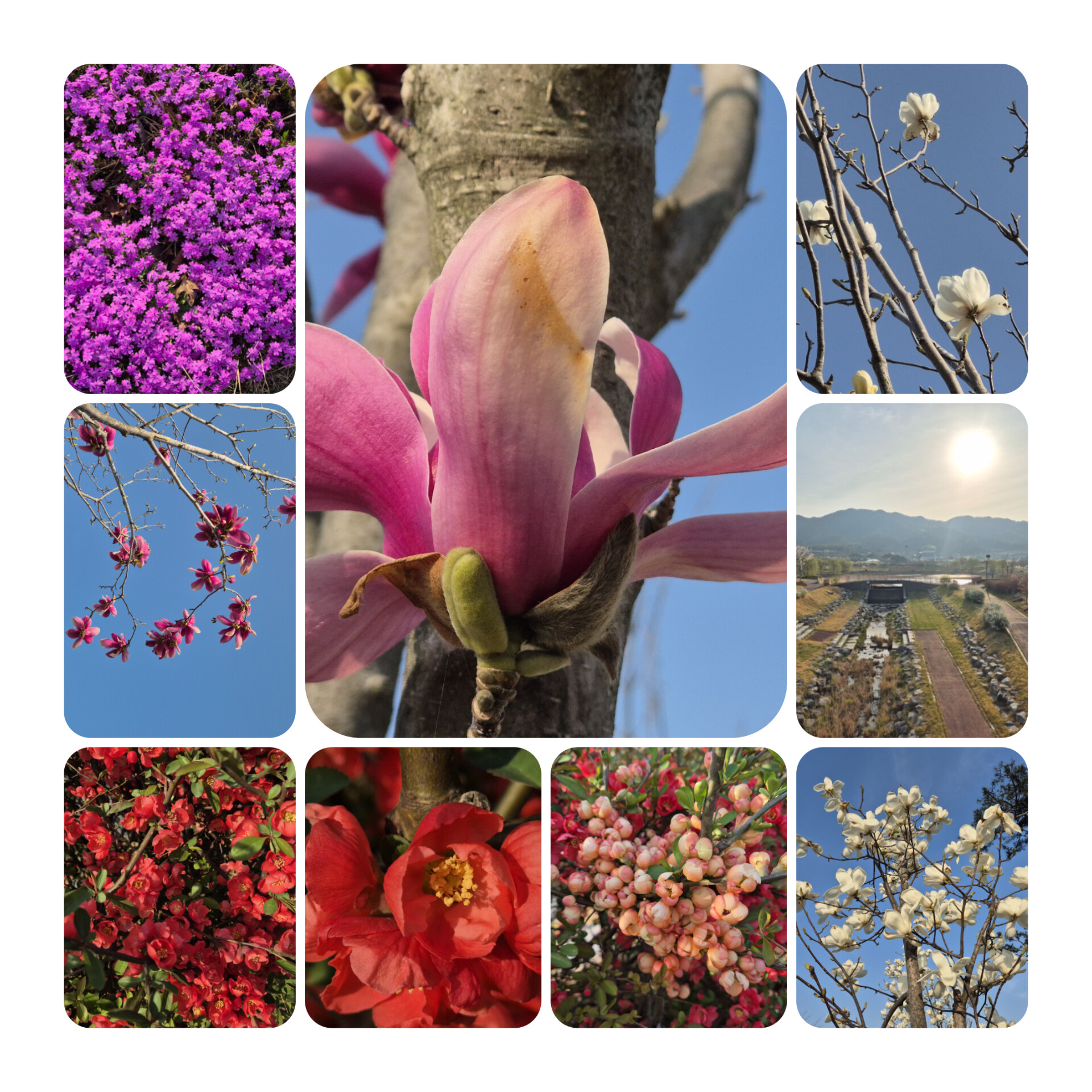 꽃잔디,자목련과 백목련,명자꽃,민들레등등...