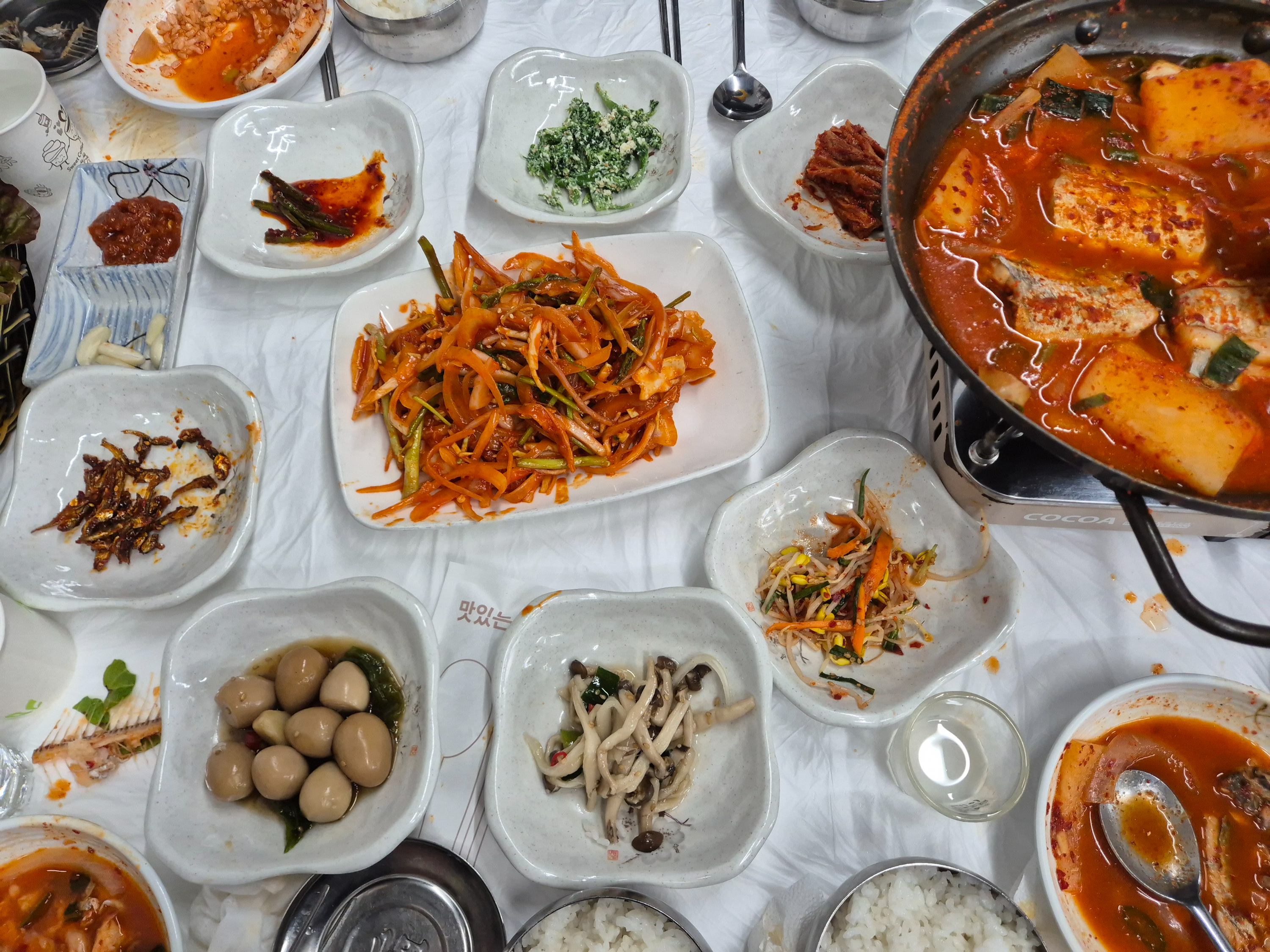 예약한 식당에서 멸치회무침과 갈치회,갈치조림으로 푸짐한 상을 받고는