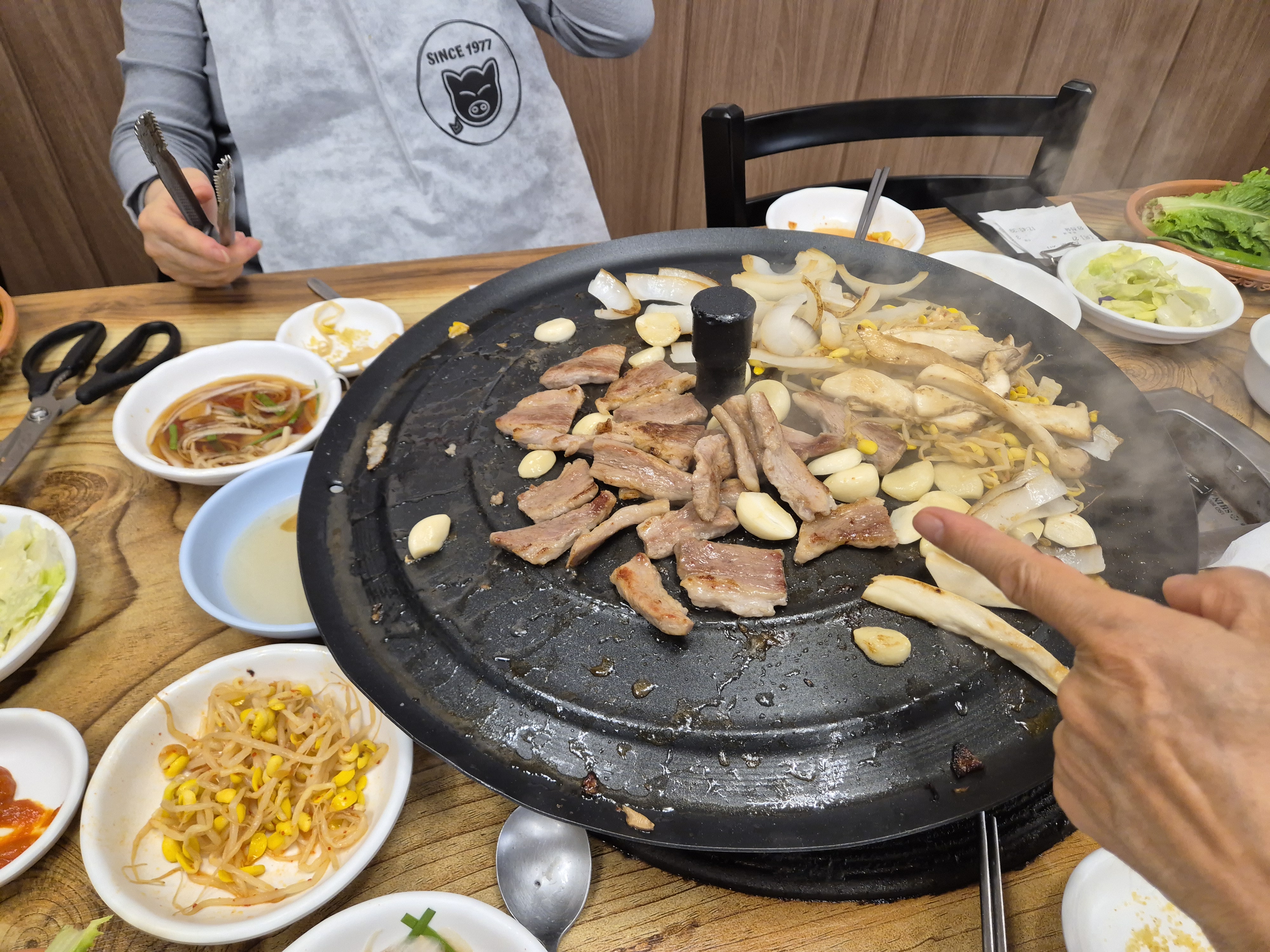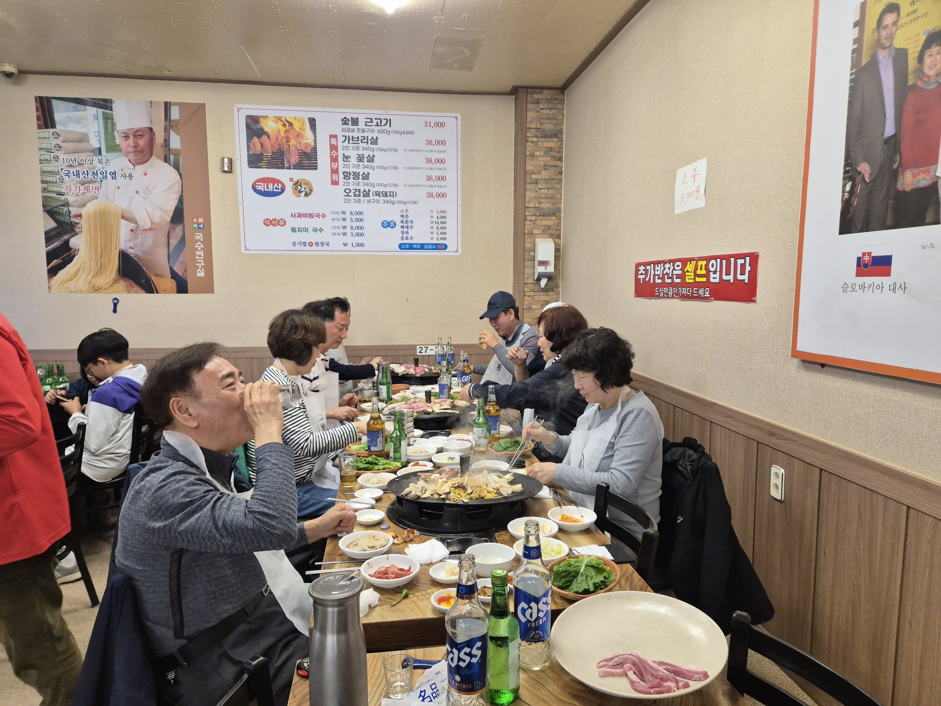 예약한 식당에 버스를 요청하여 타고 도착하여 맛있는 고기에 술한잔을 마시며