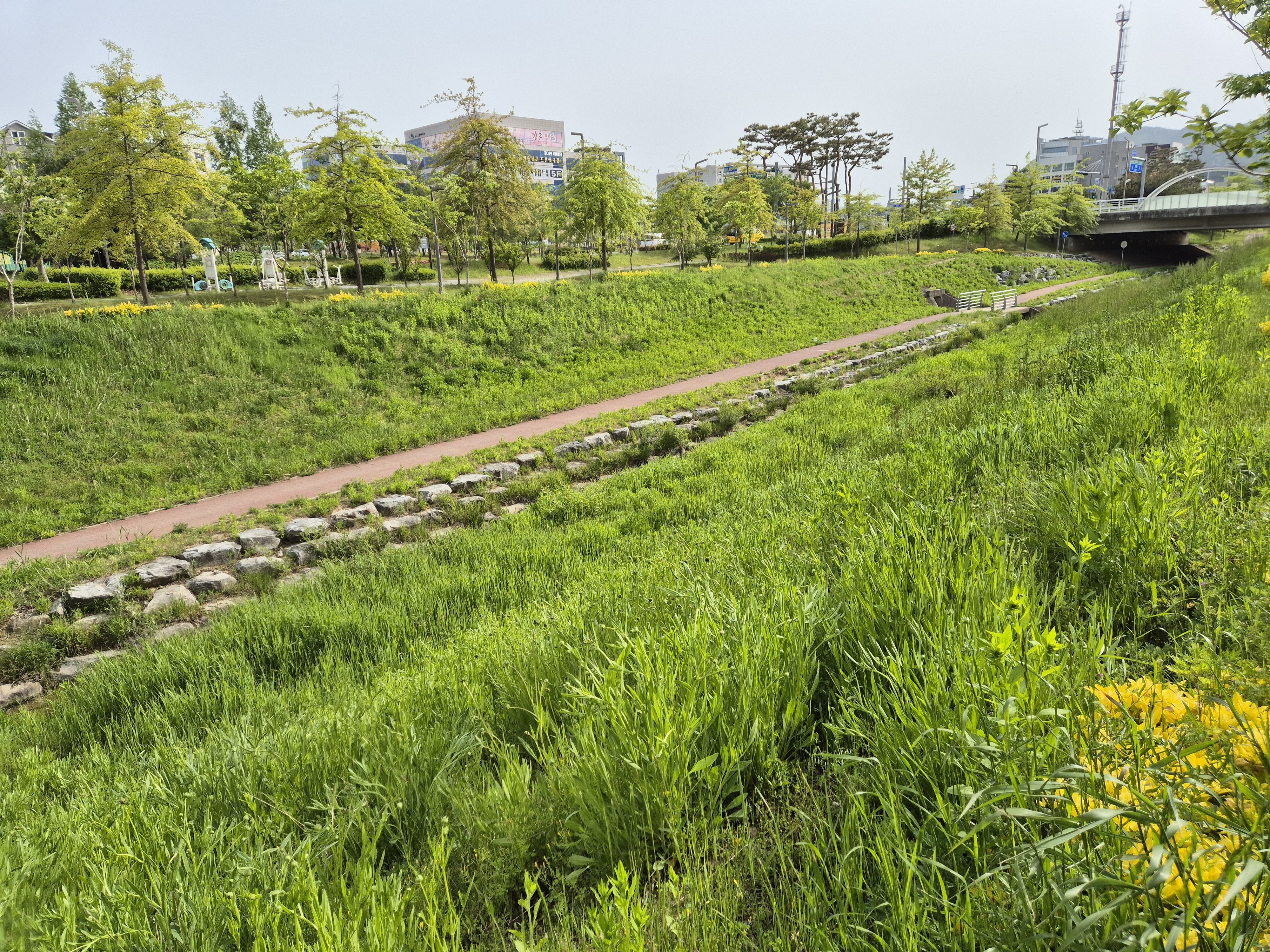 푸르른 벌판을 상쾌하게 바람을 맞으며 걷노라면,산책길옆으로는 개울물이 소리를내면서 흘러간다.