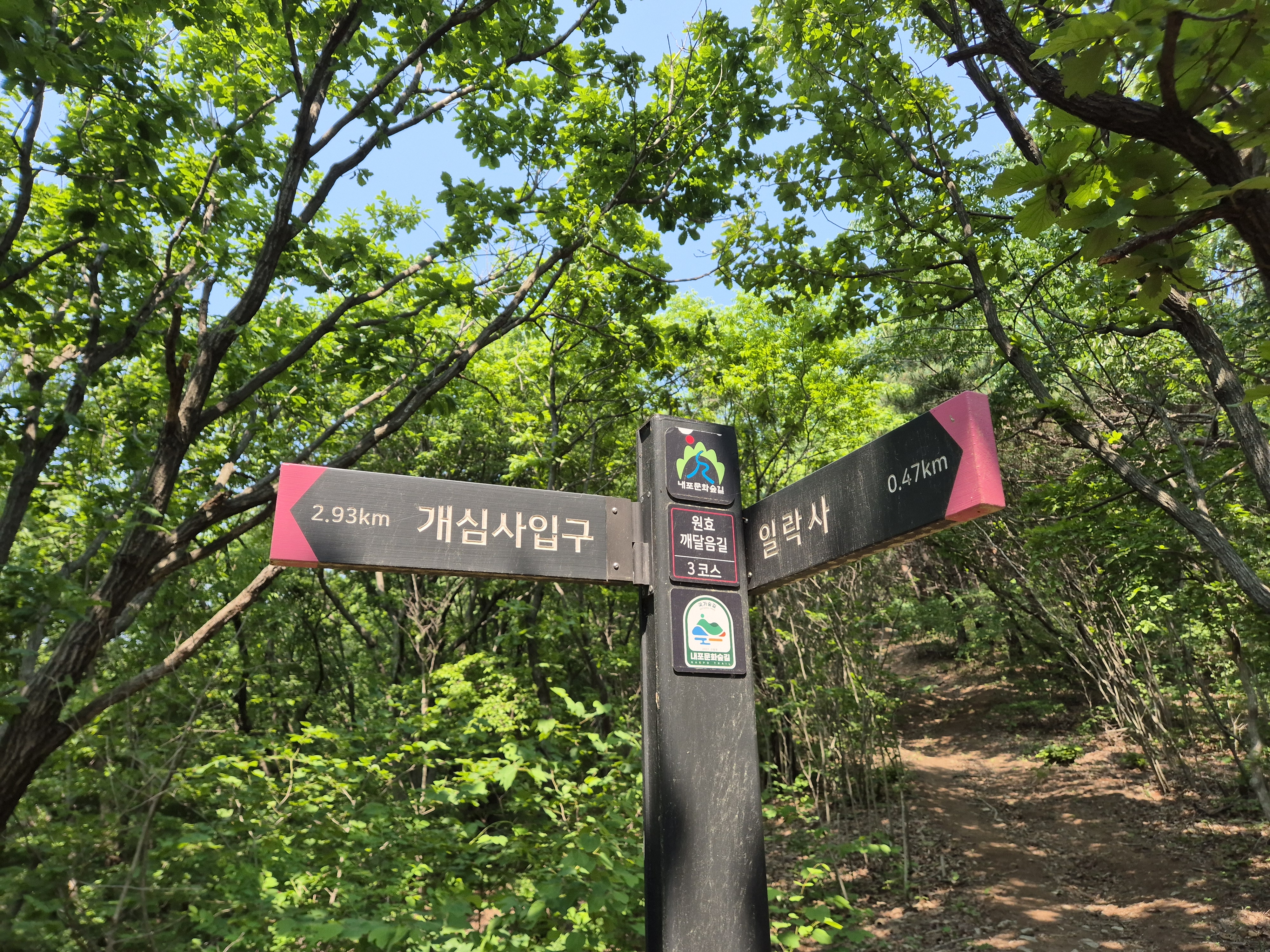 3키로정도 걸으니 이정표가 나오는데 일락사와 개심사표지판이다.