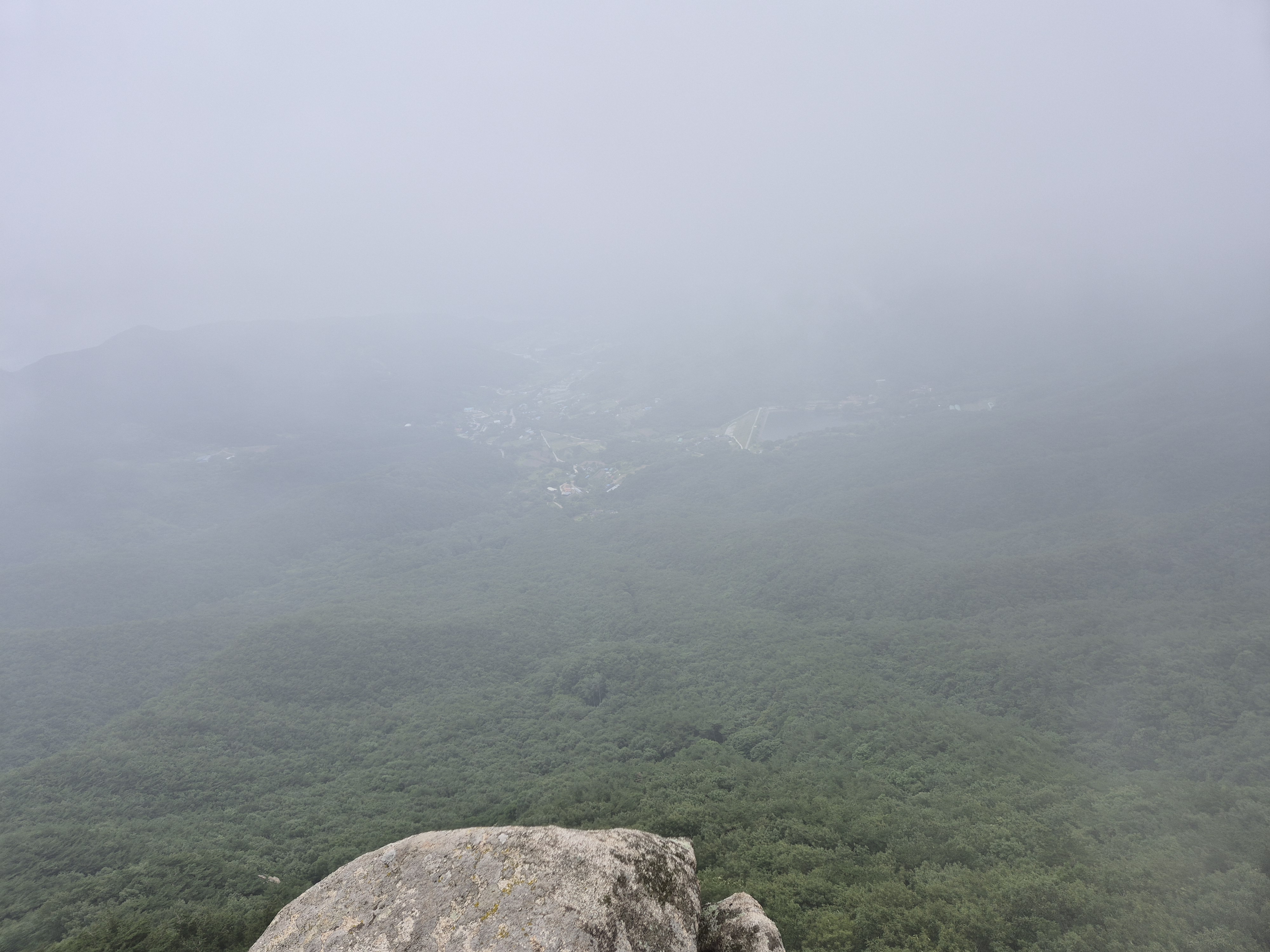 어렵게 쉬흔길바위에 올라서니 발아래만 조망될뿐 주변은 안개로 가려있다.