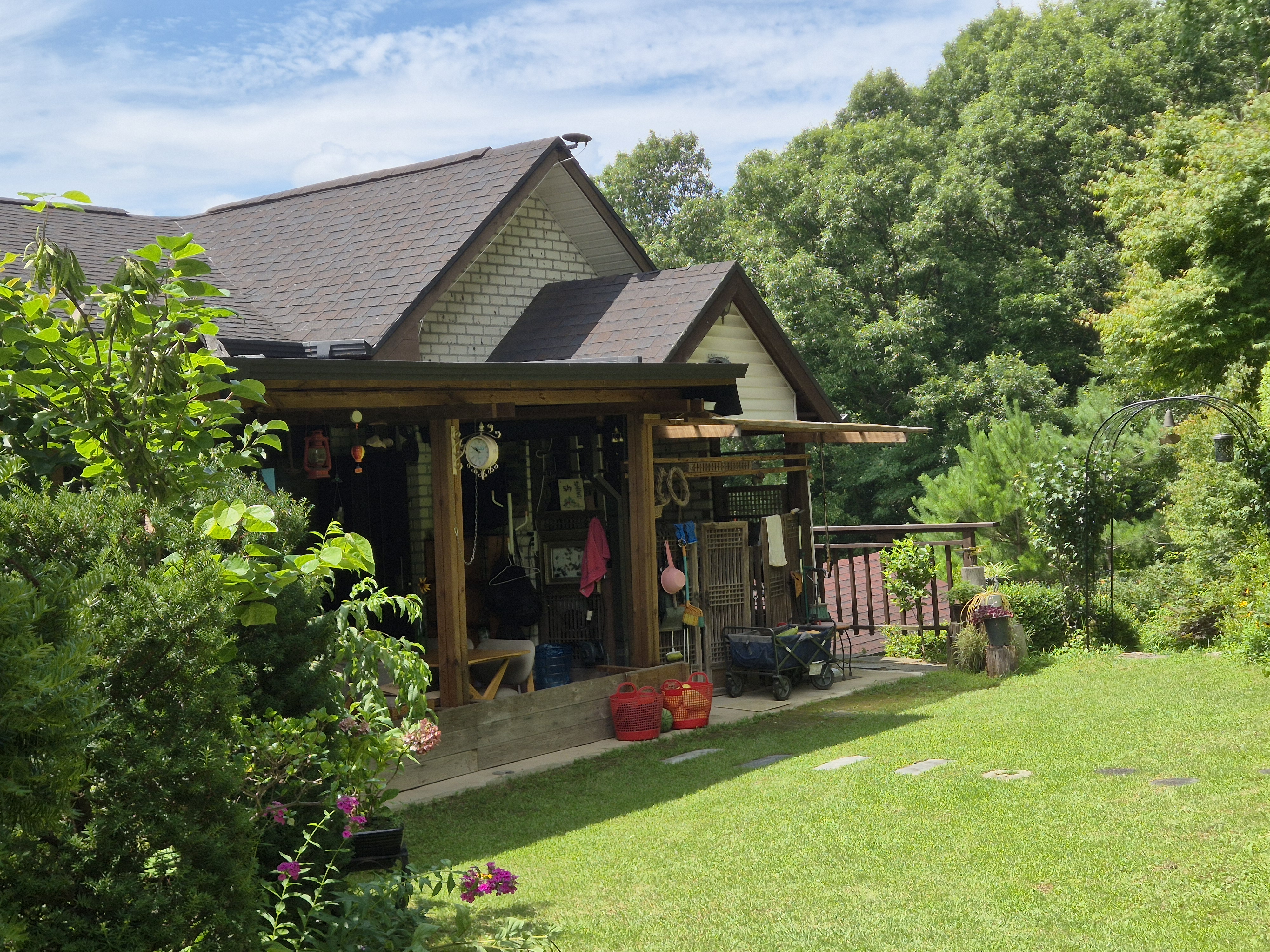 넓은 대지에 잔디정원과 농구장,나무위 쉼터등 아기자기하고 솜씨있게 지은 집을 둘러보고는