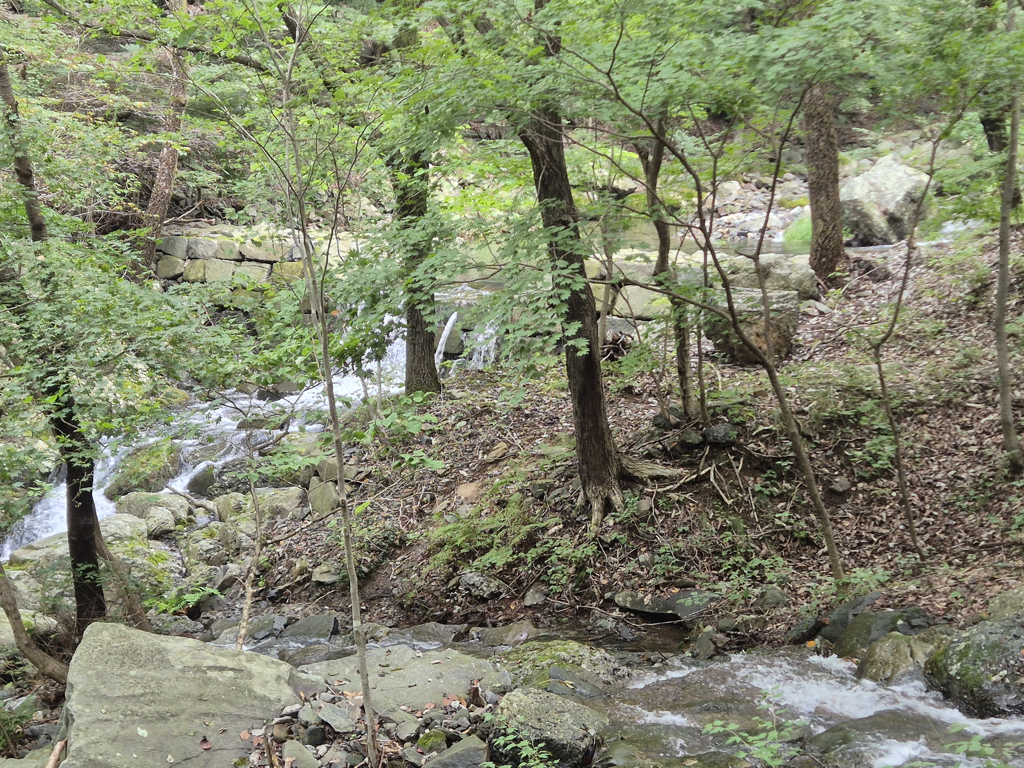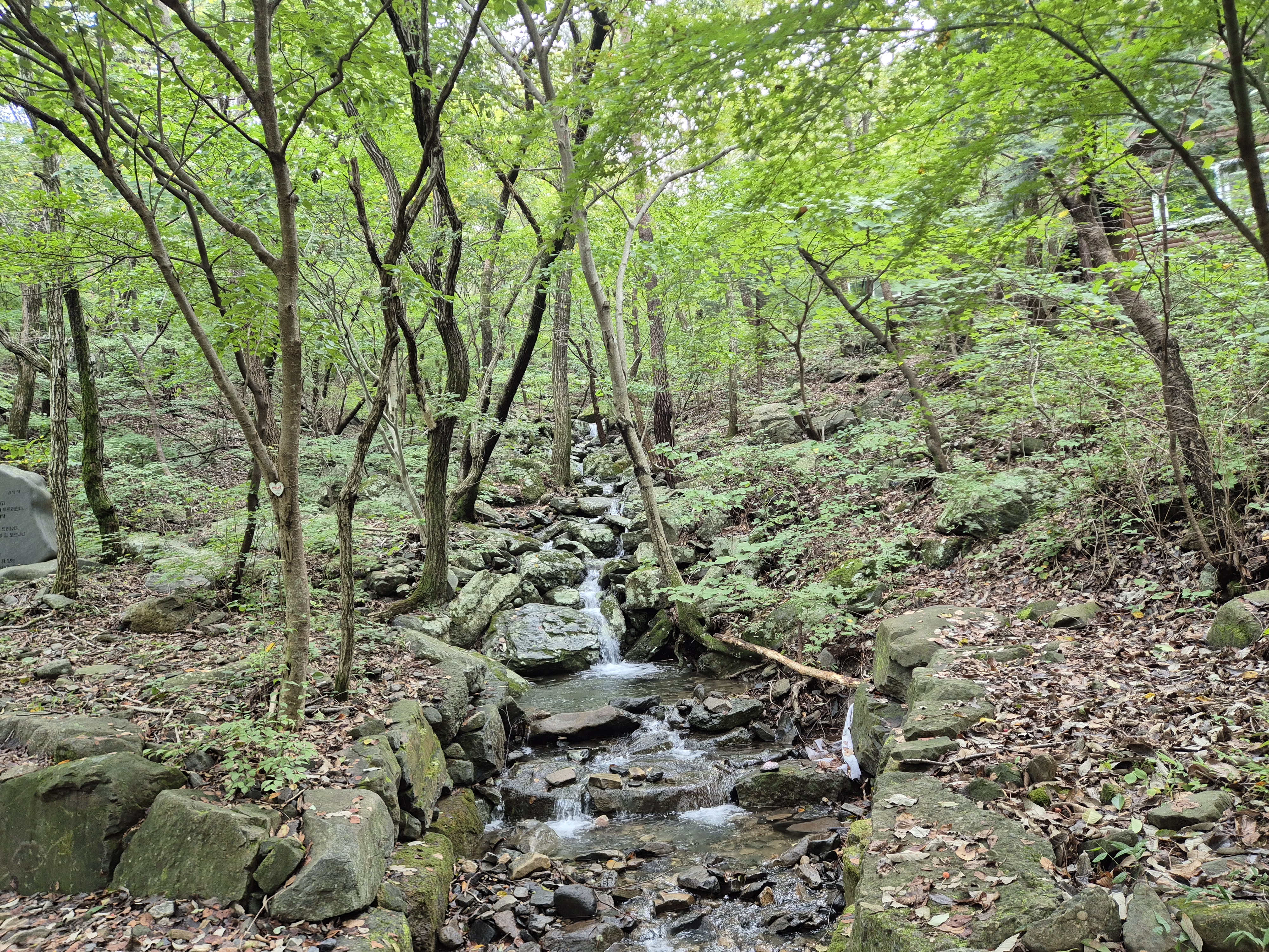 어제내린비로 계곡에는 물이 소리내어 흐르고 흐린날씨이나